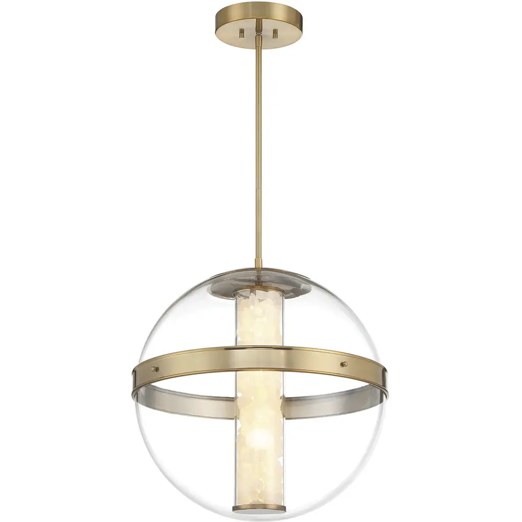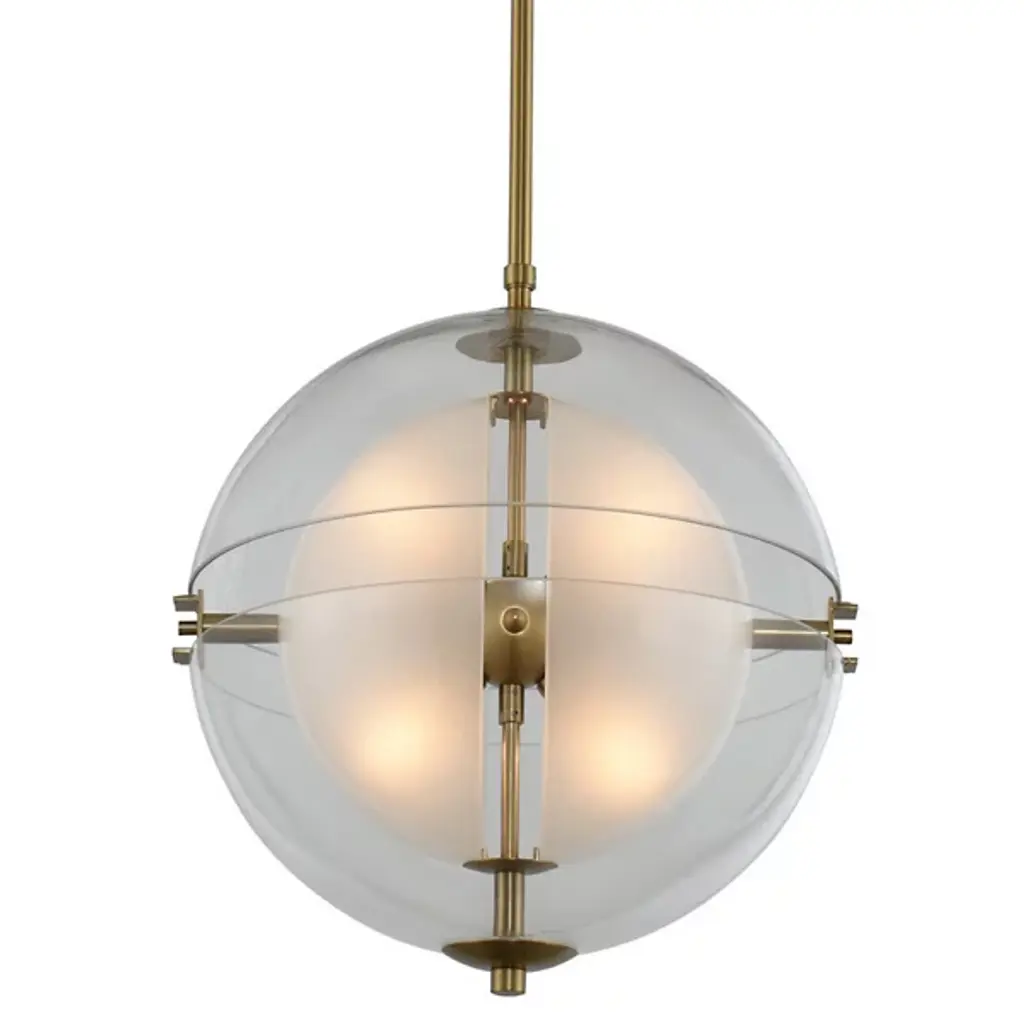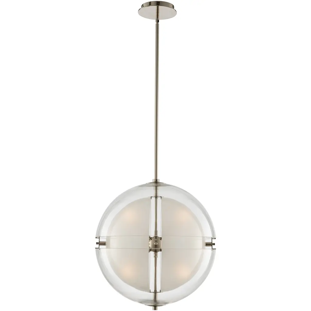 The Sussex Pendant by Kalco Lighting is a contemporary addition to your home with some geometrical flair. Casting an even layer of light on surroundings, a clear hemisphere glass shade is layered around a frosted one, each with an open-split composition. Simple and smooth metal rods support this design and add some mid-century modern flair with a beautiful finish and a central spherical accent that keeps this pendant cohesive and handsome.