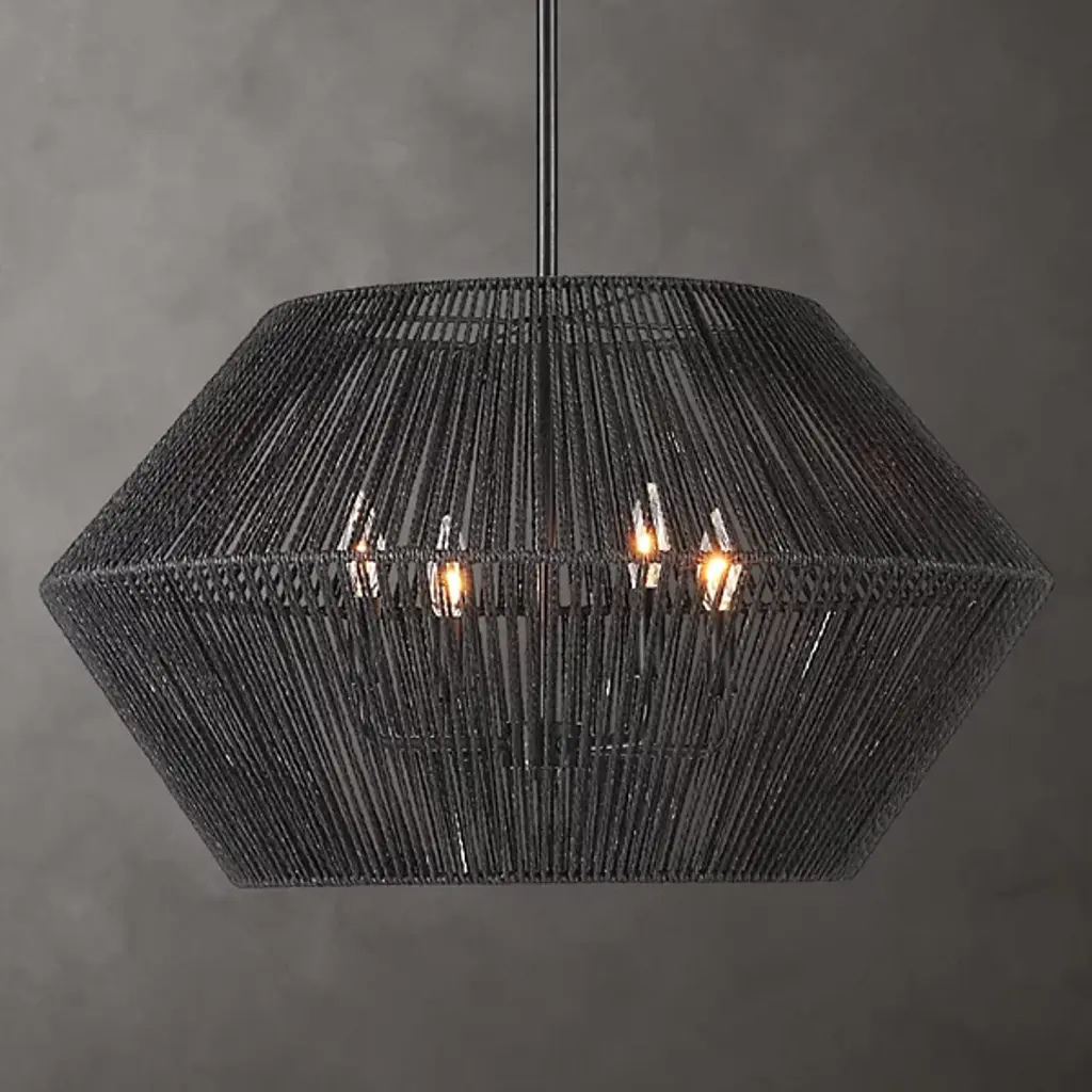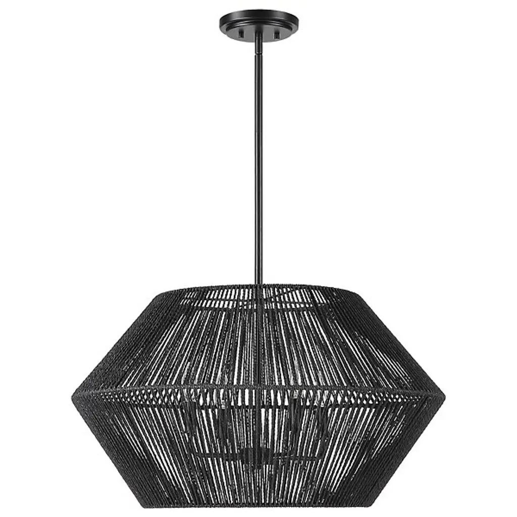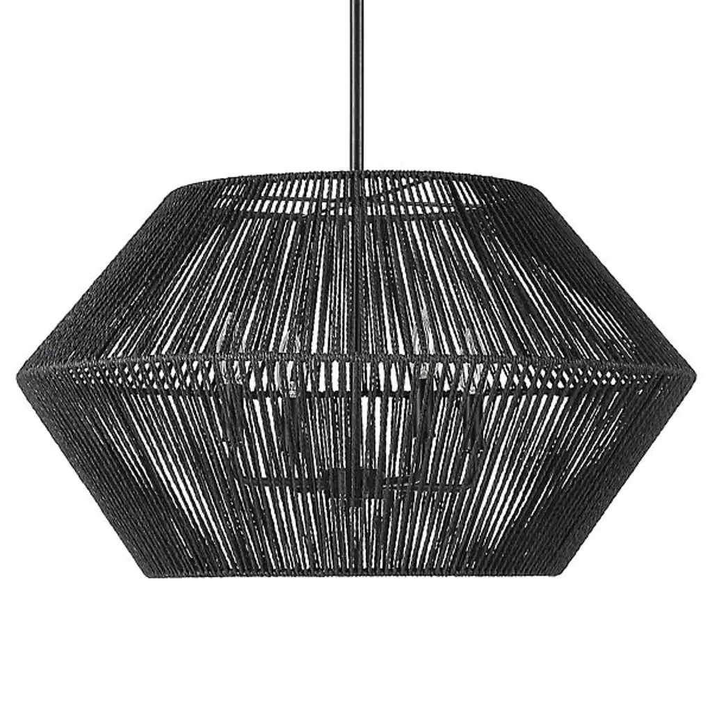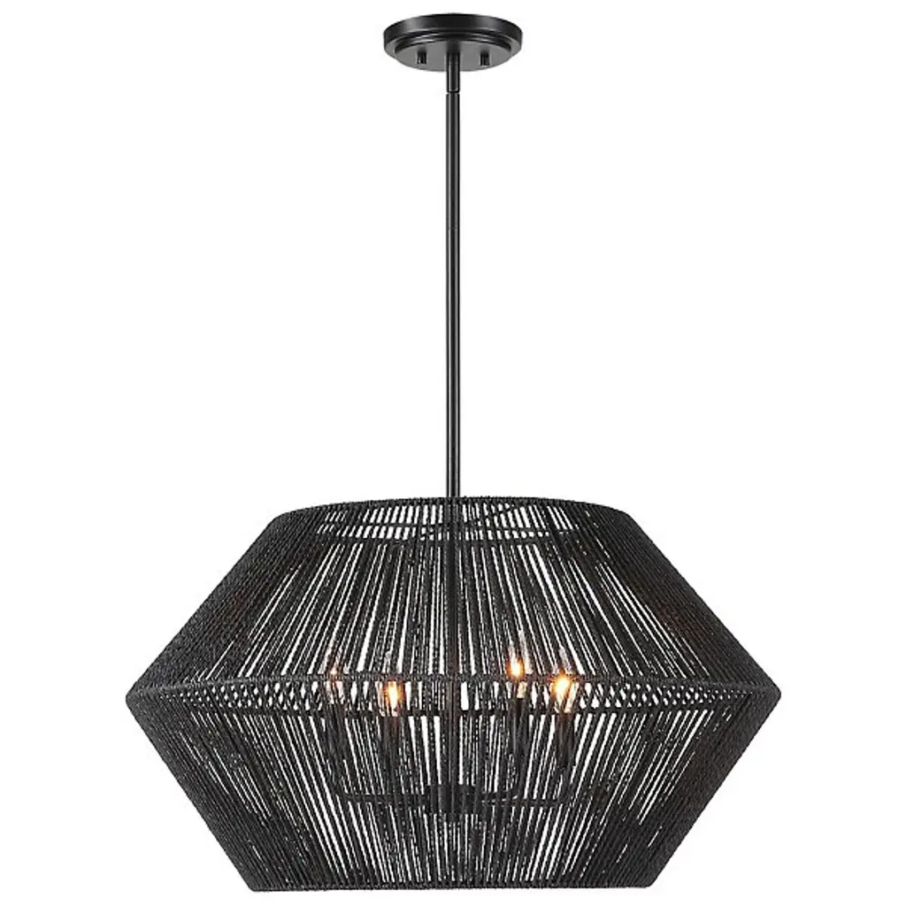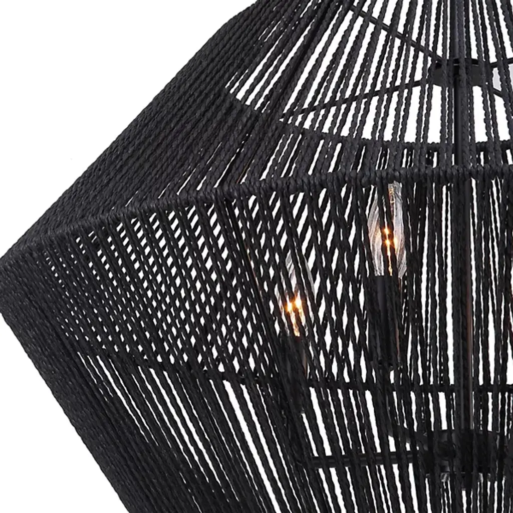 The Suva Pendant from Uttermost features a shade crafted from natural rope, meticulously hand-wrapped and dyed in an elegant black. The matte black finish enhances its adventurous yet sophisticated appeal, making it a striking addition to any decor. It has four 60-watt maximum candelabra sockets (bulbs not included). The fixture includes a 15-foot wire, three 12-inch stems, and one 6-inch stem, providing multiple options for adjustable installation to perfectly suit your space.