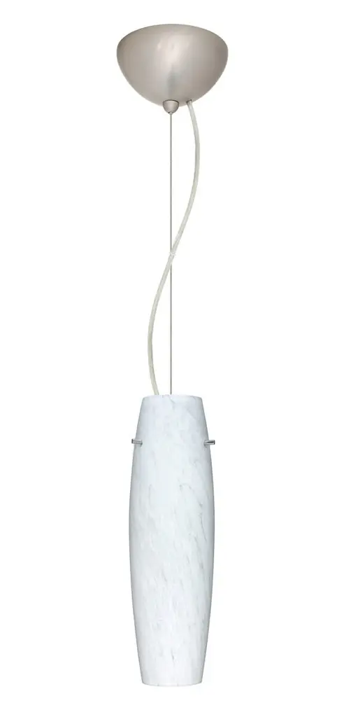 The Suzi is a slender yet shapely handcrafted glass with a open top and bottom. Our Carrera glass is a classic yet modern décor that gives off a soft white light. Clear molten glass is rolled in alabaster powder like frit, and then blown into shape with a semi-clear frosted white inner finish. This décor is created by rolling molten glass in small bits of white called frit. The smooth satin finish on the clear outer layer is a result of an extensive etching process. This blown glass is handcrafted by a skilled artisan, utilizing century-old techniques passed down from generation to generation. Each piece of this décor has its own artistic nature that can be individually appreciated. The cable pendant fixture is equipped with a 10' silver aircraft cable and AWM cordset, and a dome monopoint canopy. These stylish and functional luminaries are offered in a beautiful Satin Nickel finish.