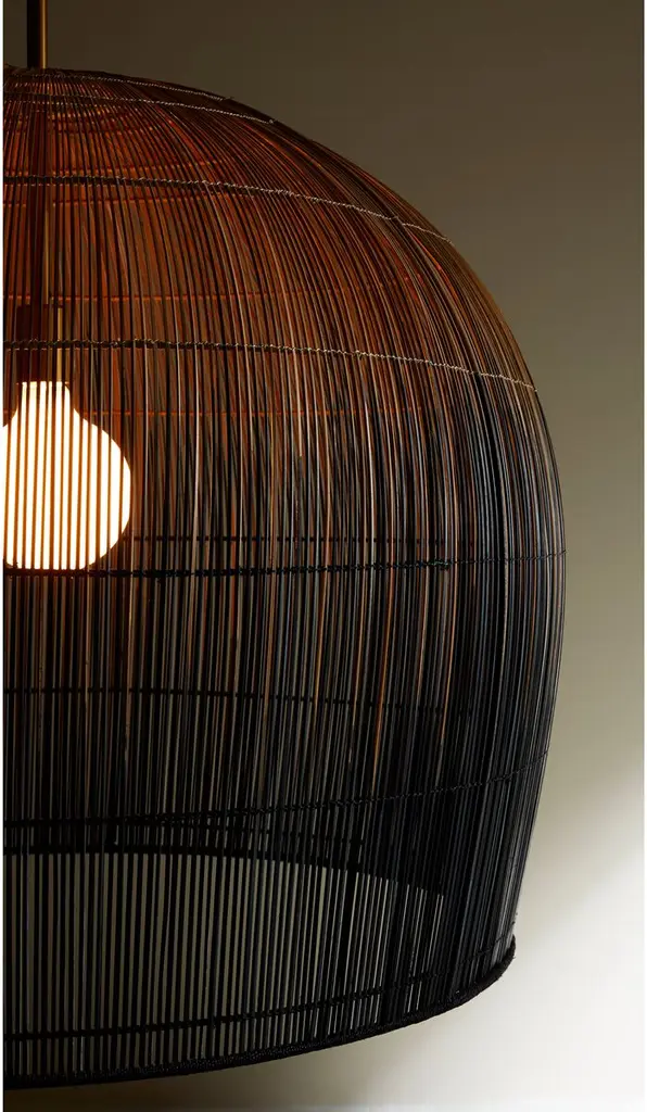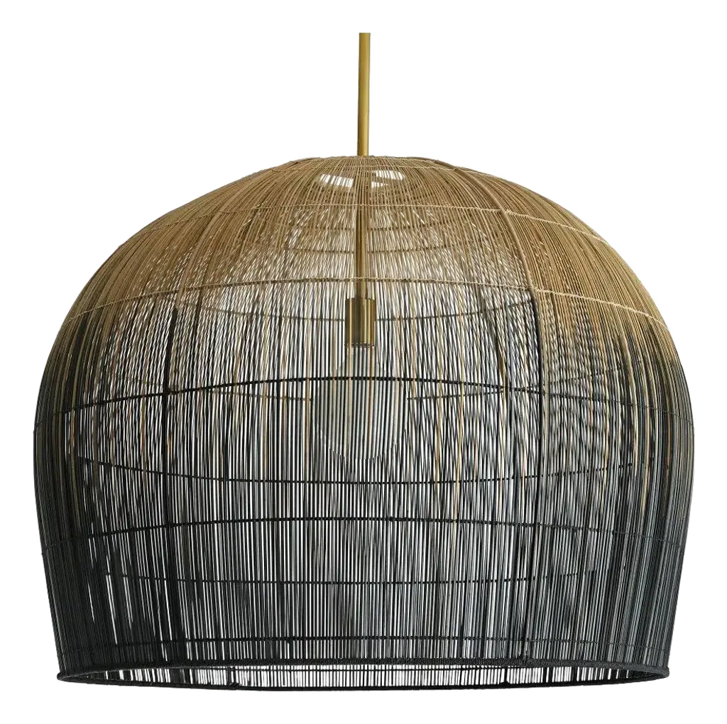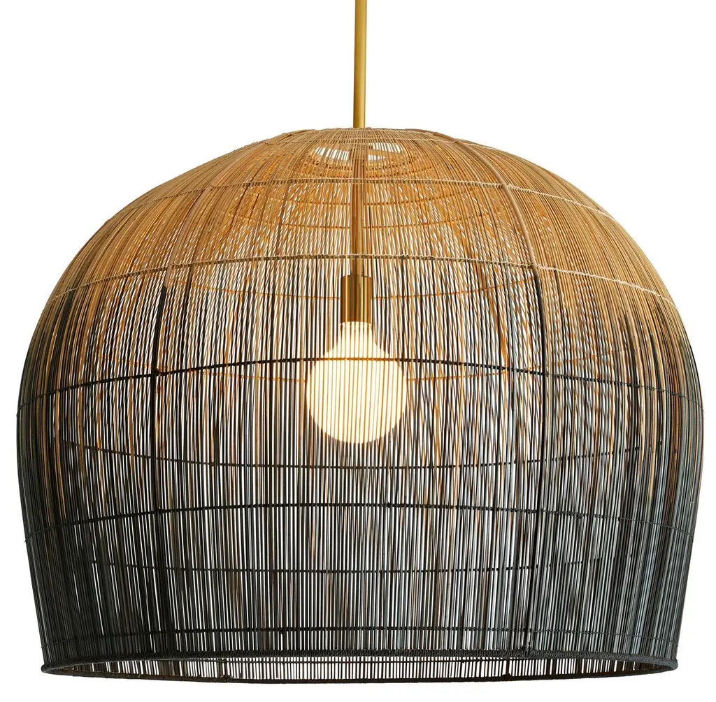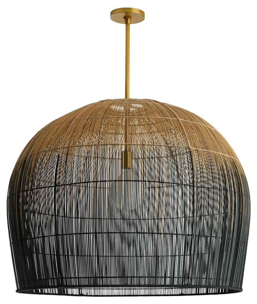 Handcrafted by artisans using ancient construction techniques, this bell-shape pendant is framed in steel and detailed with hundreds of thin buri sticks, a material derived from a palm tree in the Asian tropics, in a stunning ombré finish. We love displaying this pendant in multiples above a kitchen island or home bar. Due to the handmade nature of this piece, variations in color, tone, and pattern may occur. Hardwired.