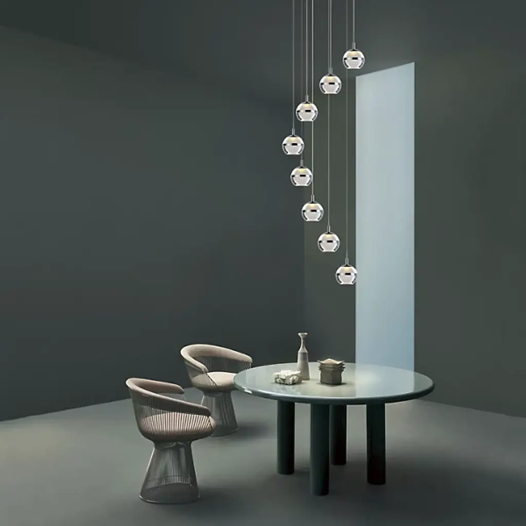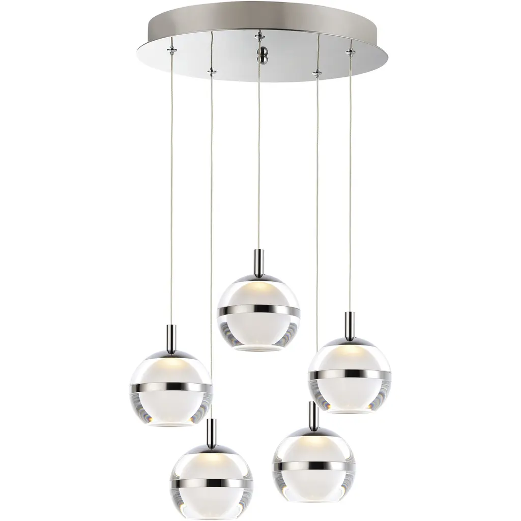 Scattered elegance scaled to suit. Each light suspended from the Swank LED Multi-Light Pendant by ET2 sports a layered motif with a frosted lens nested inside a transparent outer shell. Long-lasting LED technology makes this bold design low on both maintenance and energy consumption, while its chrome canopy and hardware fit a wide variety of décor motifs from retro to post-modern.