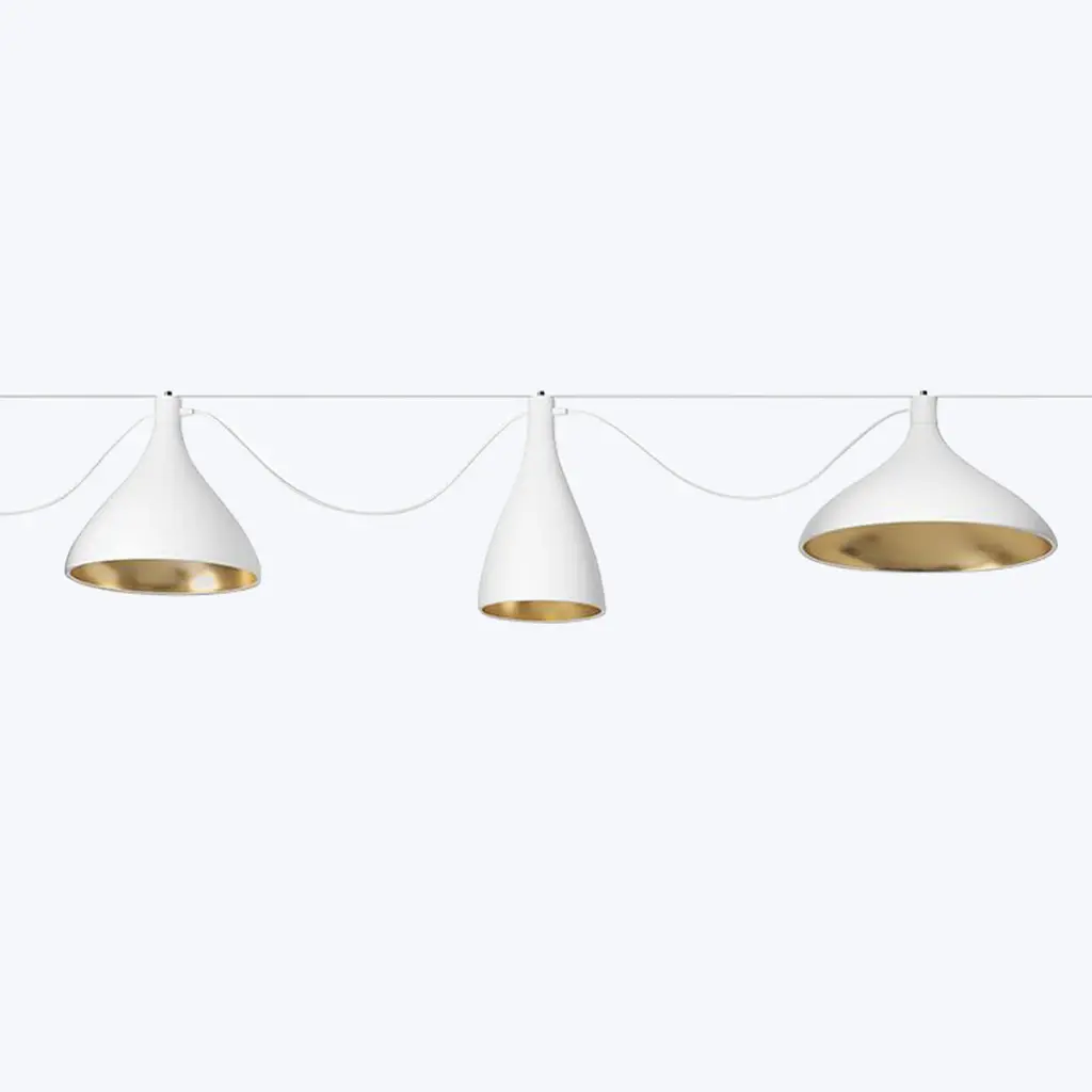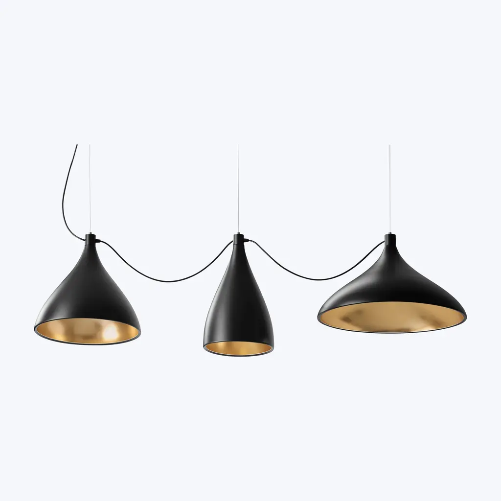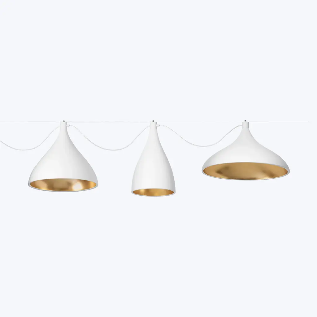 Elevated and infinitely flexible, Pablo’s Swell LED 3-Strung Pendants can be mixed and matched to create dynamic groupings. This elegant trio is crafted in spun aluminum and designed with fluid, undulating lines and radiant brass interiors. A sleek addition to contemporary and industrial spaces. Available in Standard and XL sizes. Choose from Black, Brass, and White finishes.