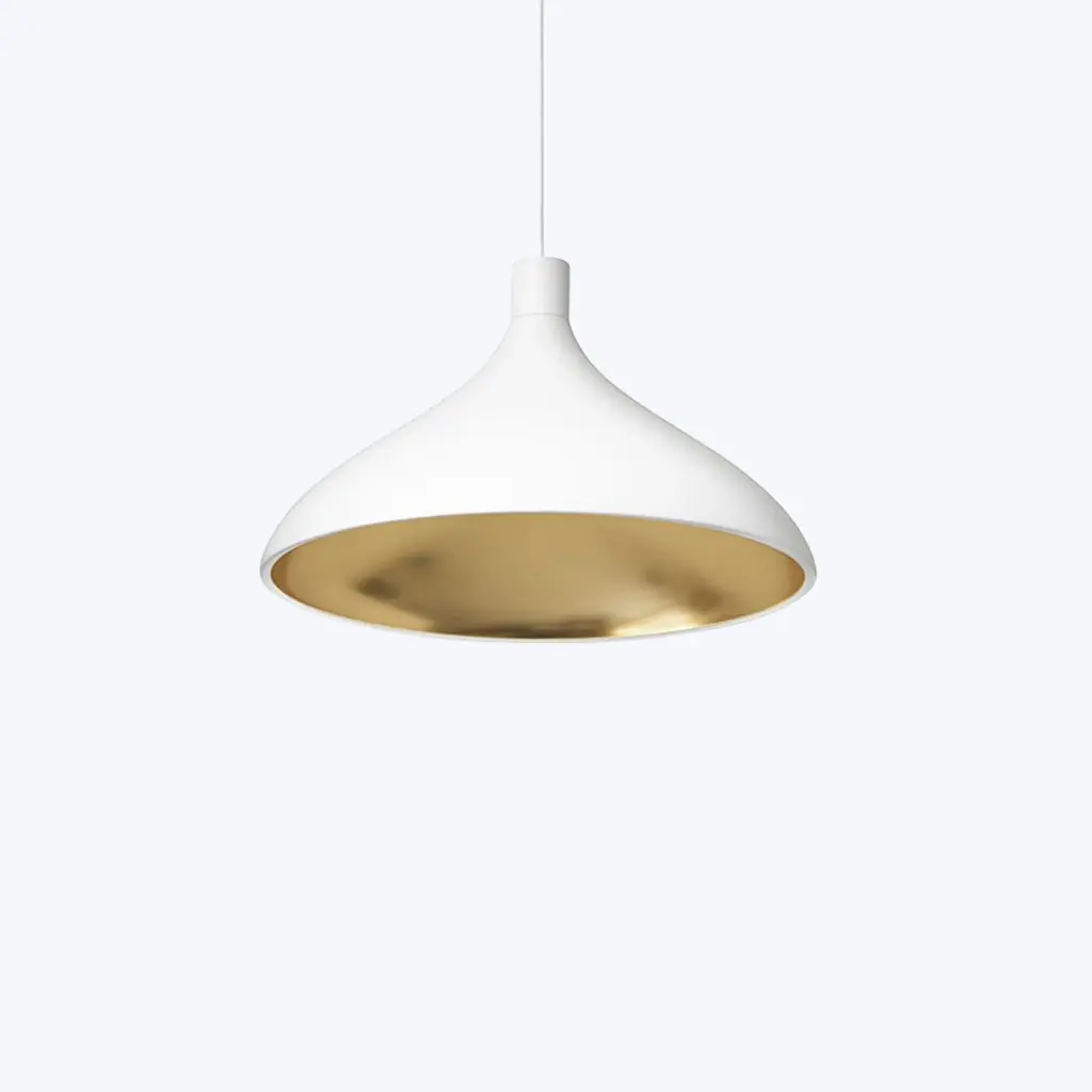 Elevate your interiors with the Swell LED Pendant by Pablo. Crafted in spun aluminum, this elegant fixture features fluid, undulating lines and a radiant brass interior. A sleek piece, perfect for contemporary and industrial spaces. Available in a wide variety of size and color configurations.