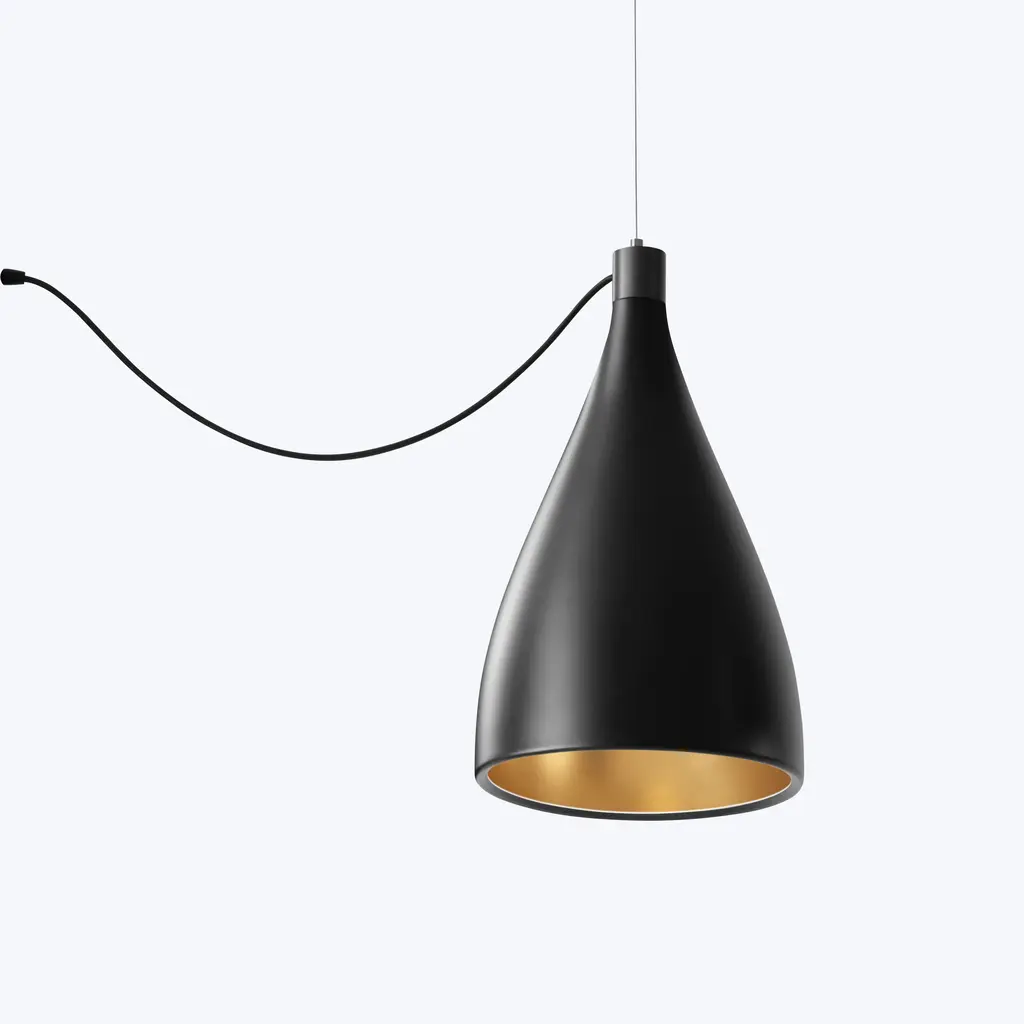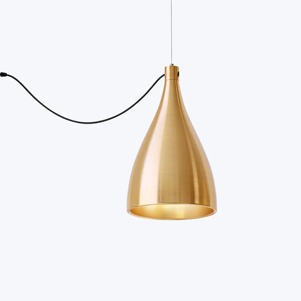 Discover the Swell LED String Pendant by Pablo. This elegant fixture is crafted in spun aluminum and designed with a conical shape, fluid, undulating lines, and a radiant brass interior. A sleek piece, perfect for contemporary and industrial spaces. Available in a wide variety of size and color configurations.