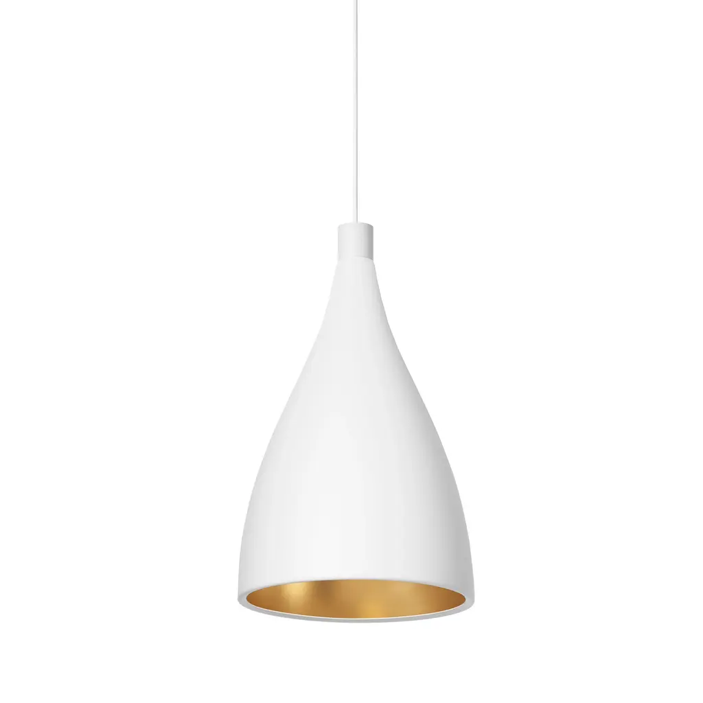 The Swell Pendant by Pablo Designs is a sleek, organic fixture that is a perfect decorative accent. Crafted from spun aluminum, it features a gently rounded conical shade with a sleek interior that enhances the dimmable LED light and creates a stunning, customized glow. This graceful shade is suspended from a domed canopy with a PVC cord. Whether on its own or in groups, this pendant light brings graceful illumination to seating areas, kitchens, and covered outdoor spaces.