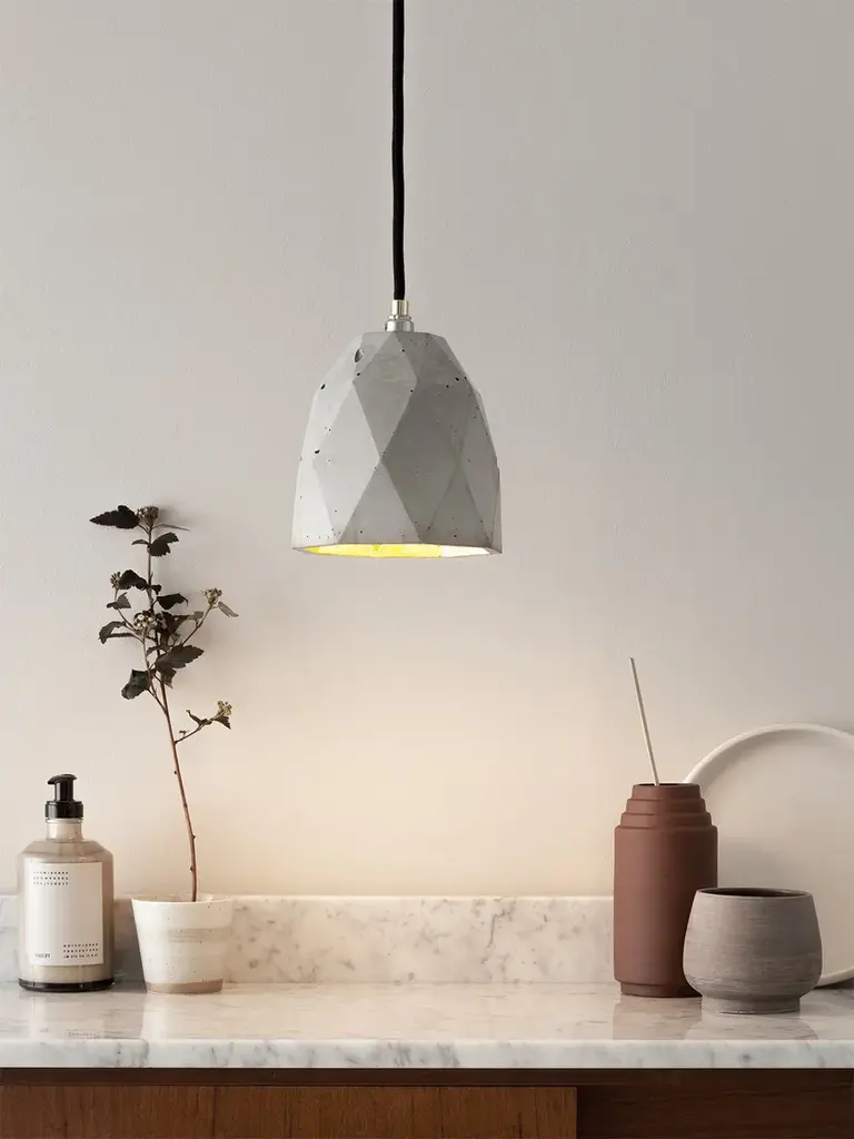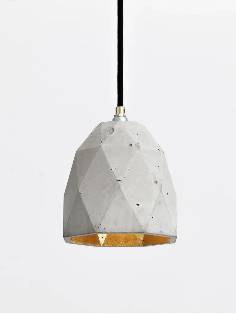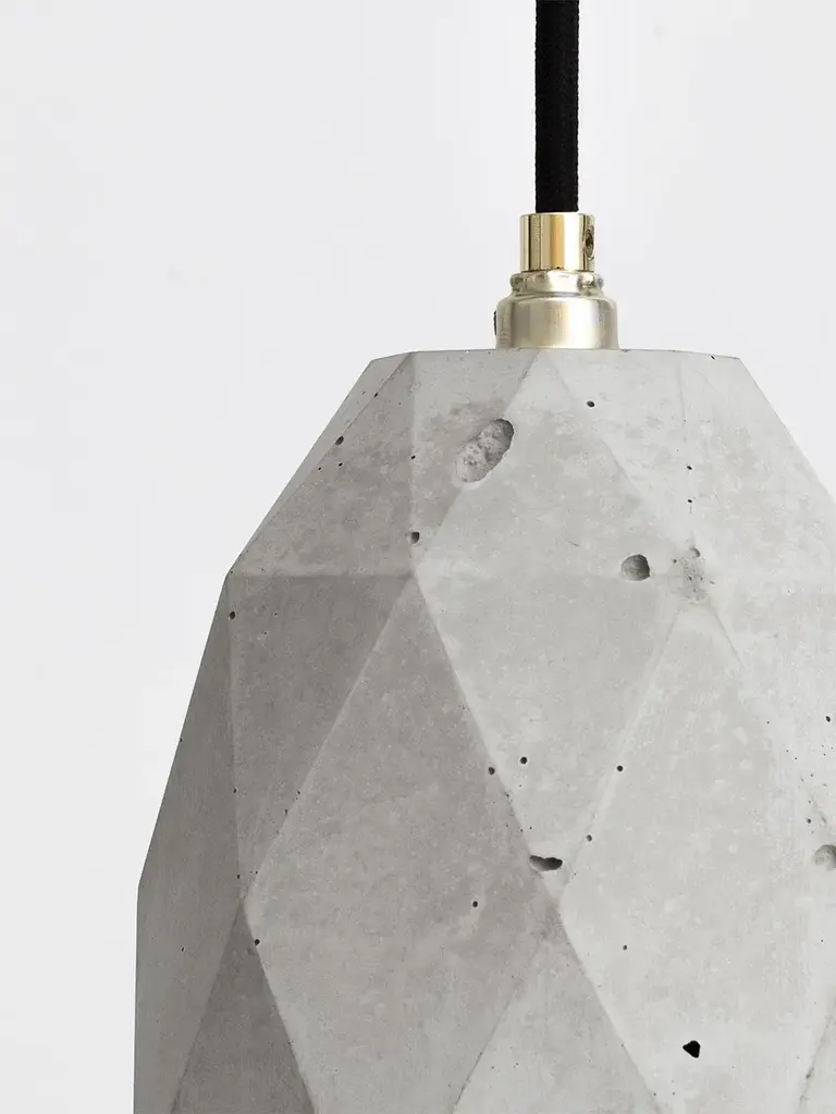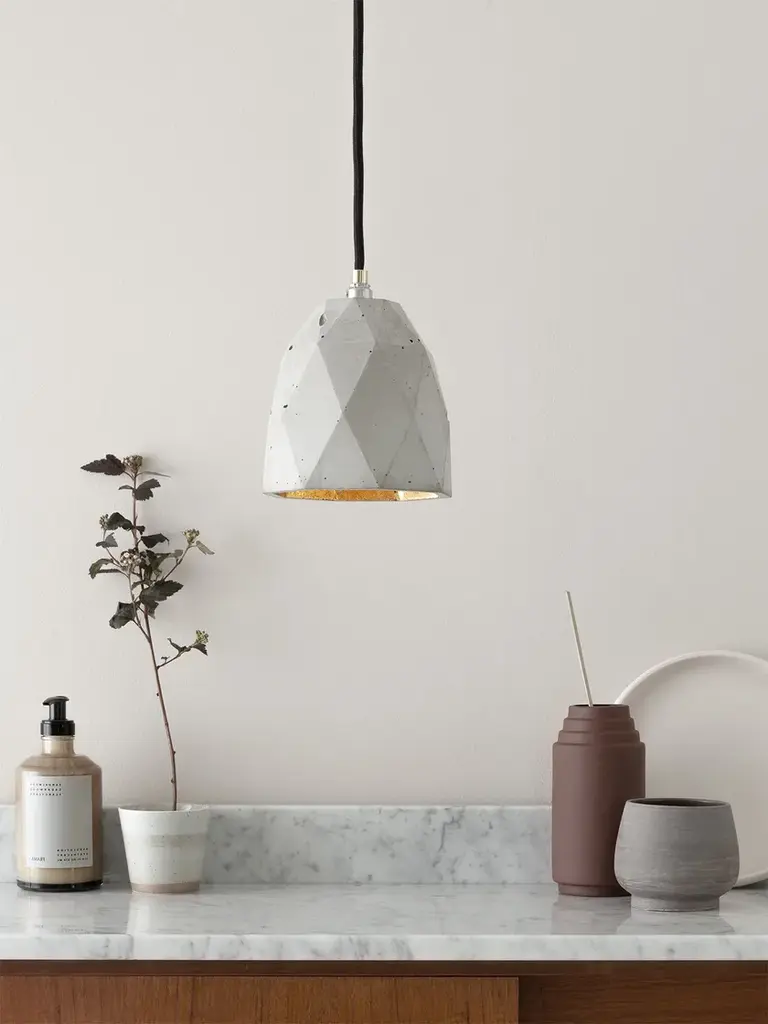 [T1] Pendant Light Triangle - light grey concrete with gold, silver or copper plating on the inside - handmade by GANTlights in Berlin. The lamp can be used solitary as an "eye-catcher" or combined in a series above a dining table, a sideboard, a desk, or a bar for example. Due to its minimalistic design and the contrasting materials, the lamp is modern and timeless at the same time and can therefore be combined with any style. Included: The handmade lamp shade is delivered ready to install with an E14 brass mount, cable restraints, 1.8m / 3m / 5m of black / white / grey textile cable, mounting hardware and black canopy.Watts / beam angle: 40W / 95°The lamp requires an E14 bulb (please note that the bulb is not included).
