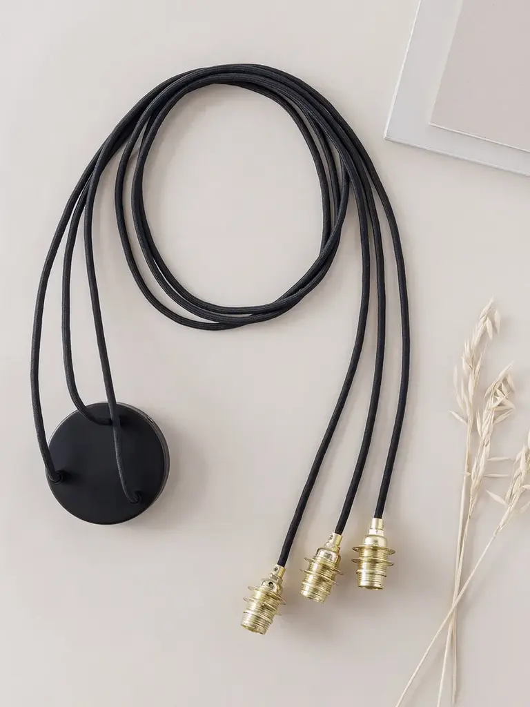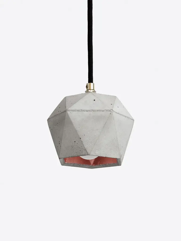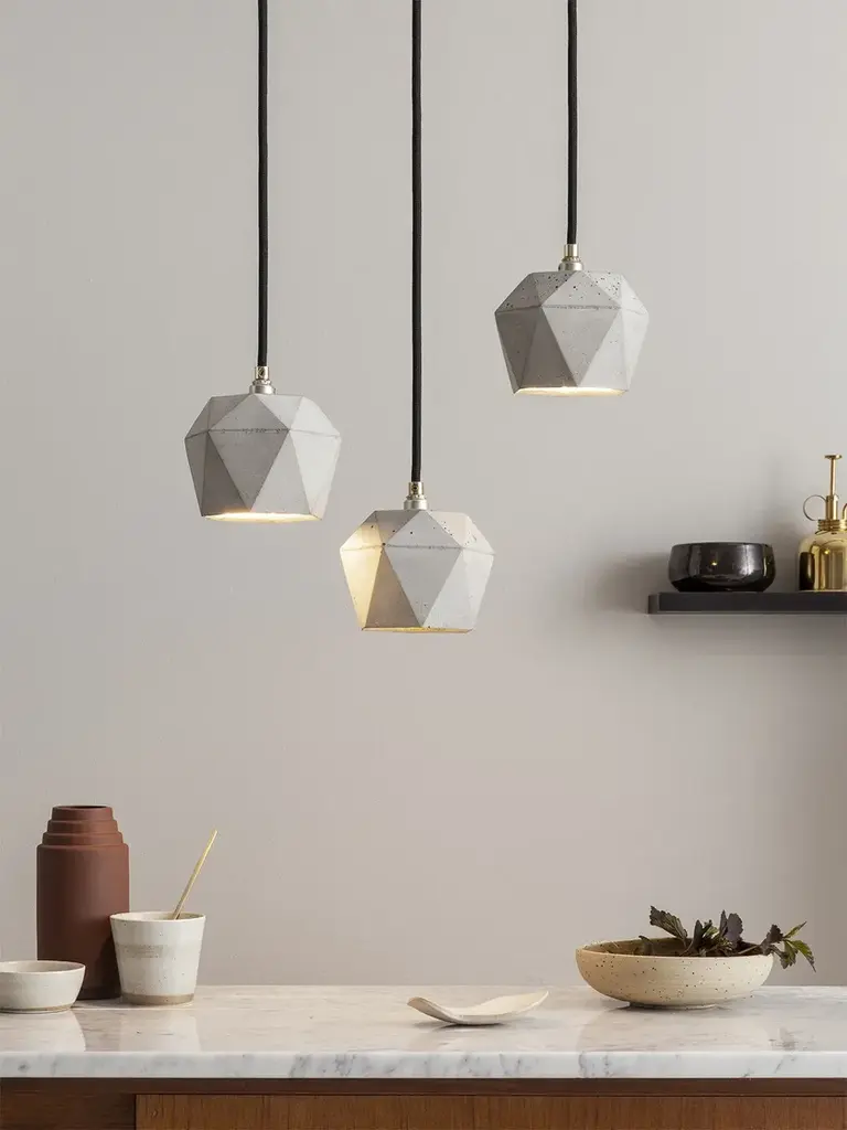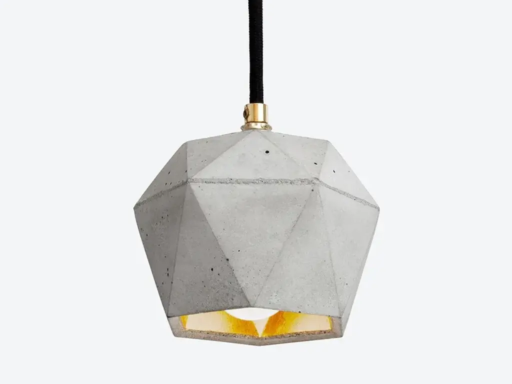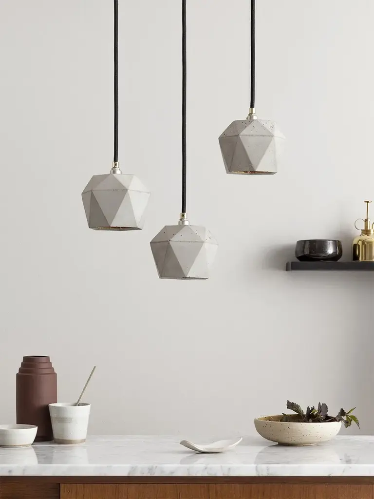 [T2] Bundle Pendant Light Triangle - light grey or dark grey concrete with gold, silver or copper plating on the inside - handmade by GANTlights in Berlin.The set of three lamps can be used solitary as an "eye-catcher" or combined in a series of bundles above a dining table, a sideboard, a desk, or a bar for example. Due to its minimalistic design and the contrasting materials, the lamp is modern and timeless at the same time and can therefore be combined with any style.Included: The handmade lamp shade is delivered ready to install with E14 brass mounts, cable restraints, 1.8m / 3m / 5m of black / white / grey textile cable, mounting hardware and black canopy.Watts / beam angle: 40W / 110°The lamp requires three E14 bulbs (please note that bulbs are not included).