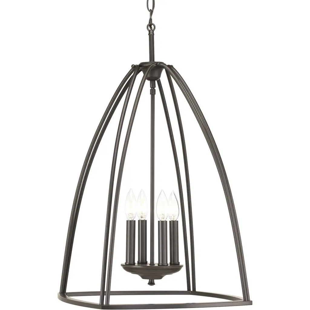 The four-light 16-3/4" foyer in the Tally Collection embraces a simplified classic form that is updated with modern inspiration. The open foyer with the four-light cluster offer visual interest and enhance relaxed environments. This simple foyer goes with many styles and families in the Progress Lighting line. Brushed Nickel finish.