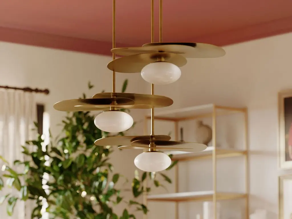 Three slender shades are arrayed and layered above an opal matte glass diffuser for a botanical feel and organic style. The gentle circular forms of the shade pair perfectly with the soothing material choices. Light fills the diffuser with a soft glow that reflects gently off the metal above adding to the pendant's overall natural vibe.