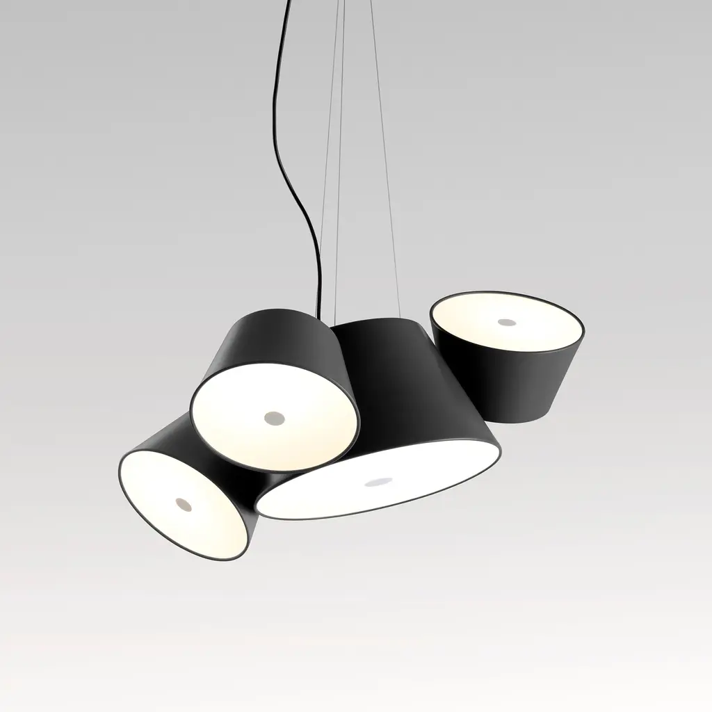 Tam Tam 3 is a cluster variation with a central shade surrounded by a trio of satellites which can swivel 360 degrees to face downward, sideways or upward to reflect off the ceiling. The eye-catching lacquered aluminum pendant from Barcelona-based Marset and Berlin designer Fabien Dumas is available in a number of color combinations to complement the center light in black or off-white. An opalescent methacrylate diffuser over the open end of each shade softens the illumination.