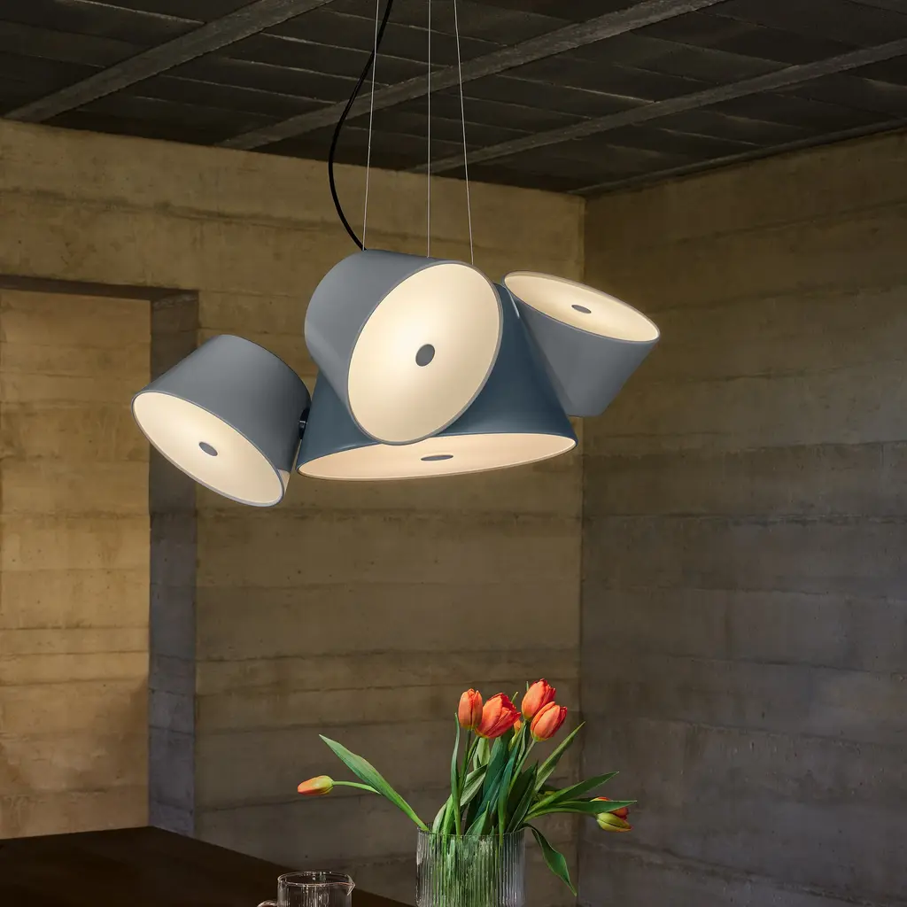 Tam Tam 3 is a cluster variation with a central shade surrounded by a trio of satellites which can swivel 360 degrees to face downward, sideways or upward to reflect off the ceiling. The eye-catching lacquered aluminum pendant from Barcelona-based Marset and Berlin designer Fabien Dumas is available in a number of color combinations to complement the center light in black or off-white. An opalescent methacrylate diffuser over the open end of each shade softens the illumination.