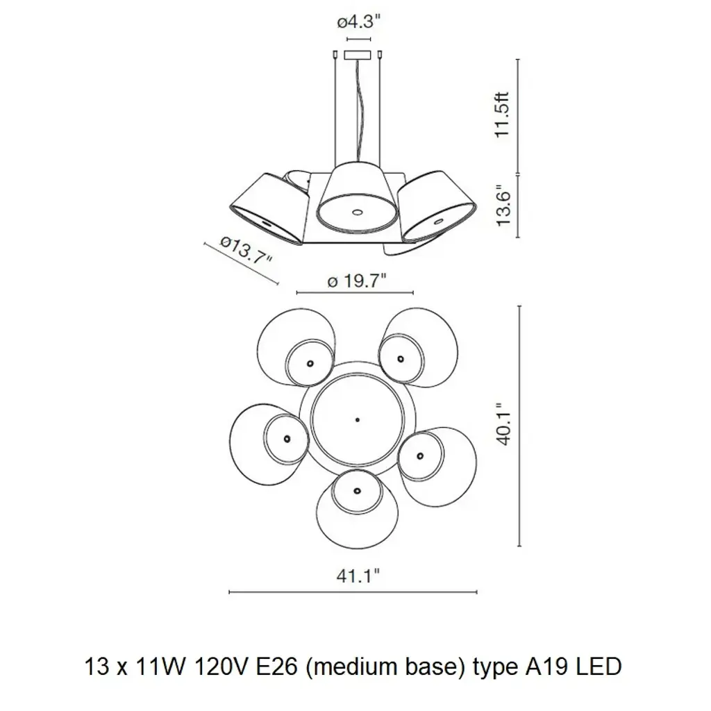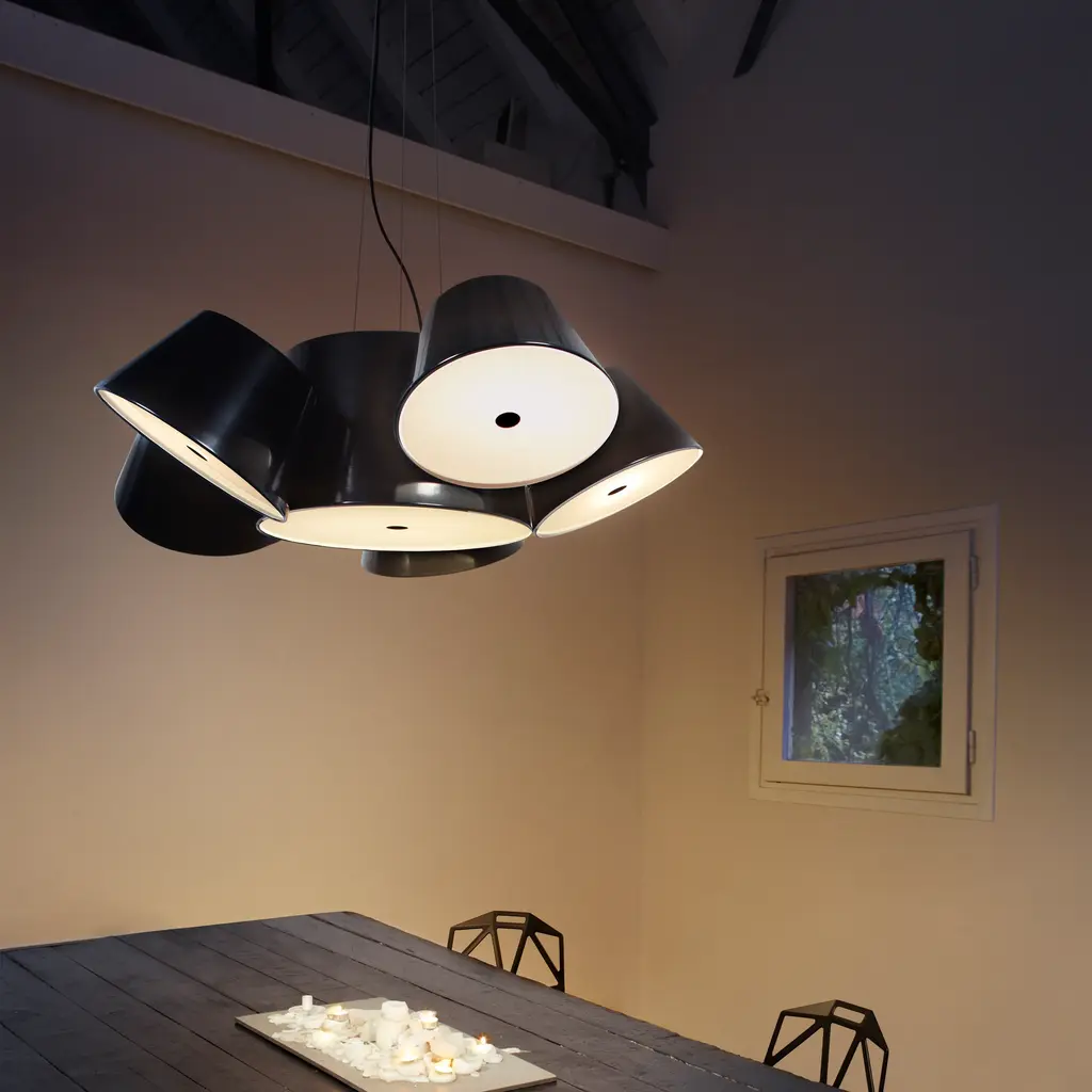 A beaming beauty, the Tam Tam 5 Pendant Light from Marset is a gleaming centerpiece for any contemporary setting. With its spinning lacquered shades and brilliant light, it evokes the image of solar systems in the dark expanse of space. A large central shade acts as a centerpiece, while the outer shades can be rotated for customizable light. A dazzling addition to any space. Highlights