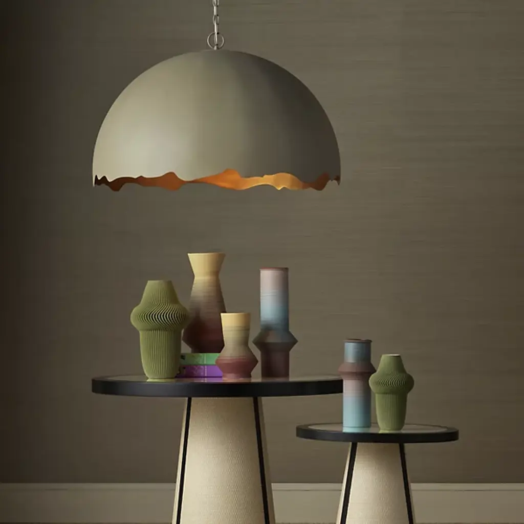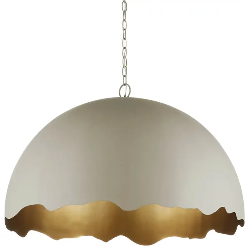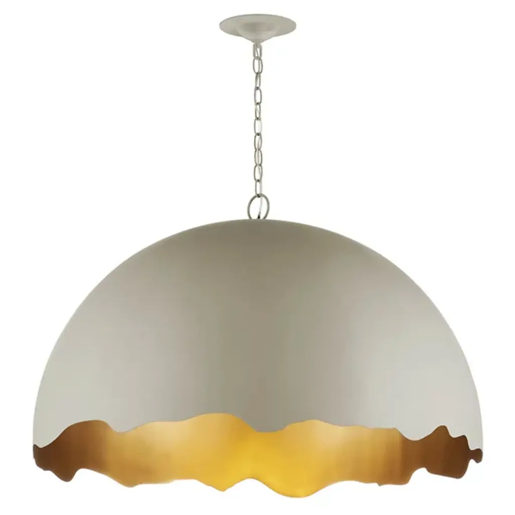 The Tamago Pendant from Currey & Company is a striking, naturally inspired merger of Transitional and Mid-Century Modern styles. Its name is inspired by a Japanese omelet, and its dome shape features an irregular inner edge, resembling a broken eggshell, that aligns perfectly with its namesake. Part of the Hiroshi Koshitaka Collection, it explores themes of sustenance and rejuvenation, adding a unique, artisanal touch to any space. Crafted from wrought iron, it contrasts a contemporary gold interior with a smoky olive outer finish, and the metallic surface emits a warm and reflected radiance.