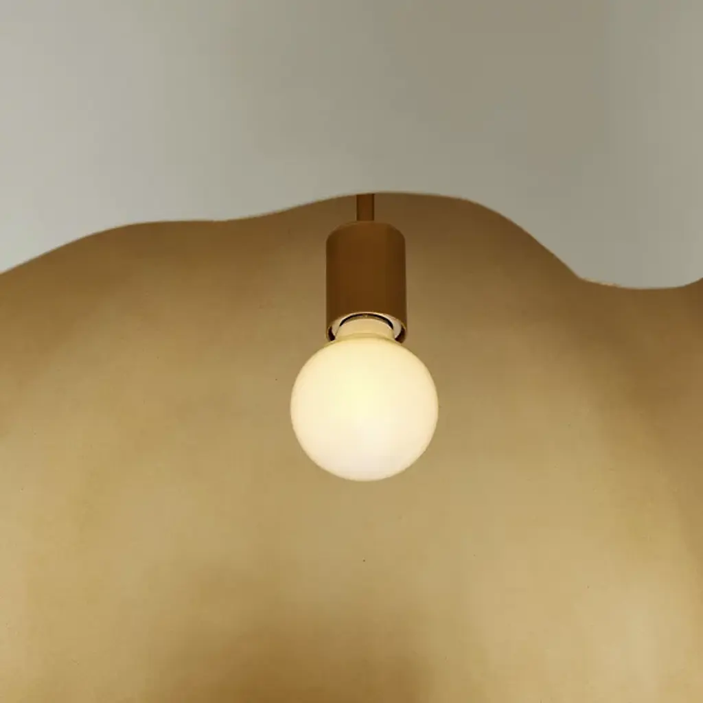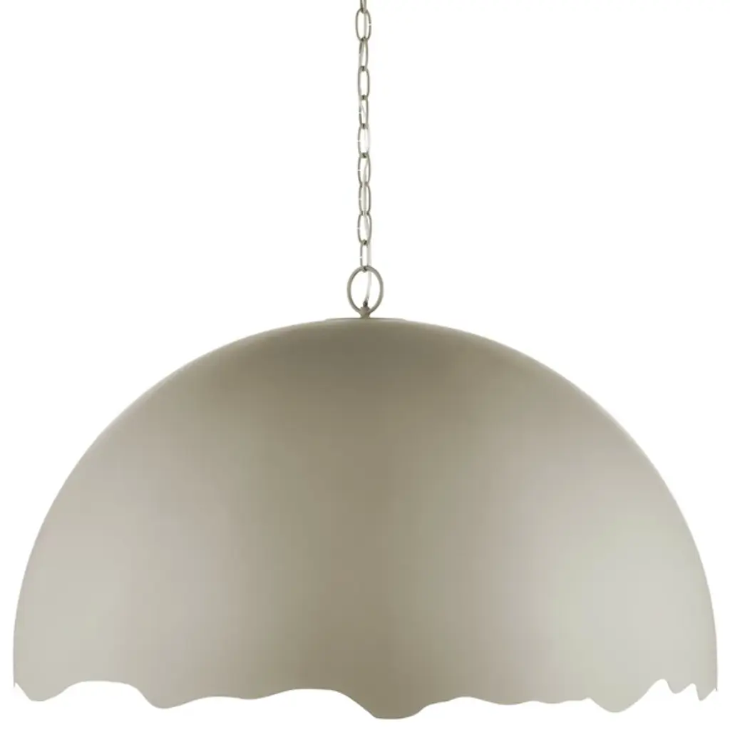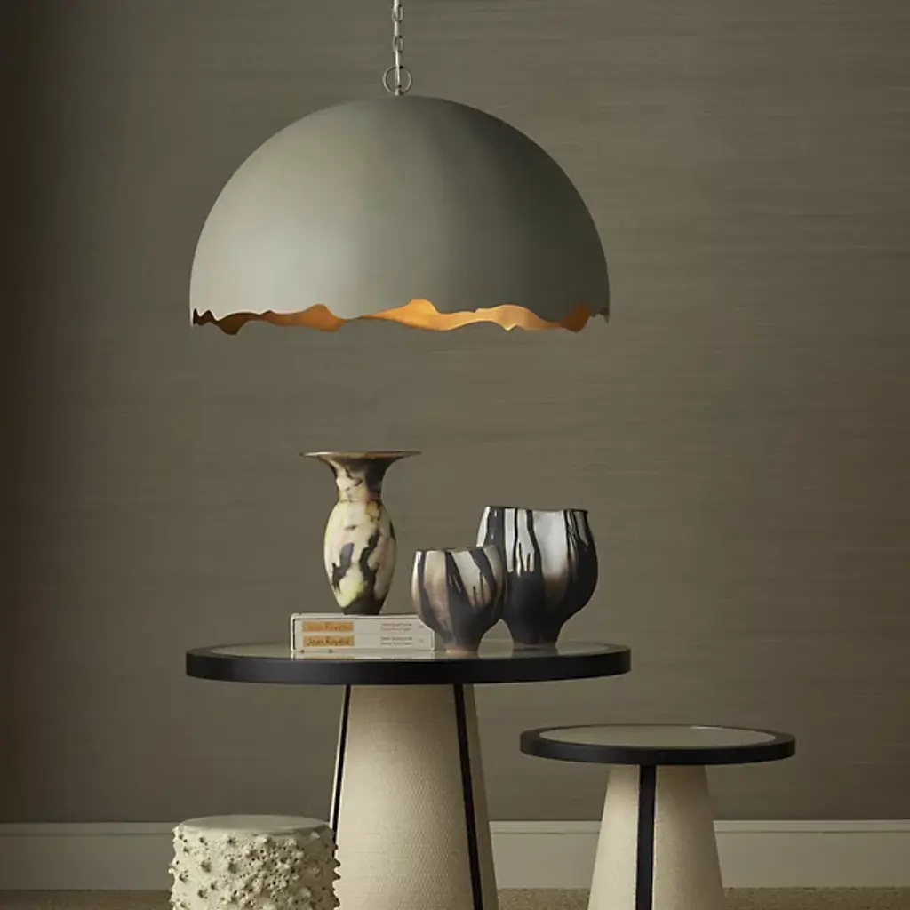 The Tamago Pendant from Currey & Company is a striking, naturally inspired merger of Transitional and Mid-Century Modern styles. Its name is inspired by a Japanese omelet, and its dome shape features an irregular inner edge, resembling a broken eggshell, that aligns perfectly with its namesake. Part of the Hiroshi Koshitaka Collection, it explores themes of sustenance and rejuvenation, adding a unique, artisanal touch to any space. Crafted from wrought iron, it contrasts a contemporary gold interior with a smoky olive outer finish, and the metallic surface emits a warm and reflected radiance.