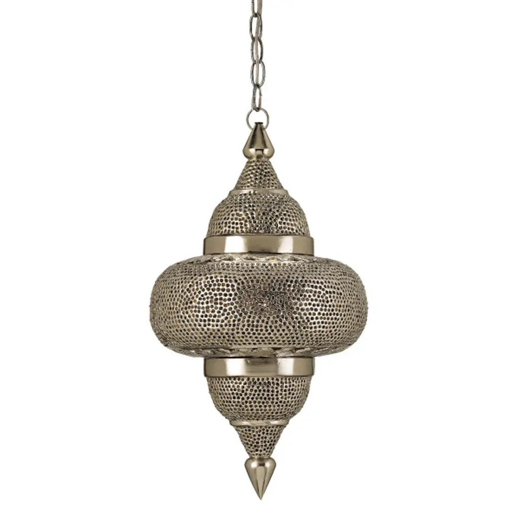 The Currey and Company Tangiers Pendant is as warm and exotic as the city for which it's named. It features a curvaceous perforated steel shade with a Copper and Nickel electroplate that's protected by a clear lacquer. Light comes through the shade with golden sparkle courtesy of Amber glass beads set within most of the piercings.