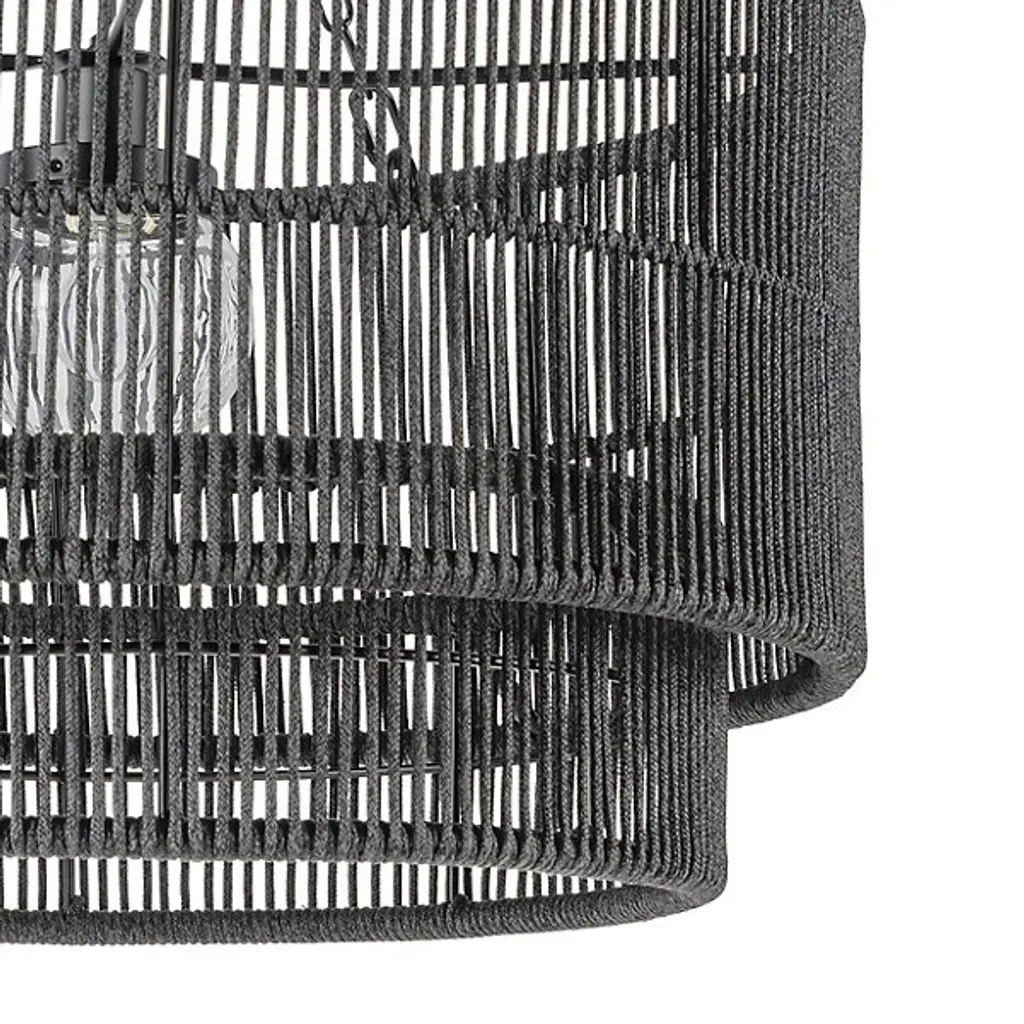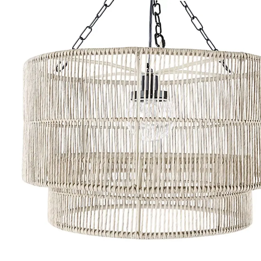 The Tanner Drum Outdoor Pendant by Palecek gives your living space transitional style. Your pendant is secured by chains of fine metal. This gorgeous fixture showcases hand-woven all-weather synthetic wicker presented in a tiered fashion. The Tanner Drum Outdoor Pendant’s socket is enclosed in a glass globe for protection from water.