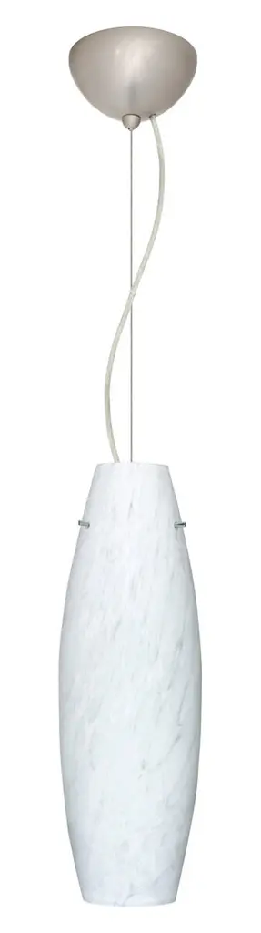 The Tara is a slender yet shapely handcrafted glass with a open top and bottom. Our Carrera glass is a classic yet modern décor that gives off a soft white light. Clear molten glass is rolled in alabaster powder like frit, and then blown into shape with a semi-clear frosted white inner finish. This décor is created by rolling molten glass in small bits of white called frit. The smooth satin finish on the clear outer layer is a result of an extensive etching process. This blown glass is handcrafted by a skilled artisan, utilizing century-old techniques passed down from generation to generation. Each piece of this décor has its own artistic nature that can be individually appreciated. The cable pendant fixture is equipped with a 10' silver aircraft cable and AWM cordset, and a dome monopoint canopy. These stylish and functional luminaries are offered in a beautiful Satin Nickel finish.