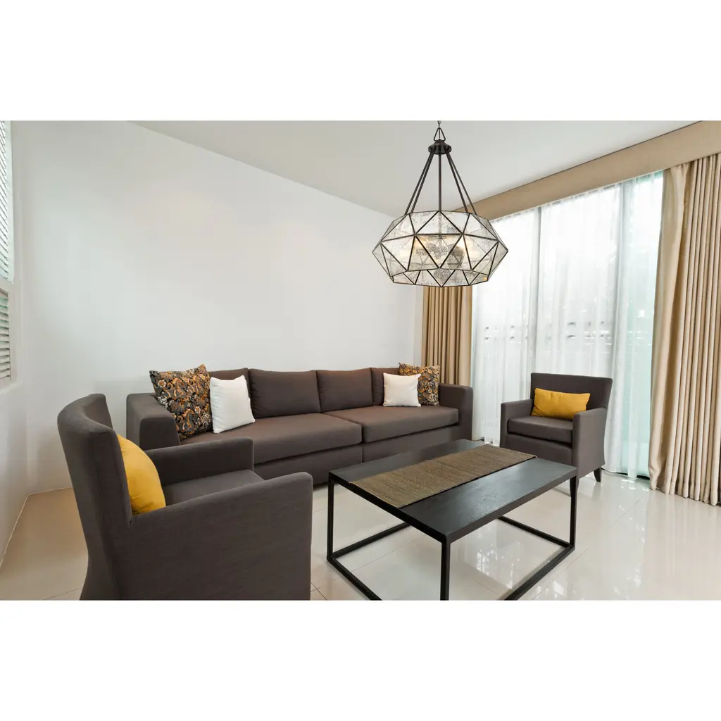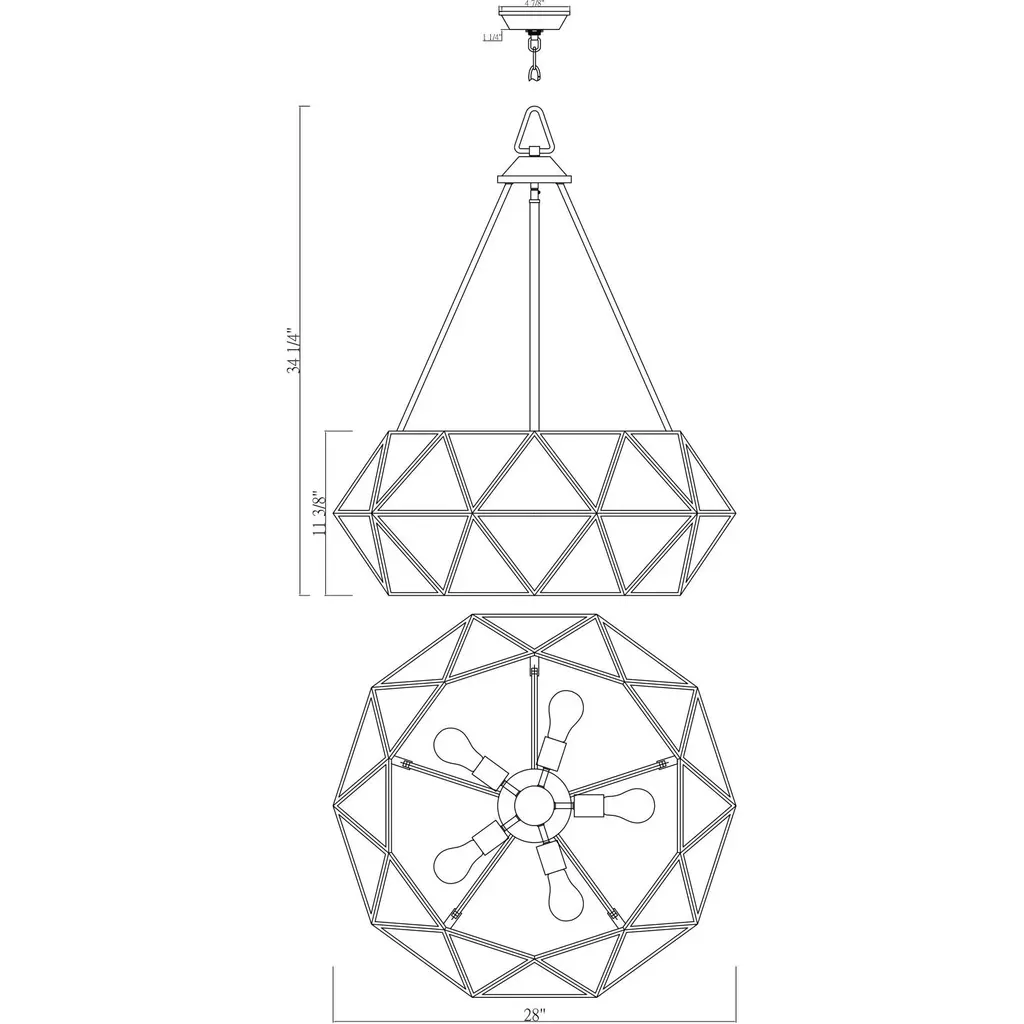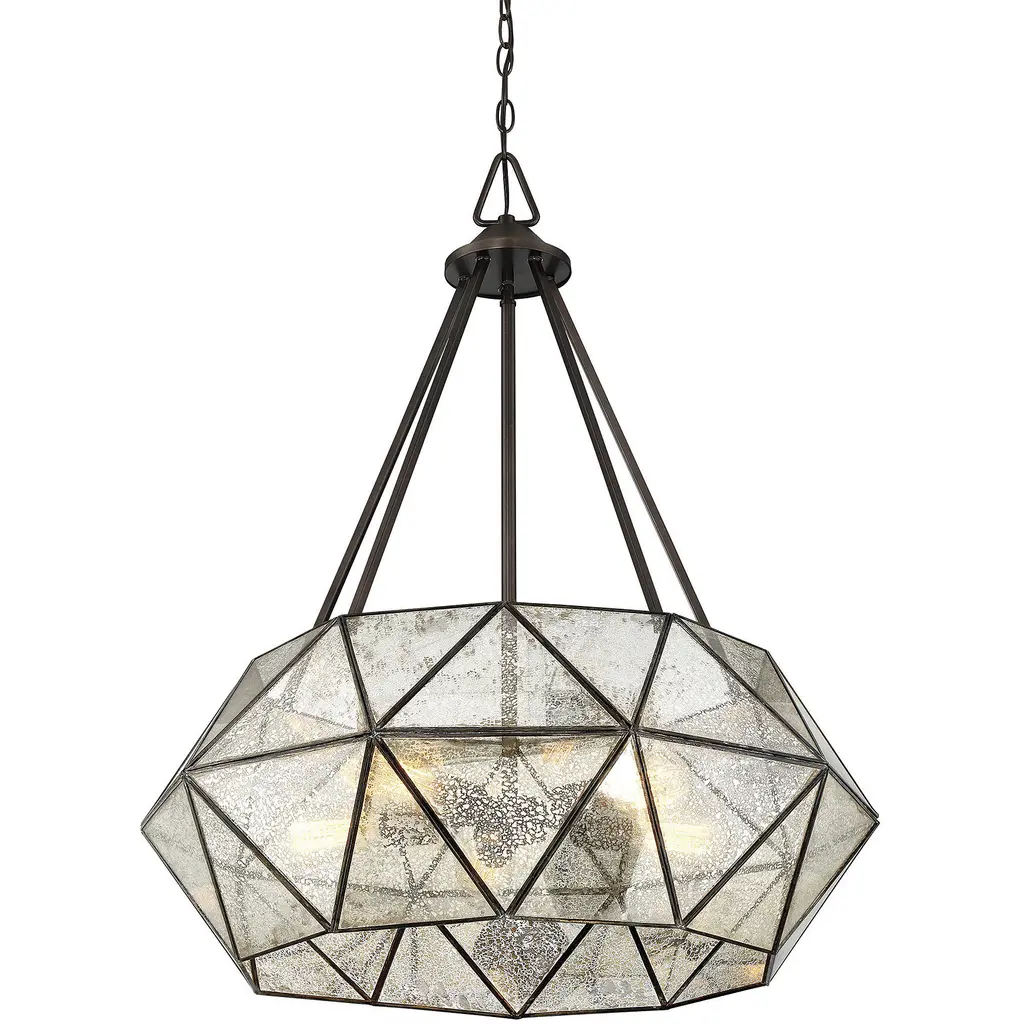 Triangles create drama and the Savoy House Tartan 5-light pendant is no exception Multiple triangular panes have been fitted together, creating a ring-like form around the central column. Several supporting downrods link the canopy to the frame, forming more triangles. The frame has a sumptuous oiled burnished bronze finish that showcases the bold geometric lines of the pendant and the triangular panes are made of lovely mercury glass, providing even more visual and textural interest. Five 60W candelabra size bulbs shine through the mercury glass to illuminate your room. The pendant measures 28" wide and 34" high, which is an excellent size for dynamic style in your home.