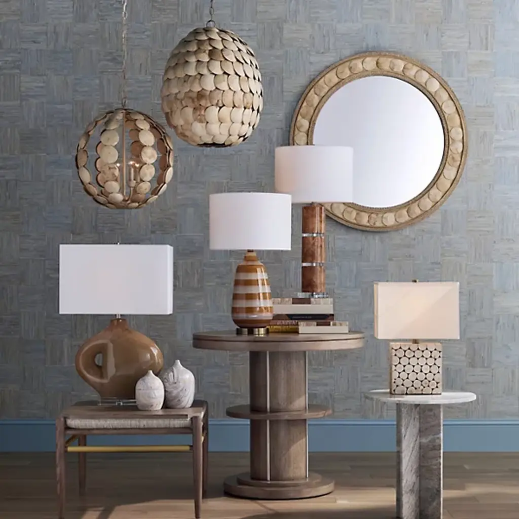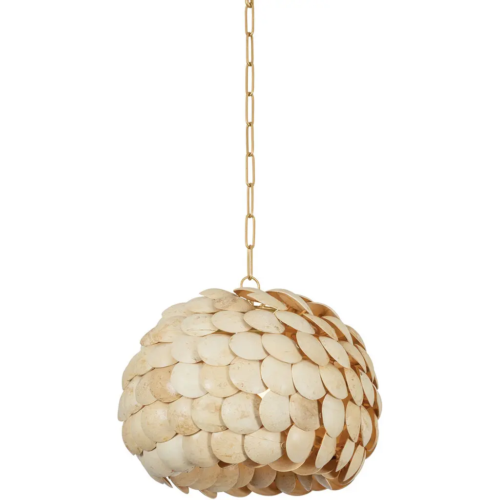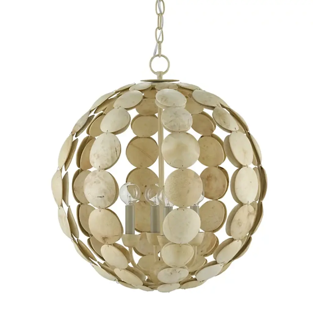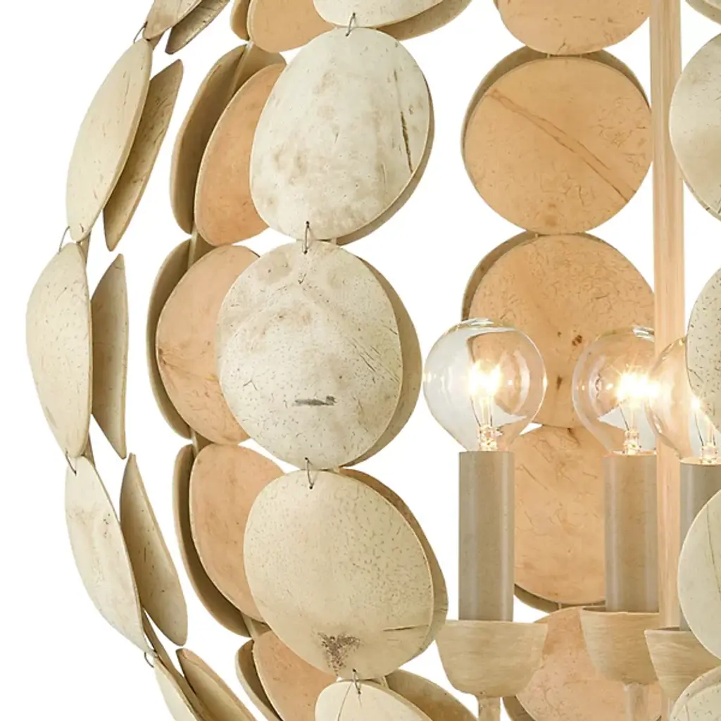 The Tartufo Coco Shell Pendant by Currey & Company is an airy, coastal design that incorporates smooth discs made of coconut shells, which were the inspiration for the open, globe-shaped construction of this fixture. Suspended by a linked chain, a simple, metal frame creates the foundation for polished shells to line their interiors, appearing to warm up when the arrangement of bulbs within this chandelier light up. The exterior of these shells have a neutral, slightly textured look that keeps this piece cool and contemporary, perfect for a variety of spaces needing a bright touch.