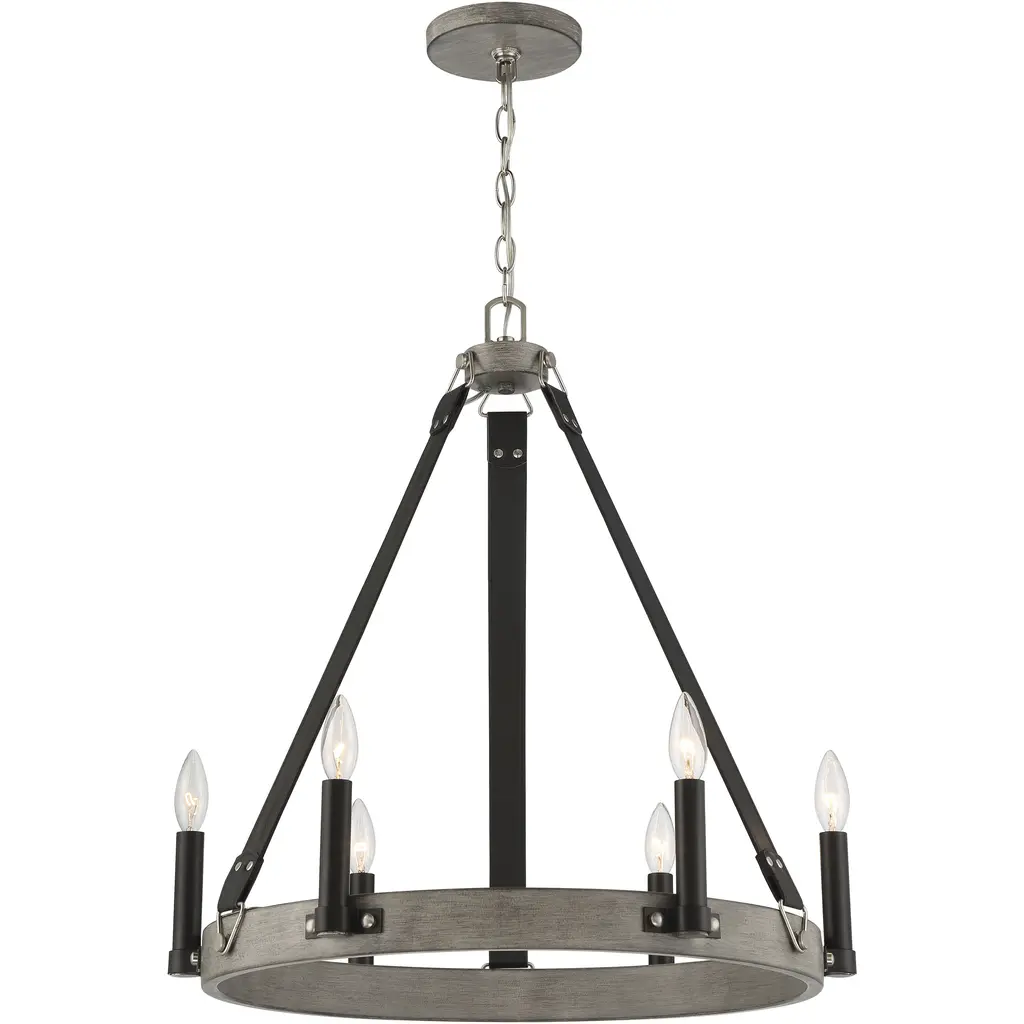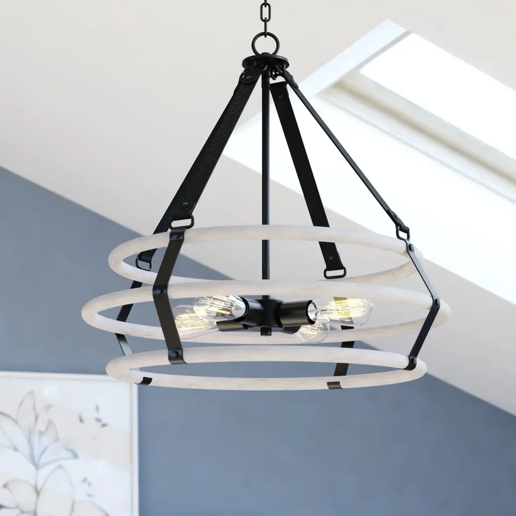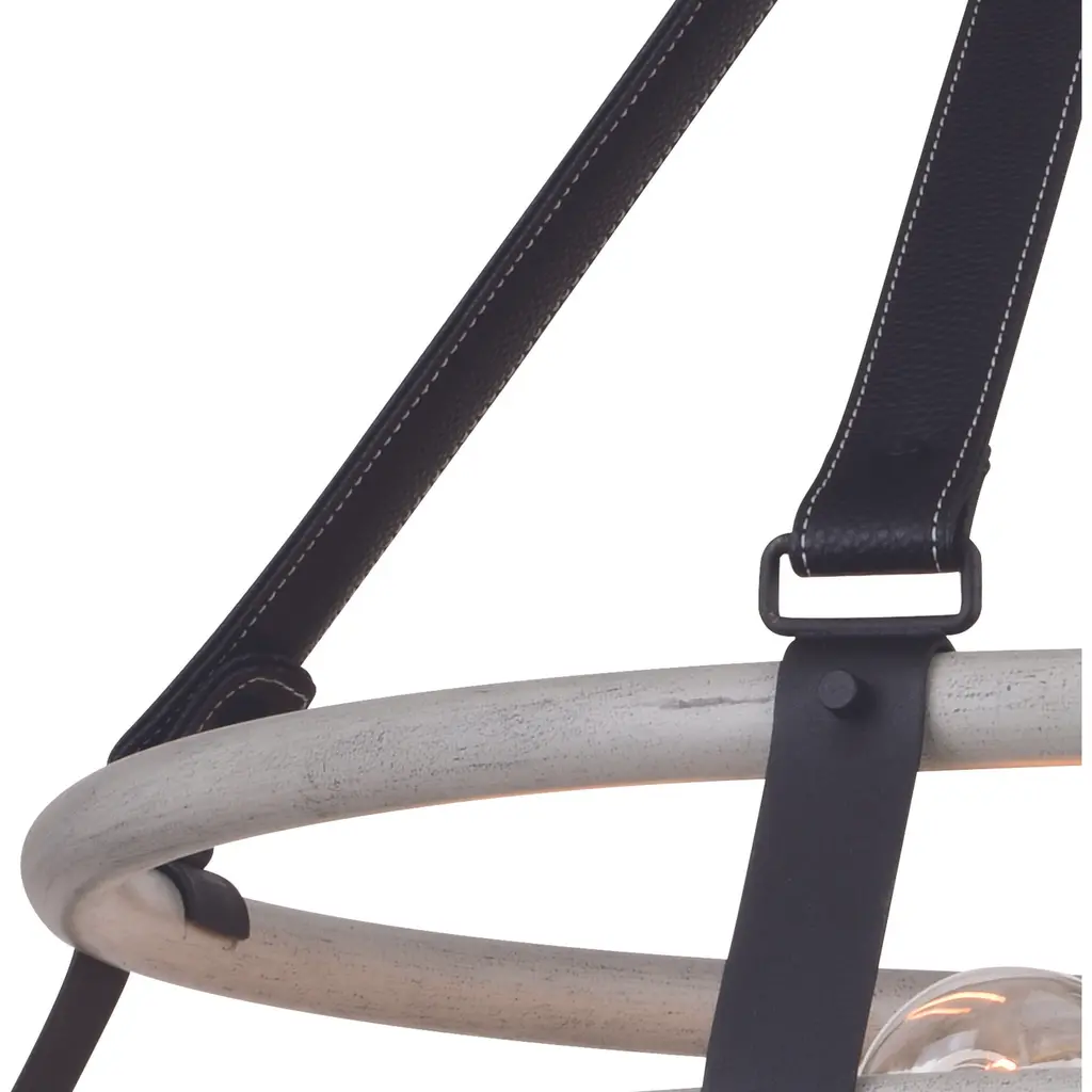 Industrial farmhouse never looked so good, with this smart, strong design. The circular stacking rings create an unusual airy feeling. Straps in faux black leather, accentuate the vertical format suspended from above. A combination of black and ash gray elements play the industrial and farmhouse aesthetic in this collection. Light up entryway, dining or living space with the unexpected charm of the Taylor pendant.