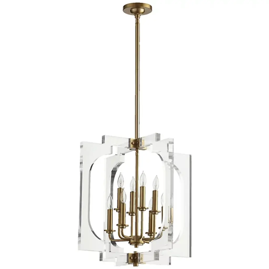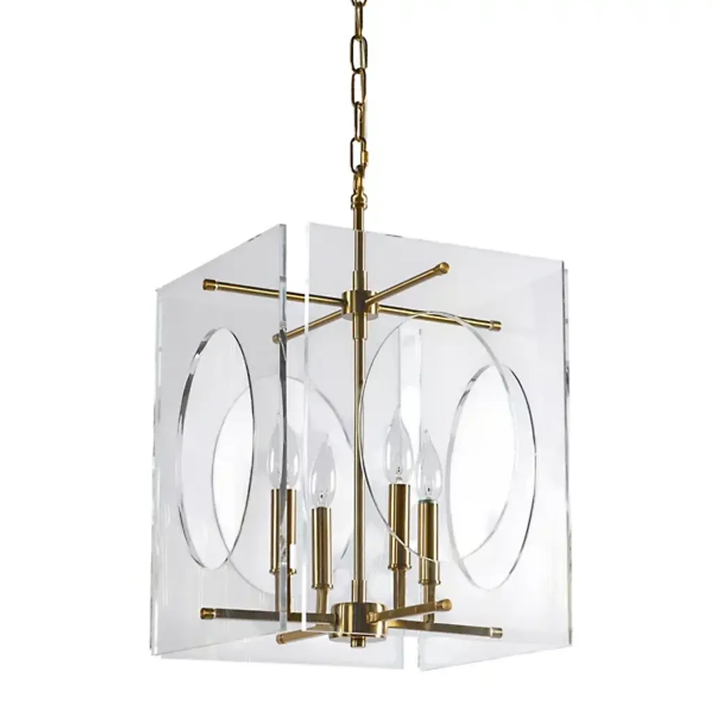 This unique fixture is in a gold finish. The frame is made out of iron. It comes with an acyrlic shade with round holes. This modern fixture can be used in any room.