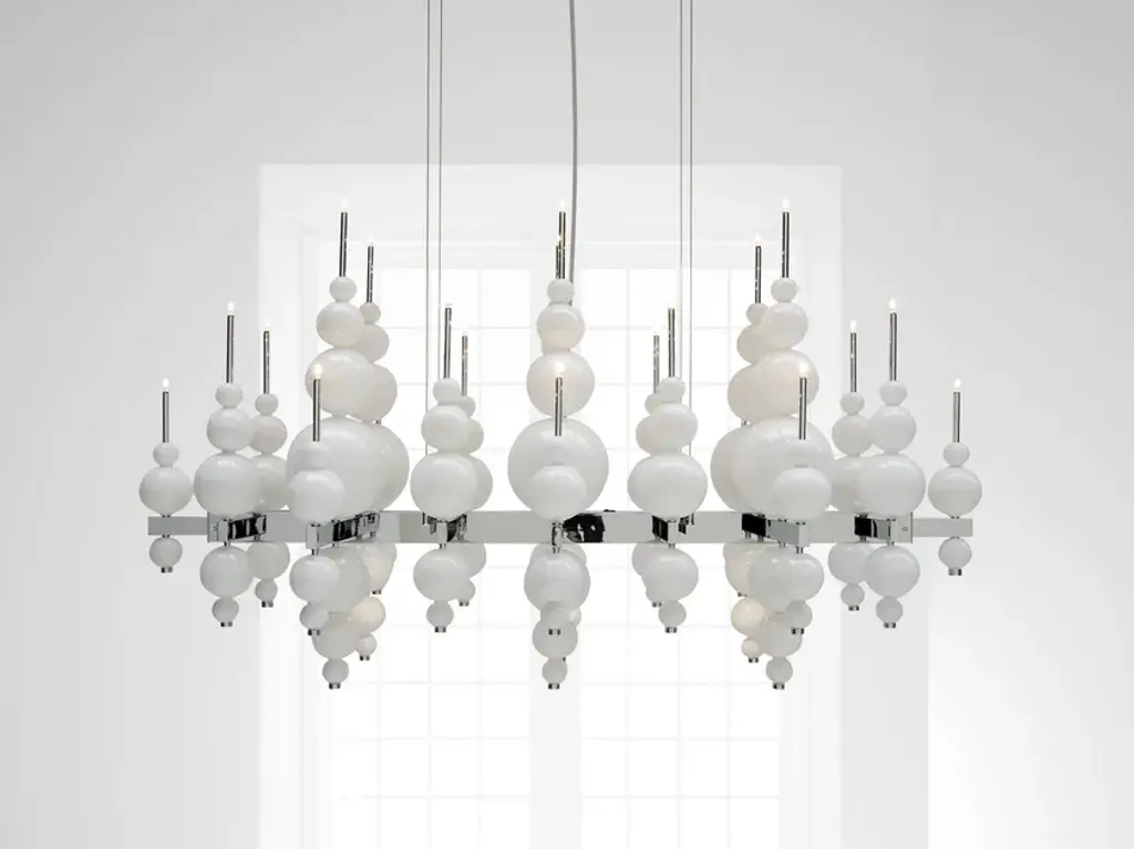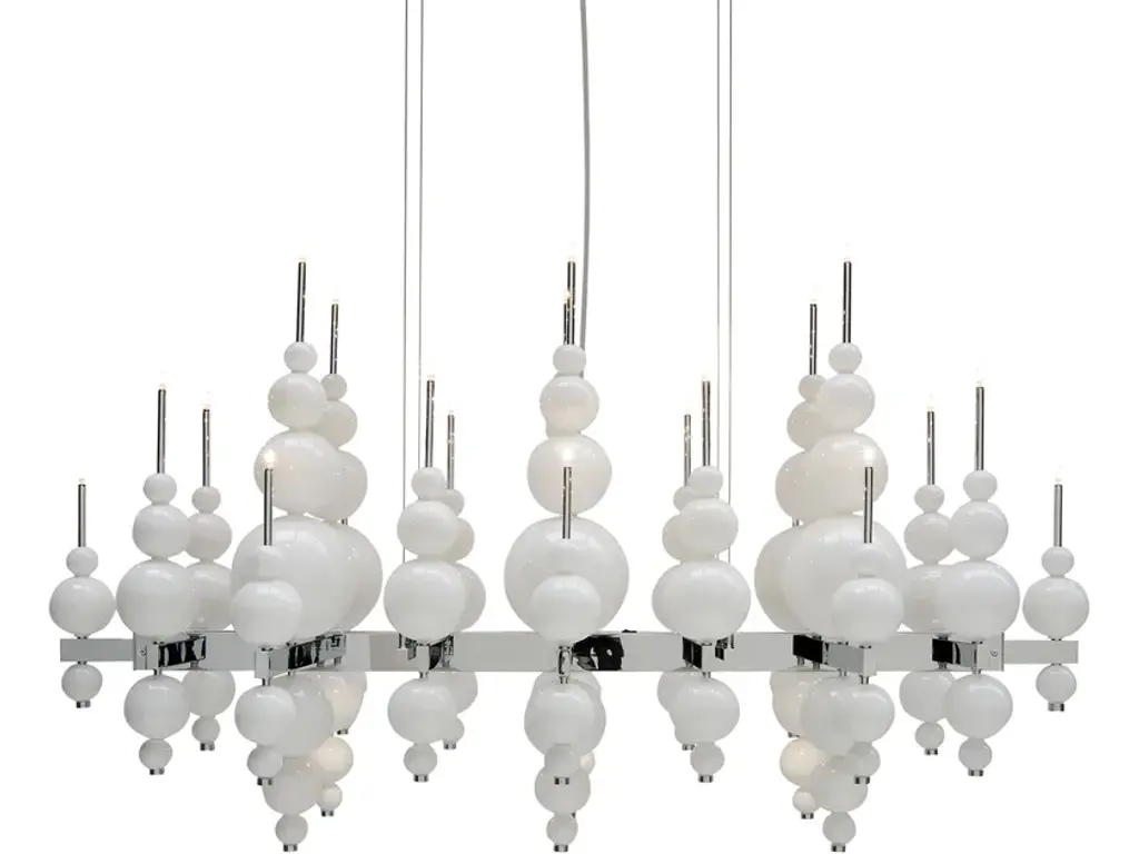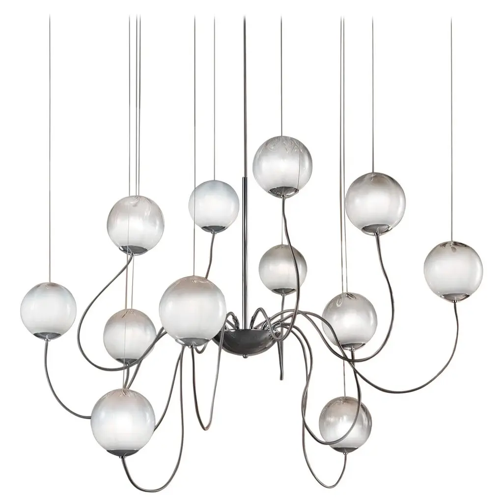Tears From Moon H22+3 is a direct-indirect light glass pendant lamp.WHITE/BLACK/SILVER/GOLD handmade glass ballsBase: 22 x G4 / 12V / Max. 10W Downlight: 3 x LED 3.2W / 2700Kwith separate on-off switchColors: 00 01 02 05 10 12 13Tears from Moon collection is characterized by mouth-blown glass, combined with refined metal processing in various finishes.
