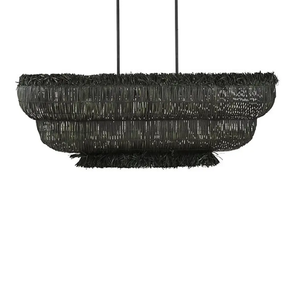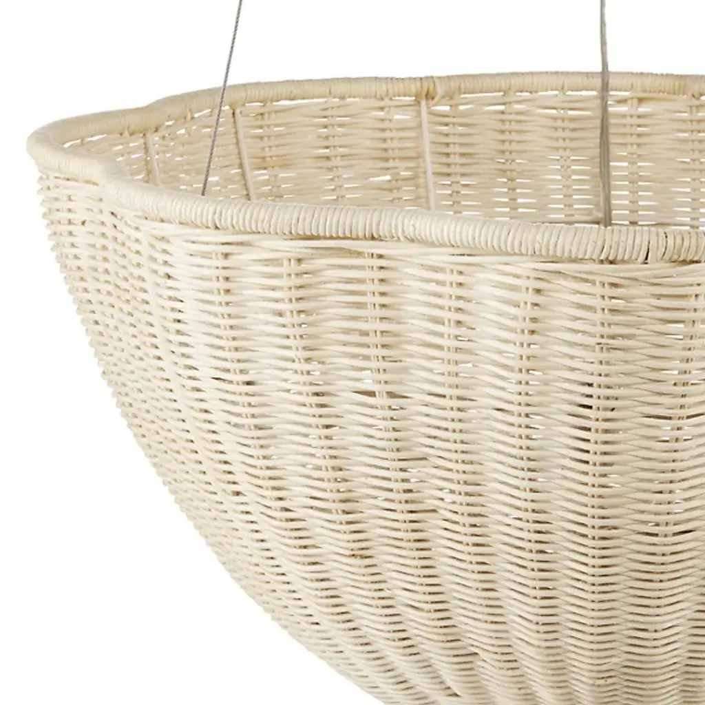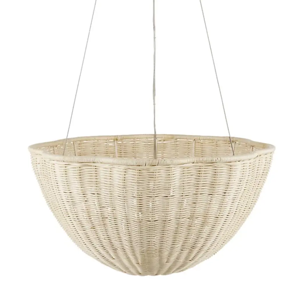 The Telos Pendant from Currey & Company is made of wicker that has been bleached for a lighter feel. The beige pendant is perfect for spaces where an abundance of up light is needed. The wicker pendant with its bowl-shaped profile is scalloped, though this is not obvious when viewed from the side. Given the nature of the woven natural material, pinpoints of light will waft through in spots.