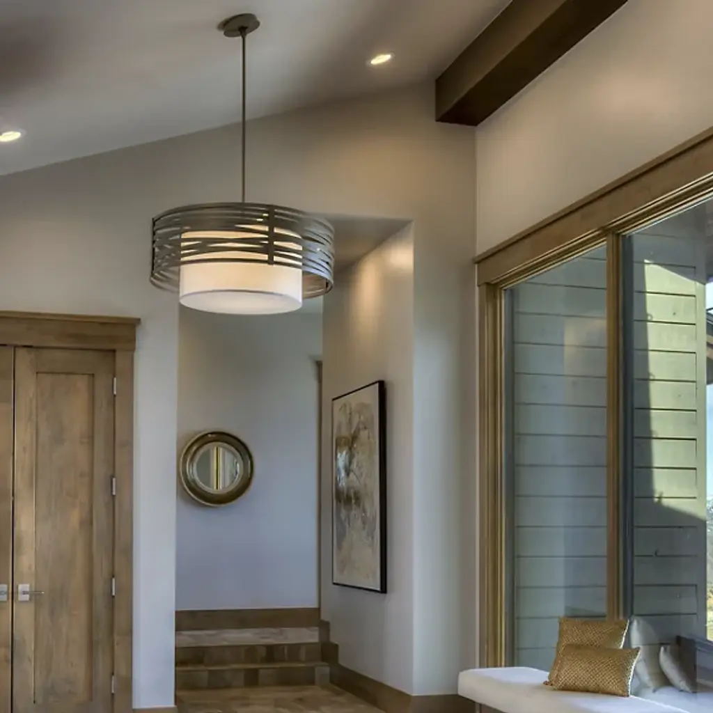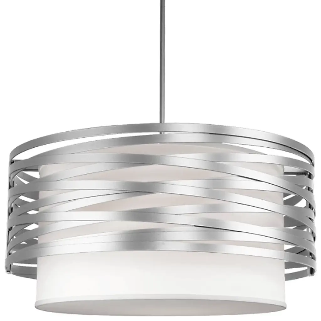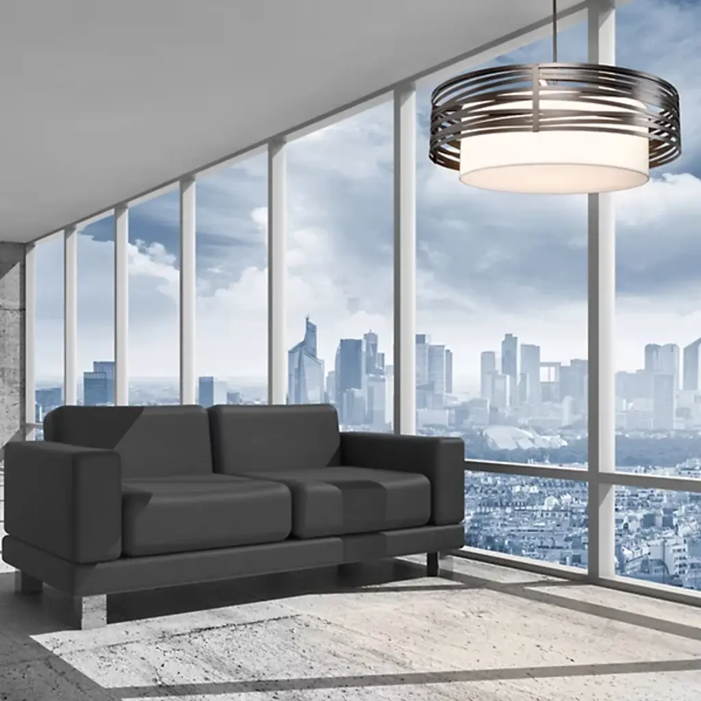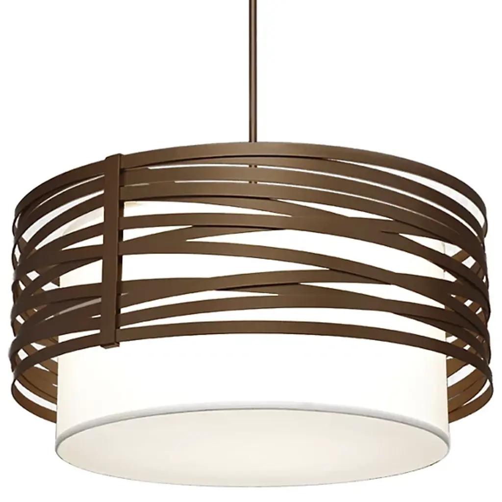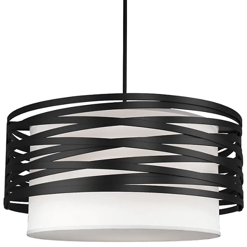 A stirring arrangement of elegant bands. Action and sophistication engulf the Tempest Drum Pendant with Shade from Hammerton Studio, a piece inspired by a gentle storm. Thick-cut steel rods shoot up and down and side to side in a whizzing gust. The dazzling metal structure creates shapely cuts that offer a glimpse at its creamy background inside. A lovely linen shade pairs its sultry nature with the bold one of the drum-shaped structure. A feast for the eyes takes place as its vibrant light mellows through the shade and silhouettes the stirring exterior.