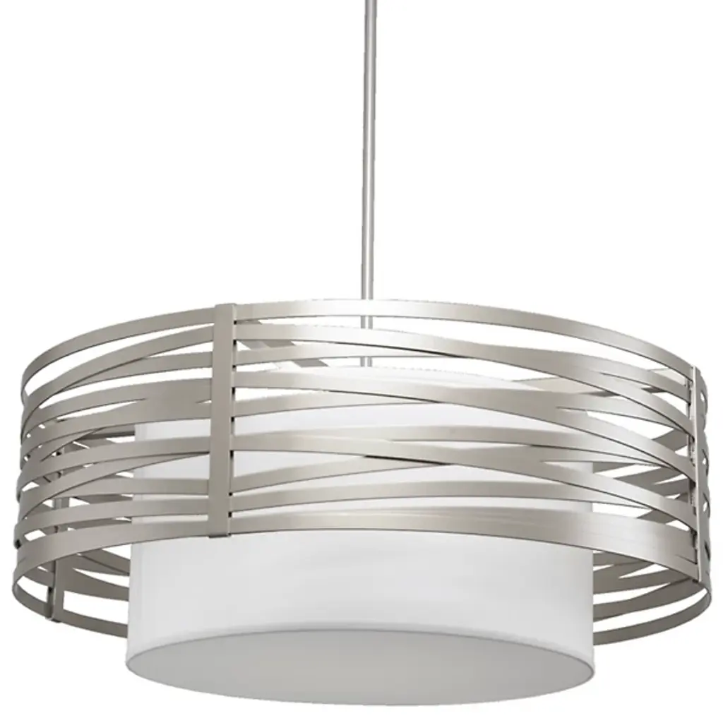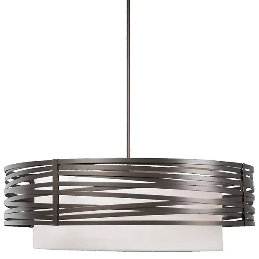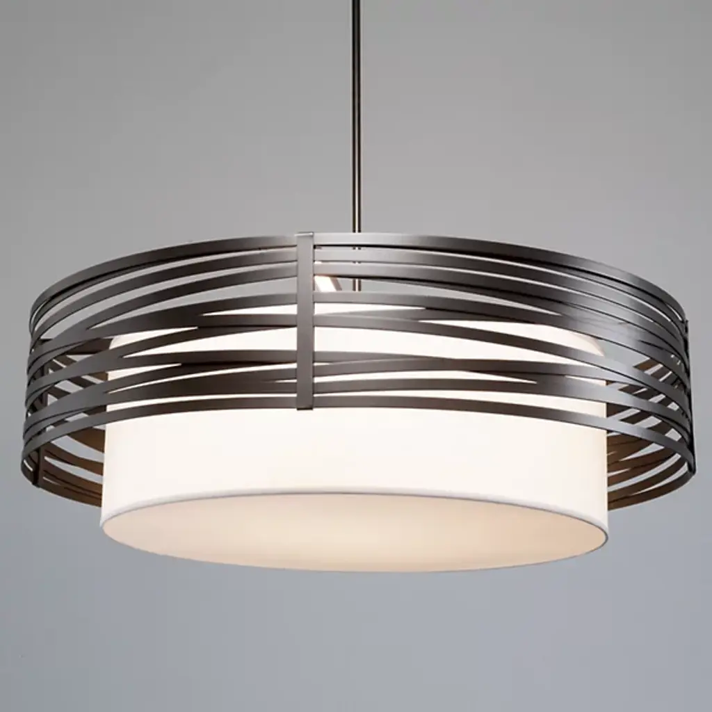A stirring arrangement of elegant bands. Action and sophistication engulf the Tempest Drum Pendant with Shade from Hammerton Studio, a piece inspired by a gentle storm. Thick-cut steel rods shoot up and down and side to side in a whizzing gust. The dazzling metal structure creates shapely cuts that offer a glimpse at its creamy background inside. A lovely linen shade pairs its sultry nature with the bold one of the drum-shaped structure. A feast for the eyes takes place as its vibrant light mellows through the shade and silhouettes the stirring exterior.
