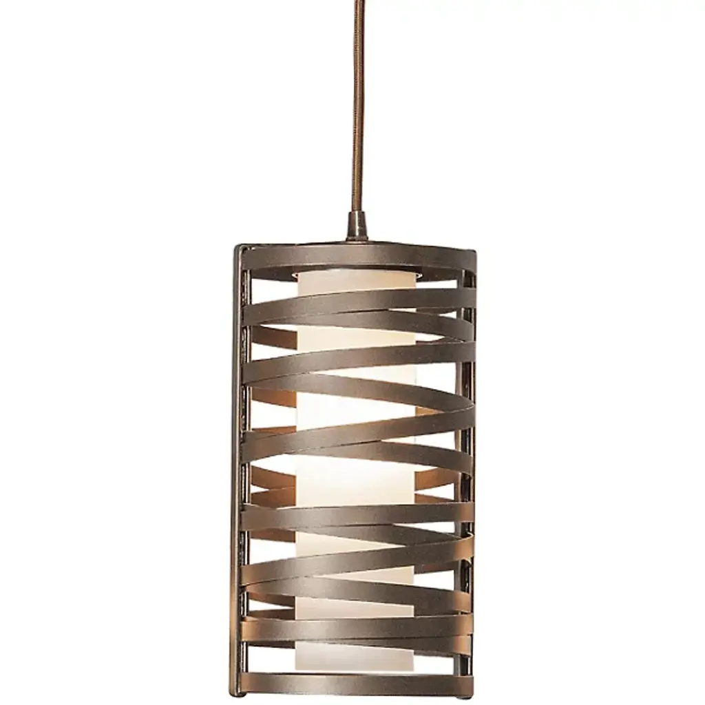 Controlled chaos. Metalsmiths at Hammerton Studio evoke the spirit of the storm with swirling bands of handcrafted steel in the Tempest Mini Pendant. A cylindrical form contains the masterwork by artisans; it stands beautifully on its own or in sequence. Breezy contours of thick-cut steel move freely; they cross over with each other in a surging showcase. In the eye of the storm, a single bulb hangs with fine tubing in a dramatic arrangement. Its light complements the energy of the shade with a soothing, mellow glow.