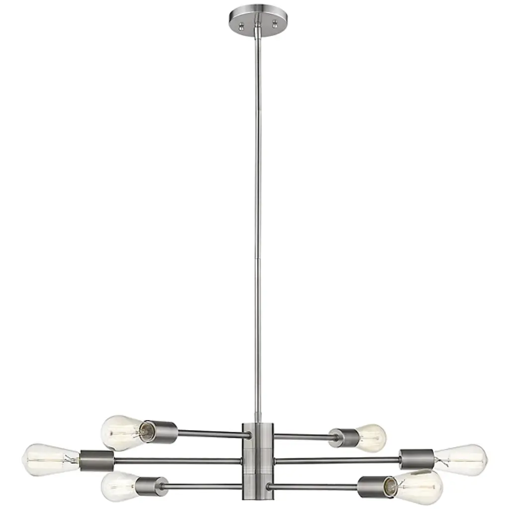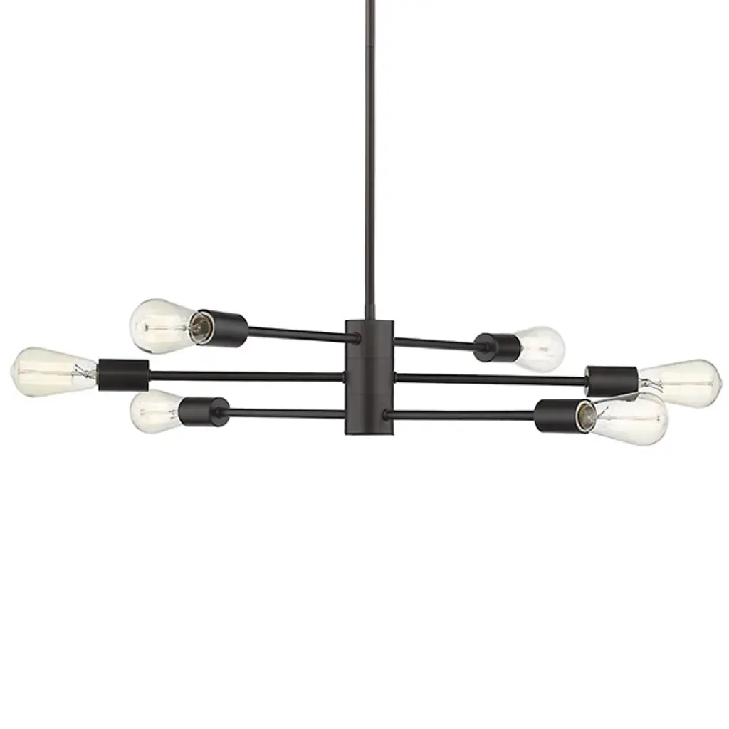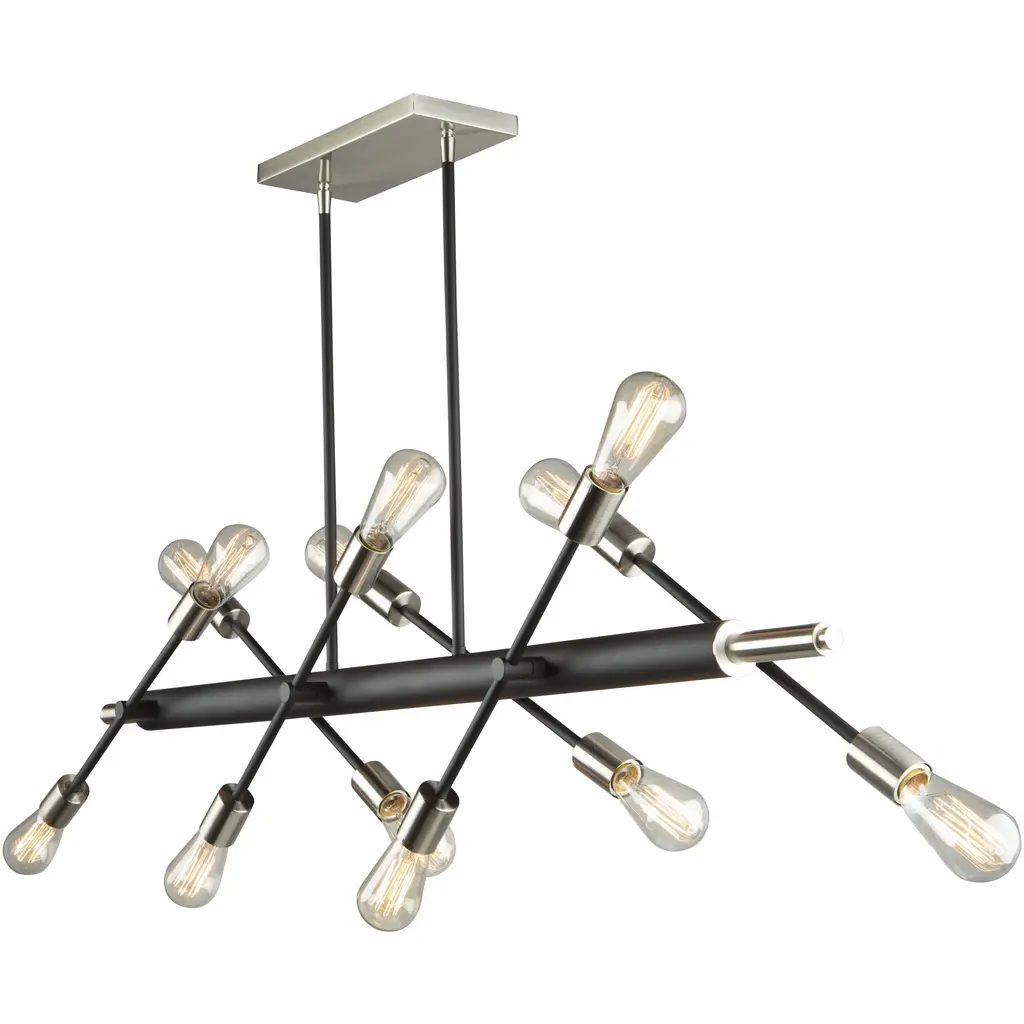 Sleek, modern lighting for contemporary dining rooms or other spaces. The Tenley Horizontal Pendant by Huxe is made entirely of steel, from the top of its round canopy to the bottom of its swivel mechanism. This pendant can be linear or not, thanks to its adjustable arms. Each arm, with an exposed bulb on either end, can be rotated horizontally to achieve just the look and get just the right wash of light you want in your home.