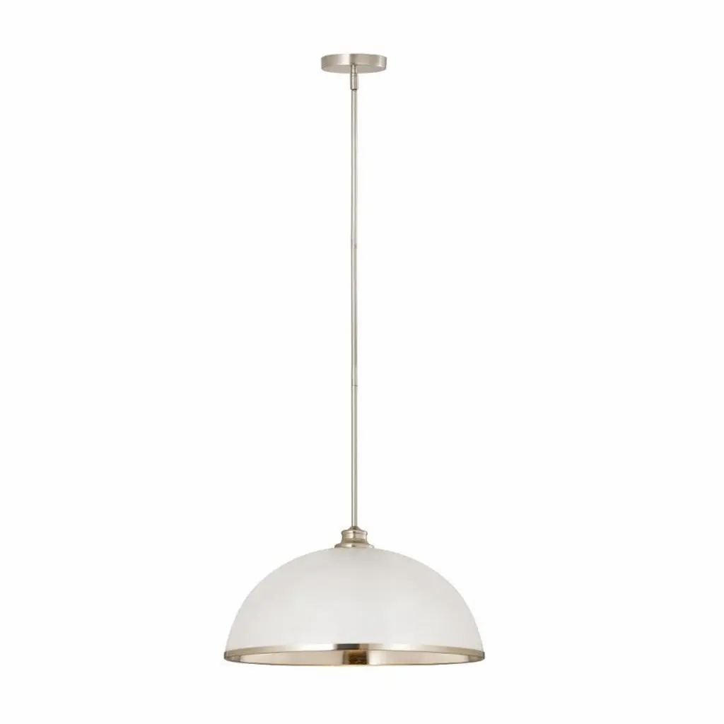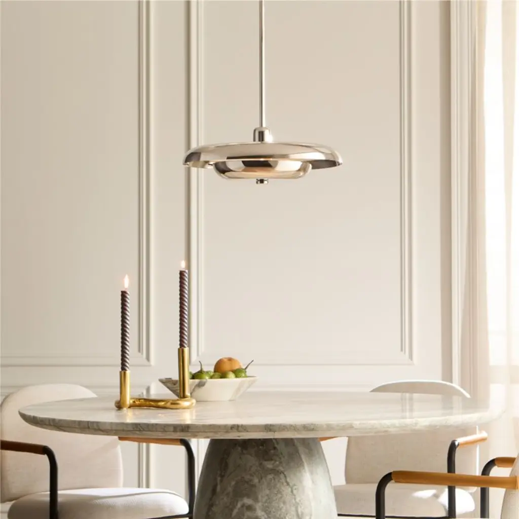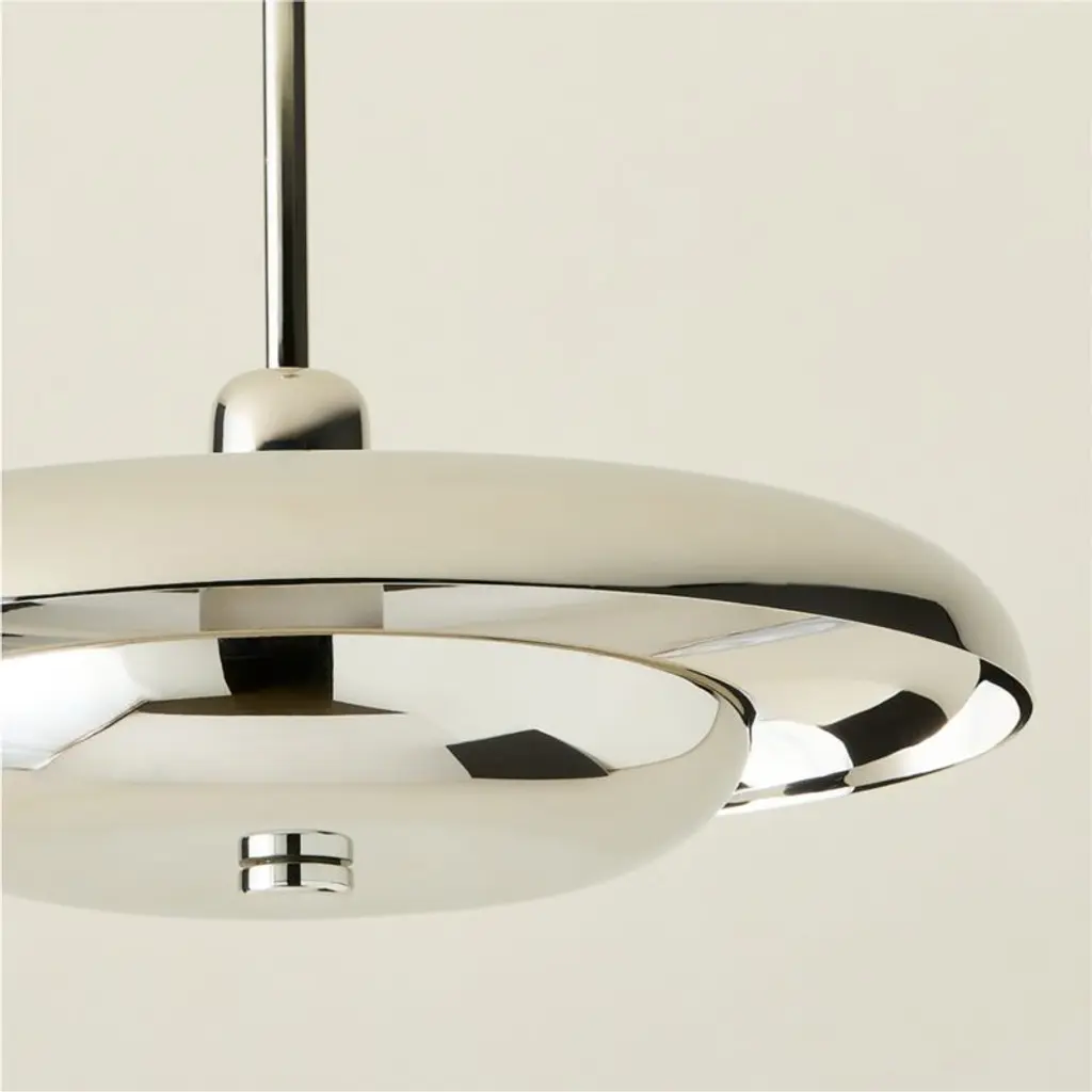 Striking nickel pendant by Los Angeles-based AD100 designer Ross Cassidy embodies modern minimalism. The super-thin shade casts a soft light downward with a smaller diffuser to minimize glare. The nickel finish is unlacquered, offering a living finish that will develop the patina of a vintage find. CB2 exclusive.