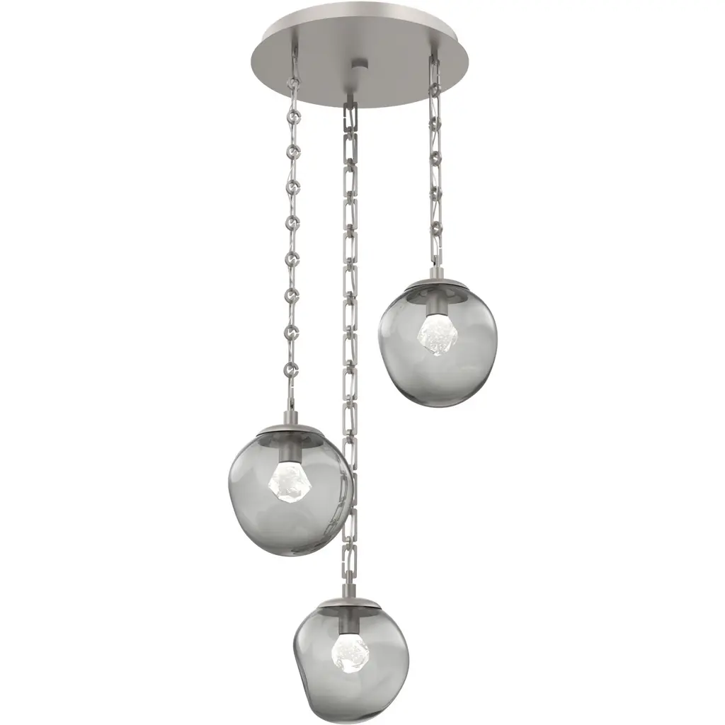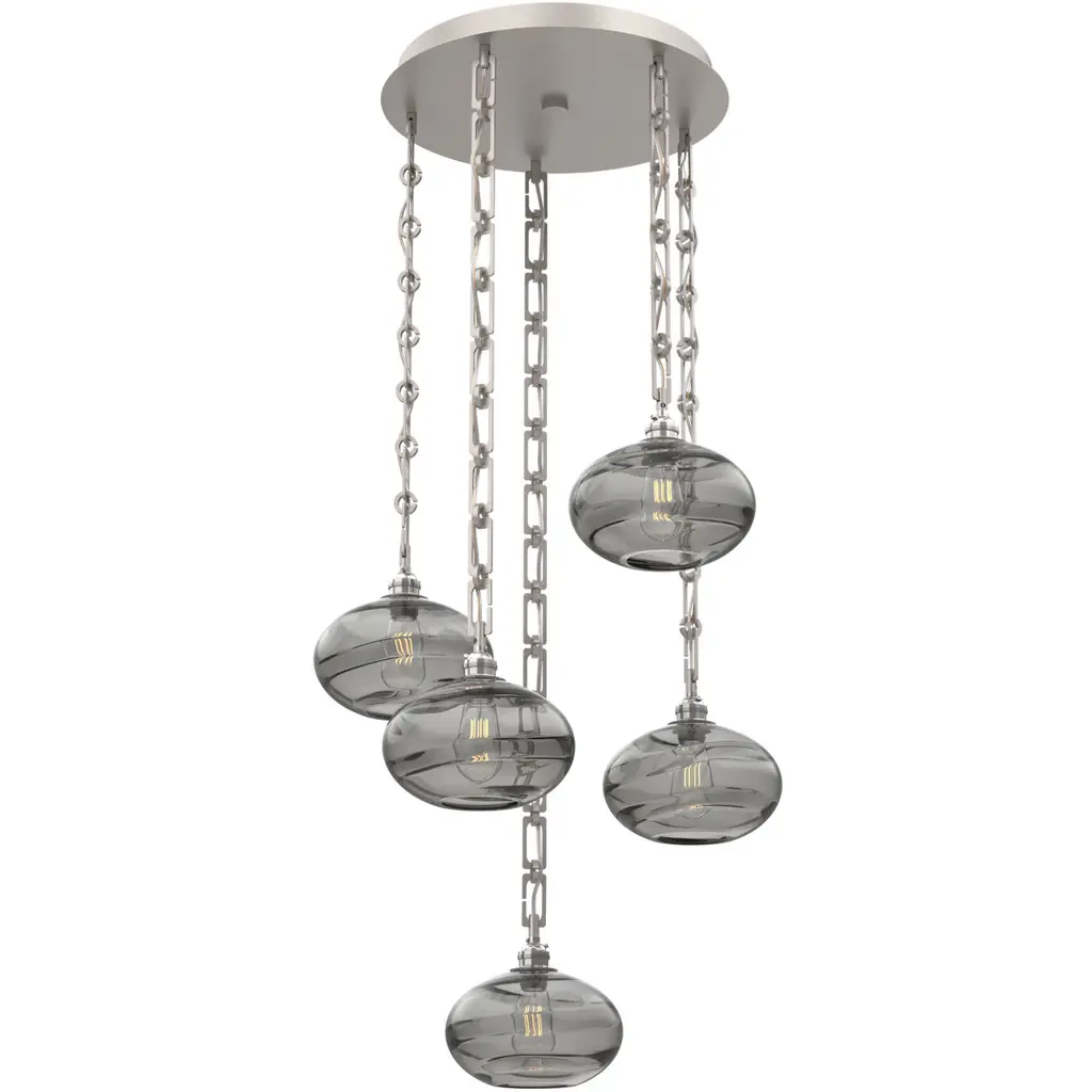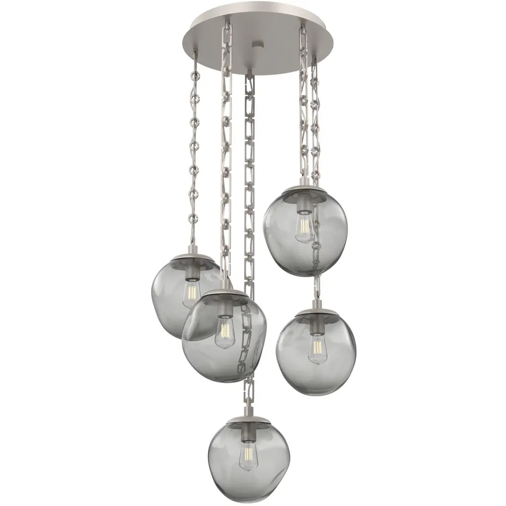 Handcrafted in North America by Hammerton artisans, the Terra Round Multi-pendant Chandelier showcases 5 elegant Terra pendants from hand-blown crystal glass and suspended from a round canopy by your choice of cloth-braided cord or artisan-forged chain. Each blown glass shade is expertly shaped to refract light in captivating ways, especially when paired with vintage-style bulbs. Suspension options include three vintage-inspired chain styles, all designed and crafted with exceptional attention to detail.