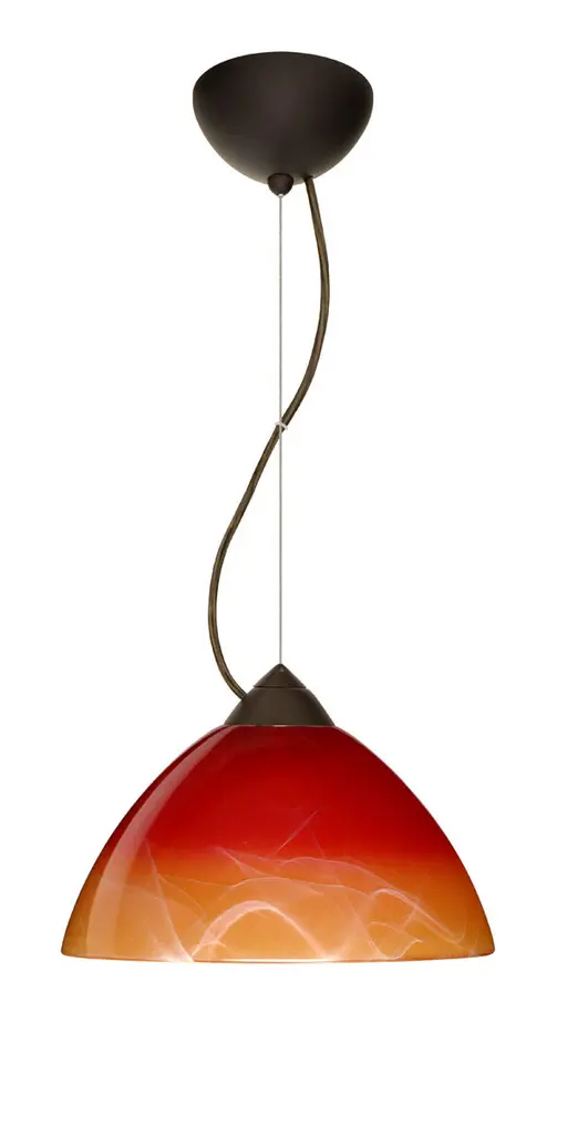 Tessa has a classical bell shape that complements aesthetic, while also built for optimal illumination. Our Solare glass is a pressed glass that features swirls of white throughout clear glass, which then is colored with a translucent mix of red-orange to yellow. This décor is classic and can be used in various ways. When lit this gives off a light that is functional and soothing. The smooth satin finish on the clear outer layer is a result of an extensive etching process. This handcrafted glass uses a process where every glass is consistently produced using a press mold, keeping variations to a minimum. The cable pendant fixture is equipped with a 10' silver aircraft cable and AWM cordset, and a dome monopoint canopy. These stylish and functional luminaries are offered in a beautiful brushed Bronze finish.