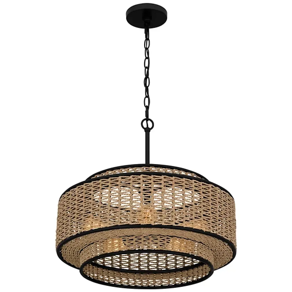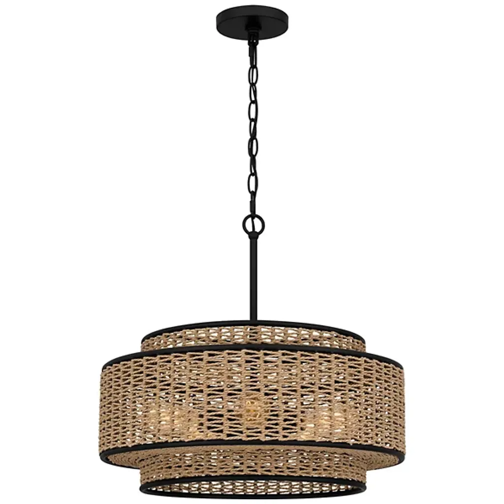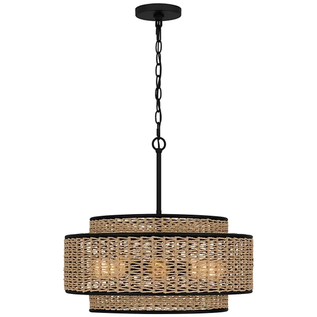 The Teton Pendant from Quoizel brings a touch of global styling and natural charm to any space. A classic drum silhouette with a matte black finish and casual layers, this pendant exudes measured transitional elegance. The natural rope shade sets it apart, adding depth and contrast to the otherwise simple frame and infusing a hint of bohemian flair. The fixture is fashioned from steel with a rope shade woven into a repeating angular pattern, blending transitional and bohemian styles, making it a versatile and visually appealing addition to any interior décor design.