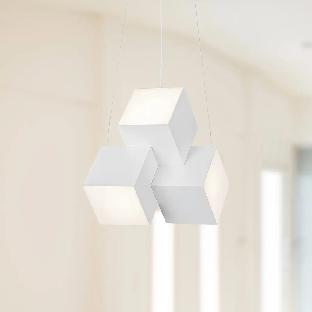 Tetra is an avant-garde pendant light born from the collaboration between Kuzco and Curves by Sean Brown. Inspired by UFO aesthetics, Tetra boasts a striking cube silhouette that adds a touch of otherworldly charm to any space. Available in sleek chrome or pristine white finishes.