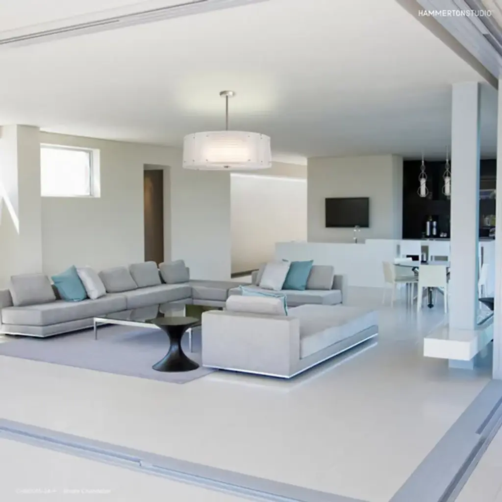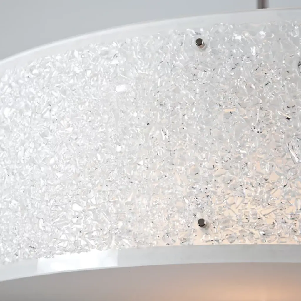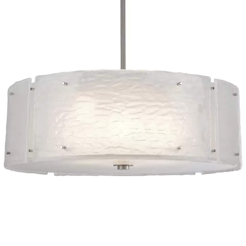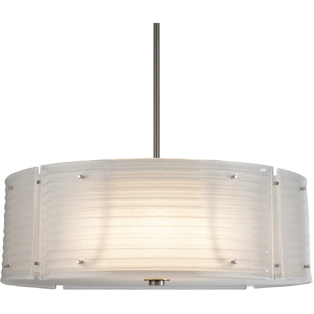 The Textured Glass Drum Pendant by Hammerton Studio combines modern and minimal forms with artisan materials. Made by skilled craftsman in a studio in Salt Lake City, Utah, each glass panel requires two kiln passes to achieve its unique texture and appeal. The glass is held in place with visible hardware, giving it a subtle industrial appeal.