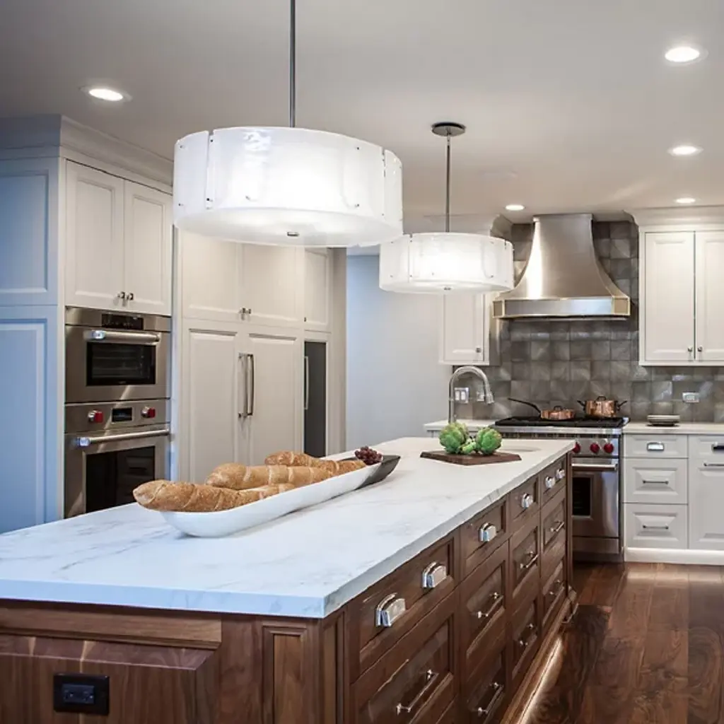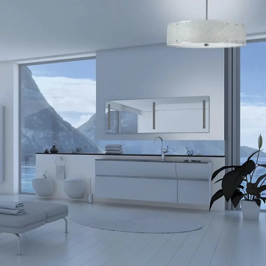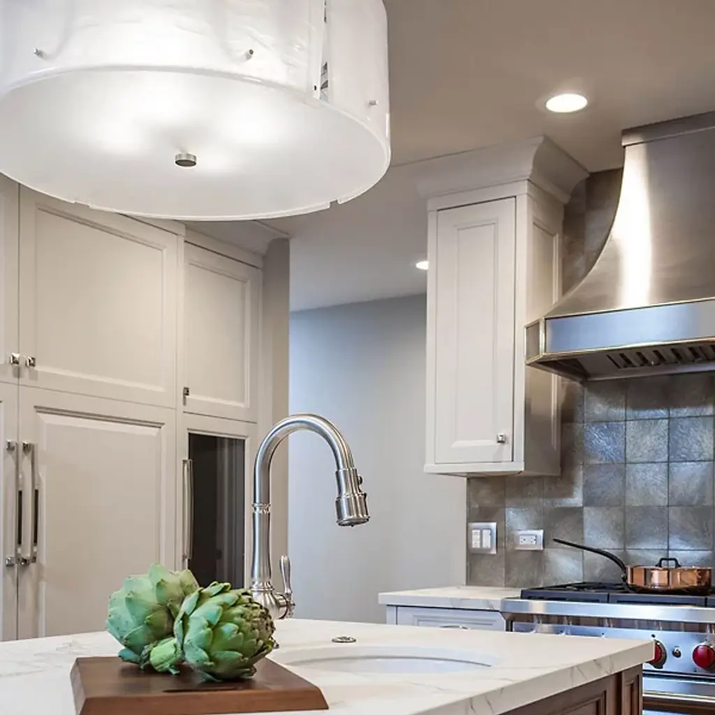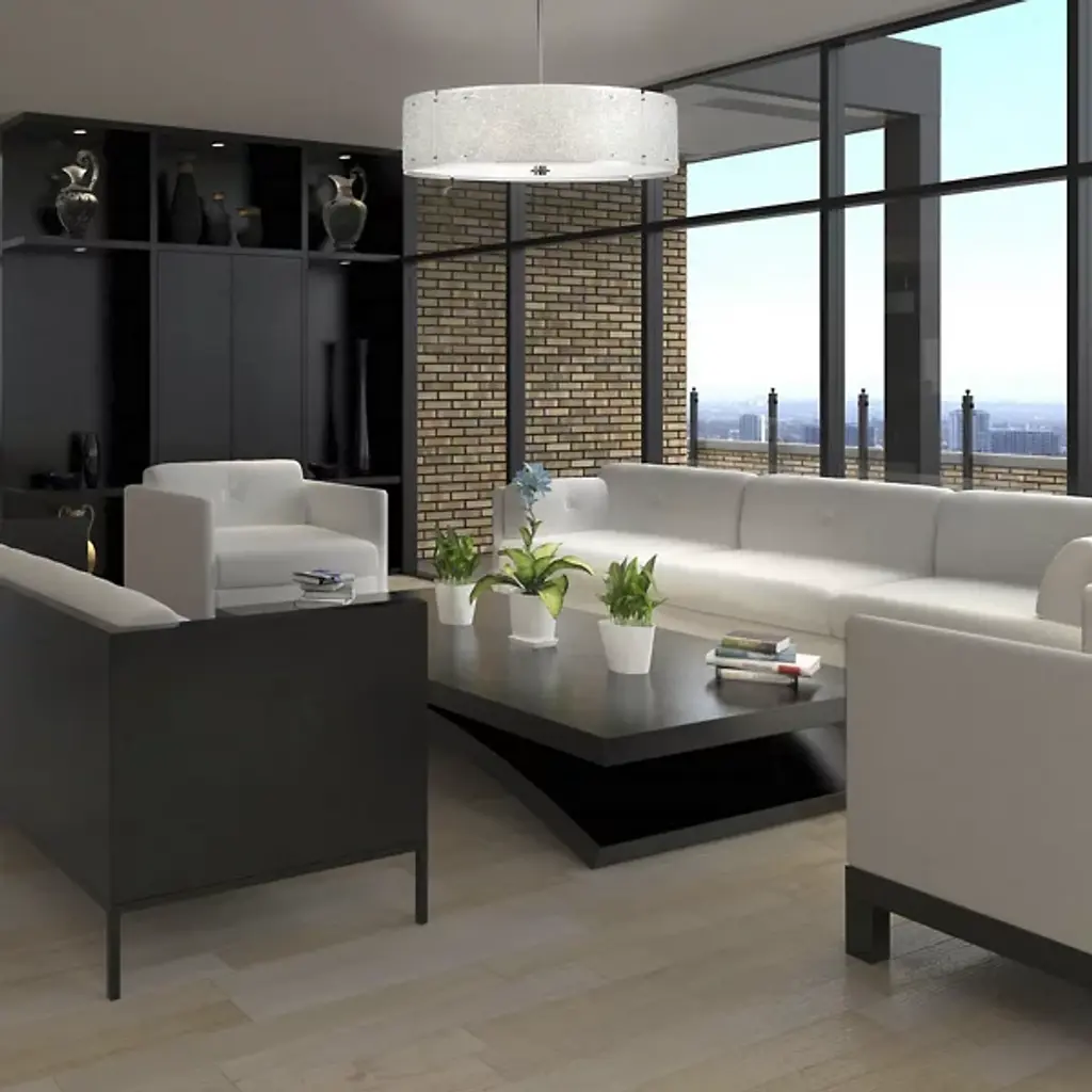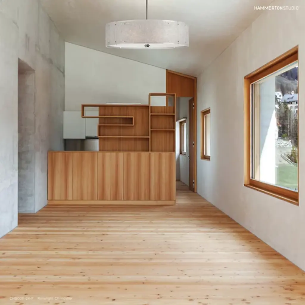 The Textured Glass Drum Pendant by Hammerton Studio combines modern and minimal forms with artisan materials. Made by skilled craftsman in a studio in Salt Lake City, Utah, each glass panel requires two kiln passes to achieve its unique texture and appeal. The glass is held in place with visible hardware, giving it a subtle industrial appeal.