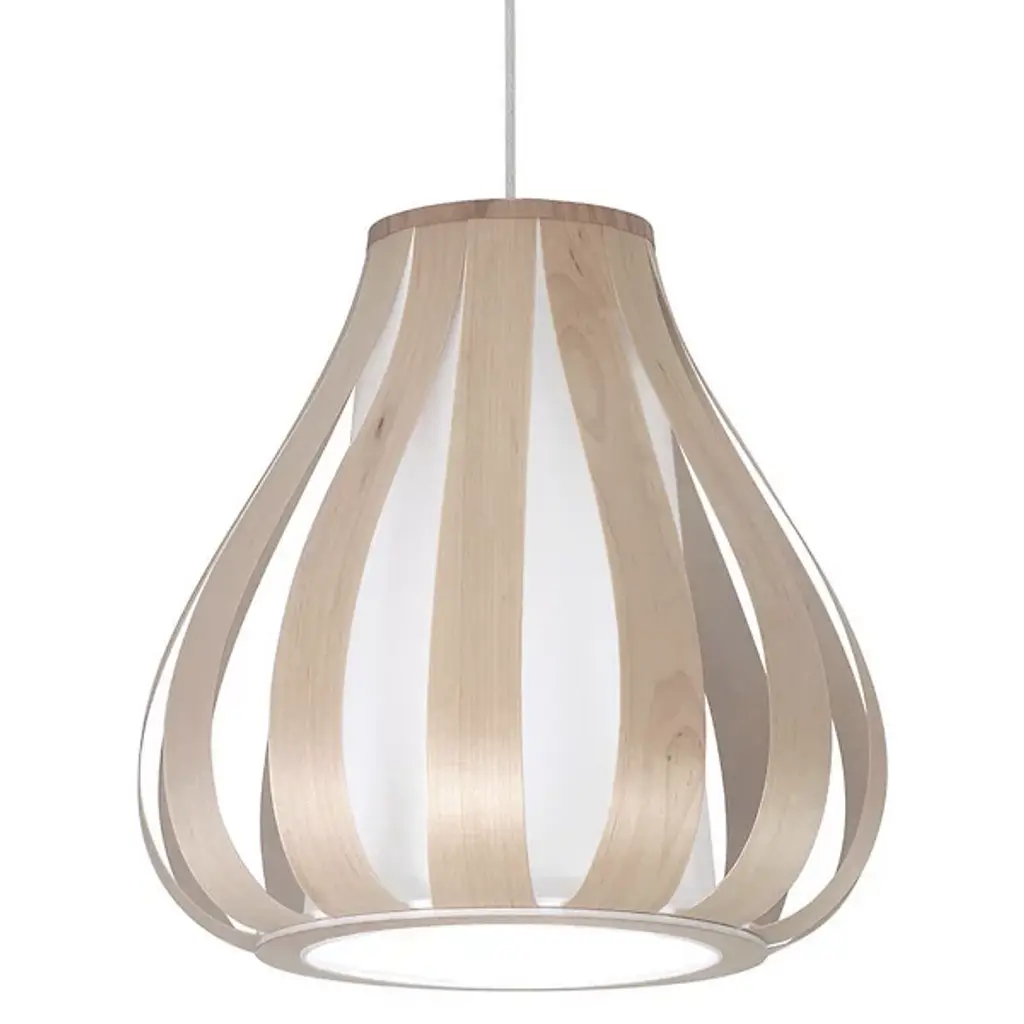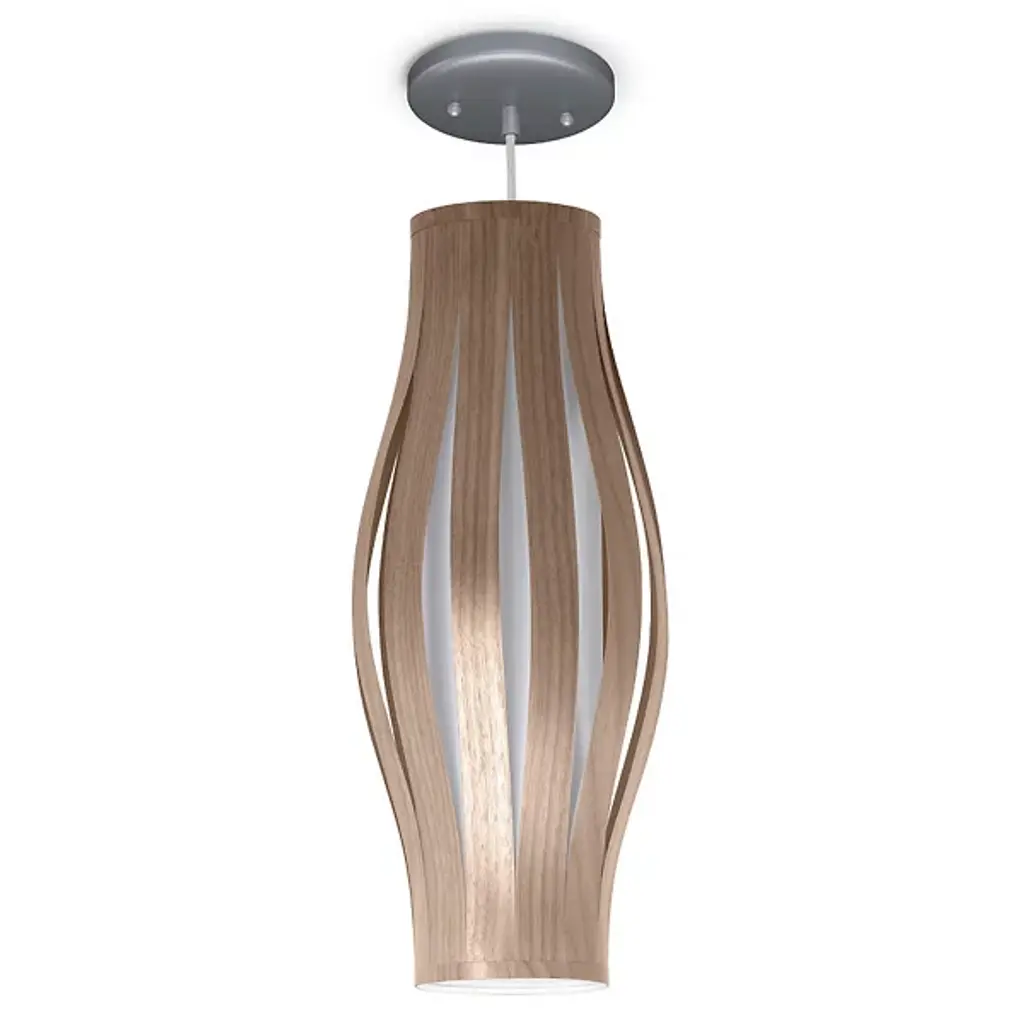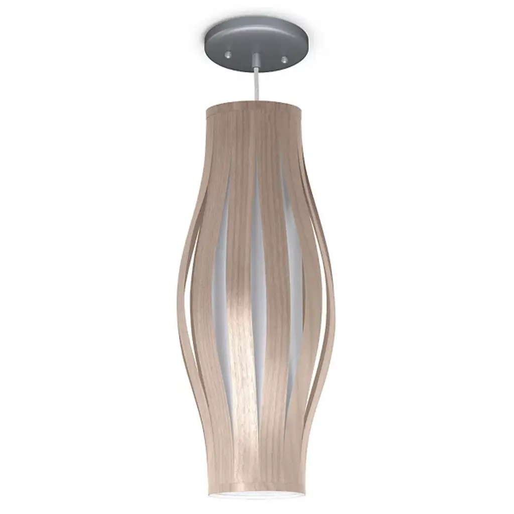 The Theo Pendant from Seascape Lamps highlights the interplay of two different materials through a cylindrical form with a subtle flare at its center. Handmade in California, the design features wood veneer slats that arc around a central diffuser, creating a layered shade that surrounds efficient LED lamping. The inner diffuser softens bright light, casting both a warm glow outward and a focused beam of light below. The alternating ribbons of veneer and fabric introduce vertical shadow accents, emphasizing thoughtful use of simple materials.