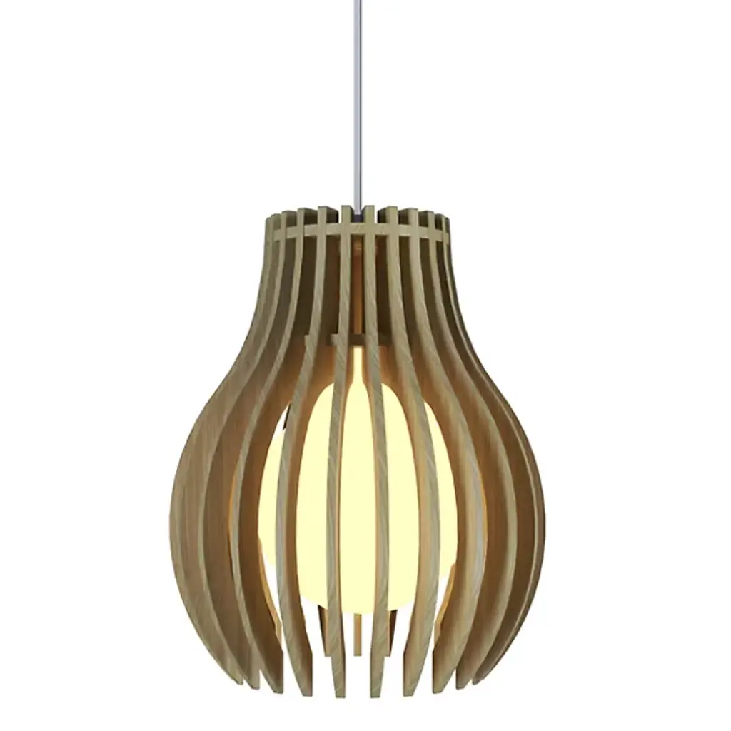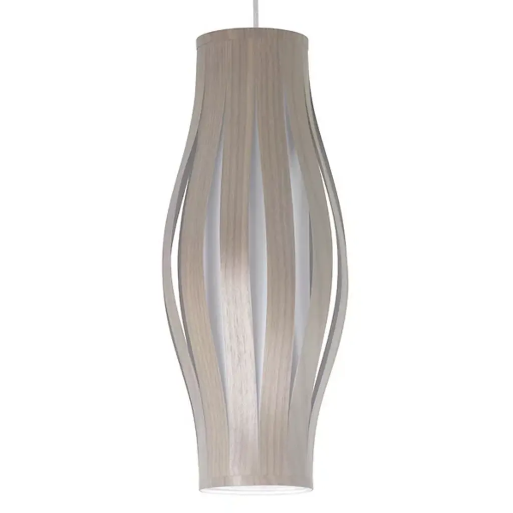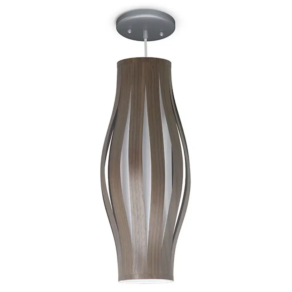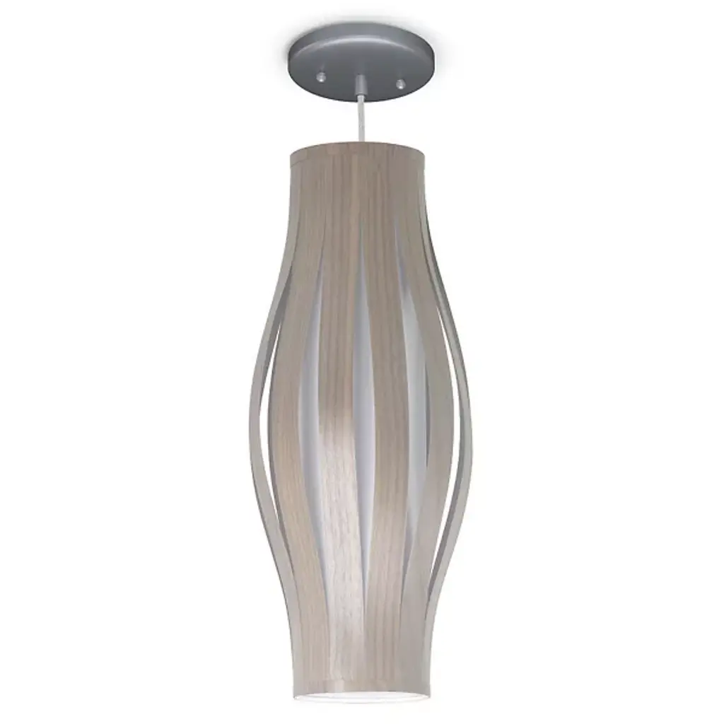 The Theo Pendant from Seascape Lamps highlights the interplay of two different materials through a cylindrical form with a subtle flare at its center. Handmade in California, the design features wood veneer slats that arc around a central diffuser, creating a layered shade that surrounds efficient LED lamping. The inner diffuser softens bright light, casting both a warm glow outward and a focused beam of light below. The alternating ribbons of veneer and fabric introduce vertical shadow accents, emphasizing thoughtful use of simple materials.
