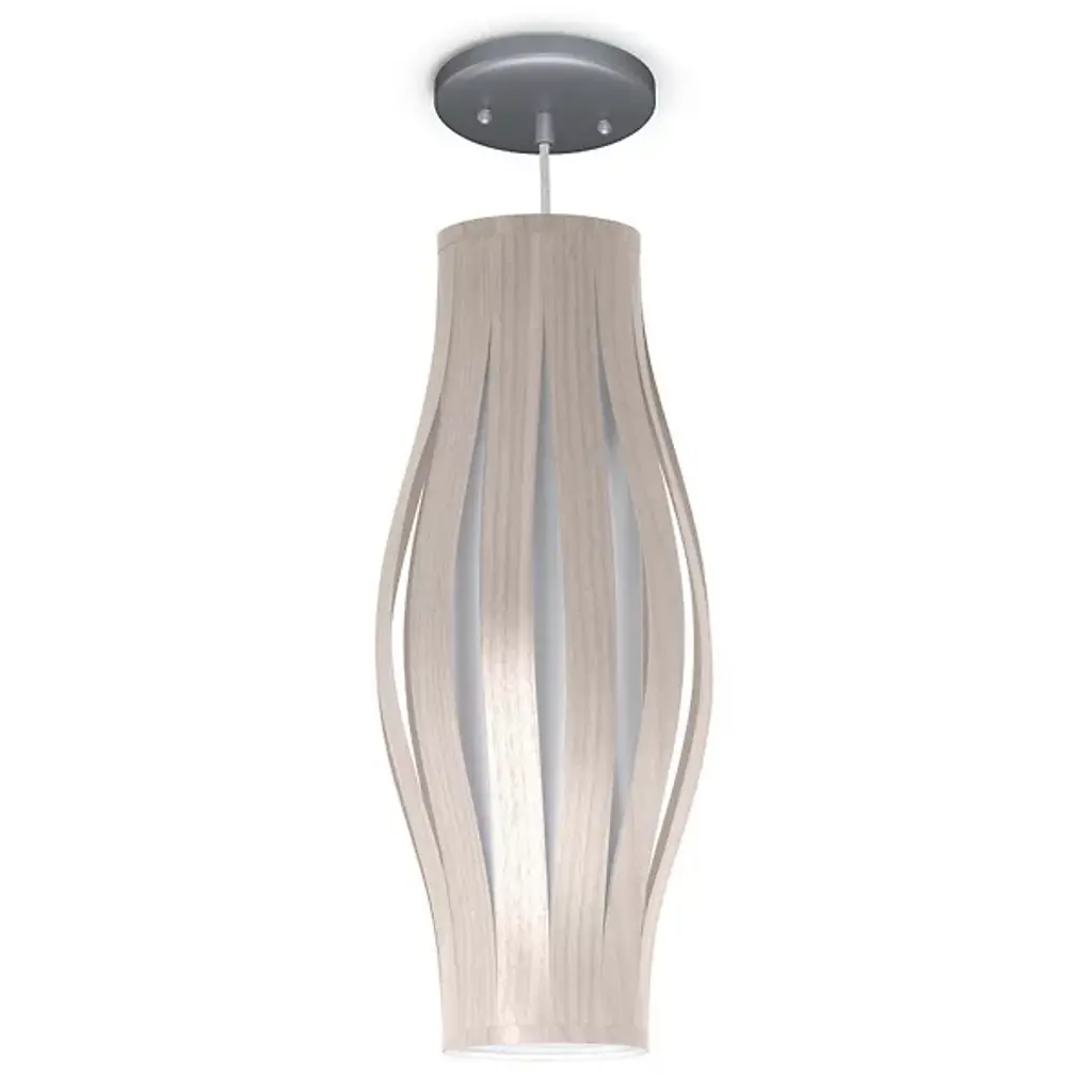The Theo Pendant from Seascape Lamps highlights the interplay of two different materials through a cylindrical form with a subtle flare at its center. Handmade in California, the design features wood veneer slats that arc around a central diffuser, creating a layered shade that surrounds efficient LED lamping. The inner diffuser softens bright light, casting both a warm glow outward and a focused beam of light below. The alternating ribbons of veneer and fabric introduce vertical shadow accents, emphasizing thoughtful use of simple materials.