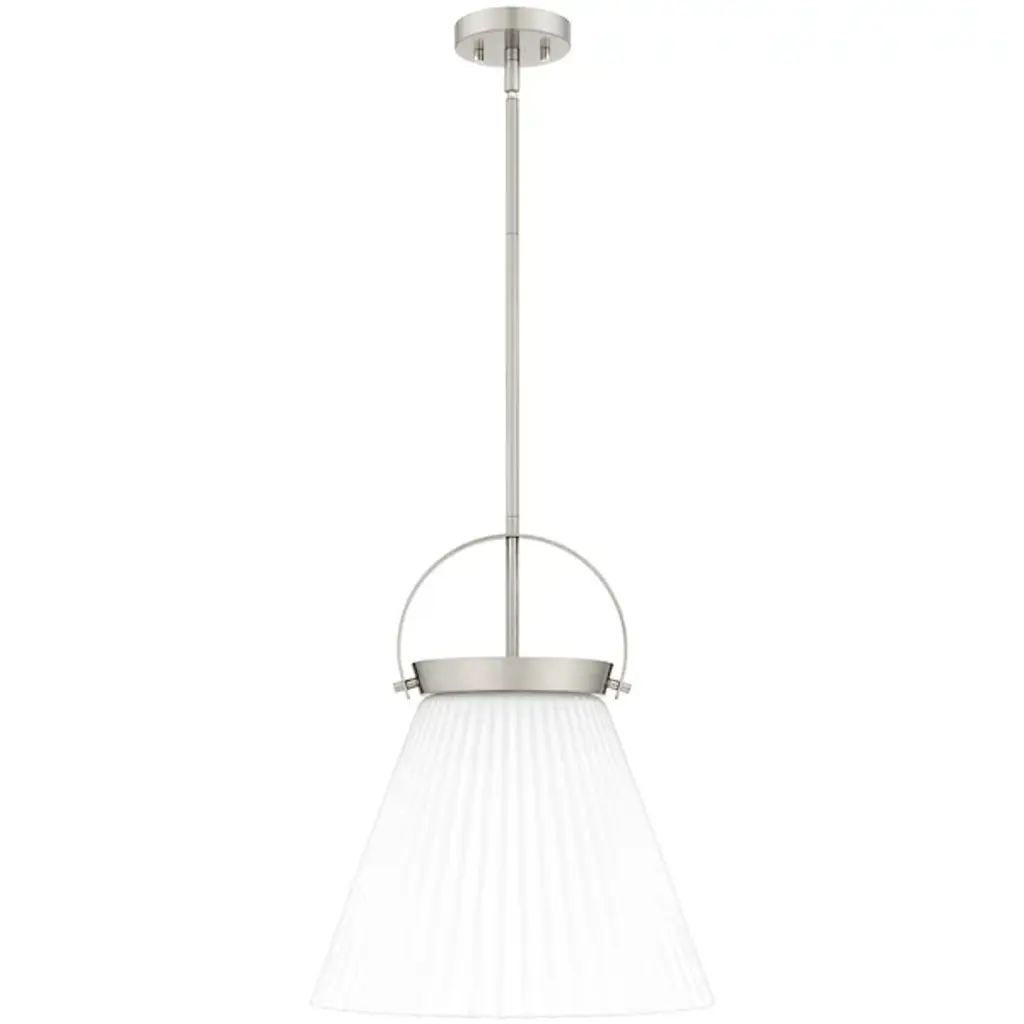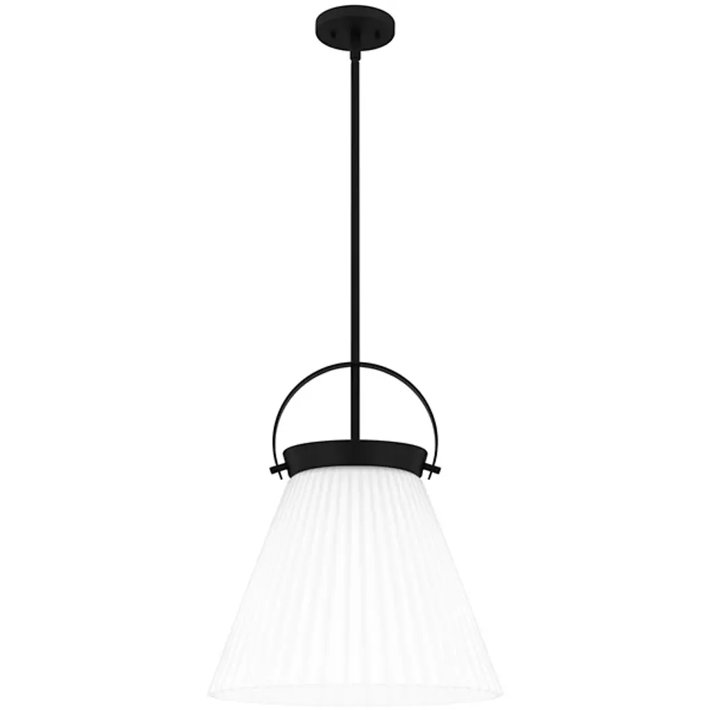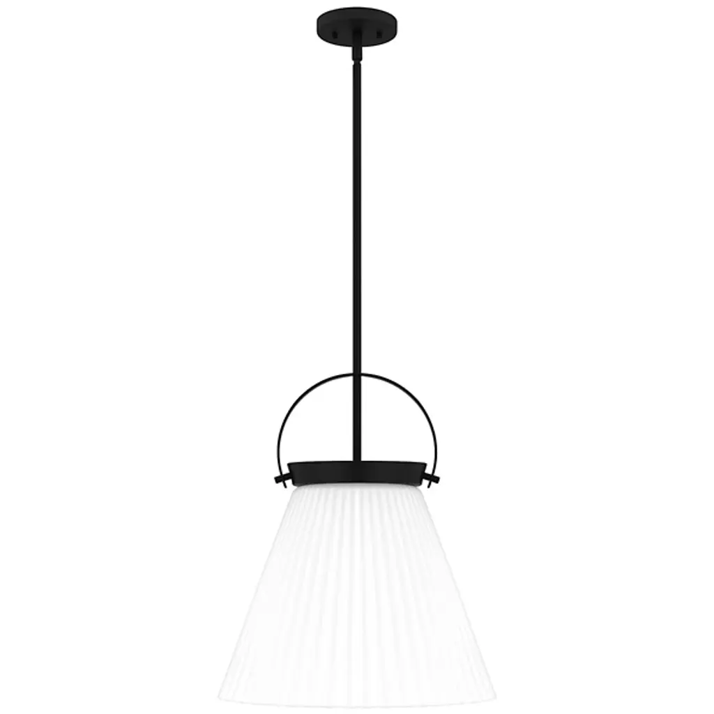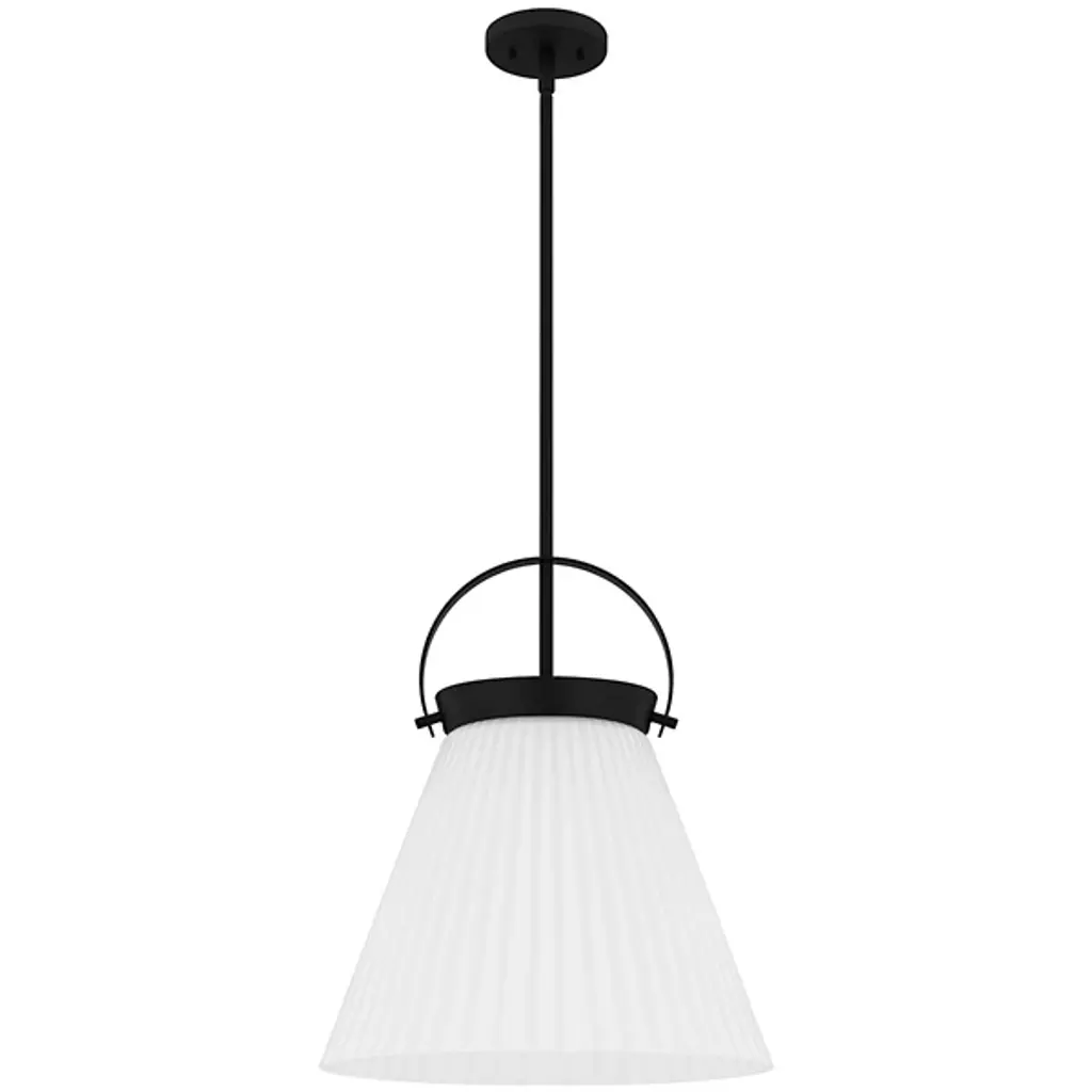The Thibault Pendant from Quoizel is a lovely complement to a variety of transitional spaces. This pendant boasts minimalist details and a distinctive white ribbed glass shade that adds charm to your décor. The white glass shade features a ribbed design, creating a pleated effect that beautifully softens the illumination. It is crafted from durable steel. Illuminate your room with the warm glow of LED light from above, creating a welcoming ambiance. Thibault is secured by a downrod and ceiling canopy.