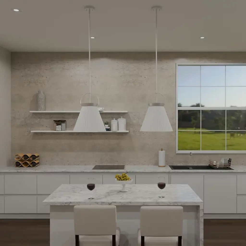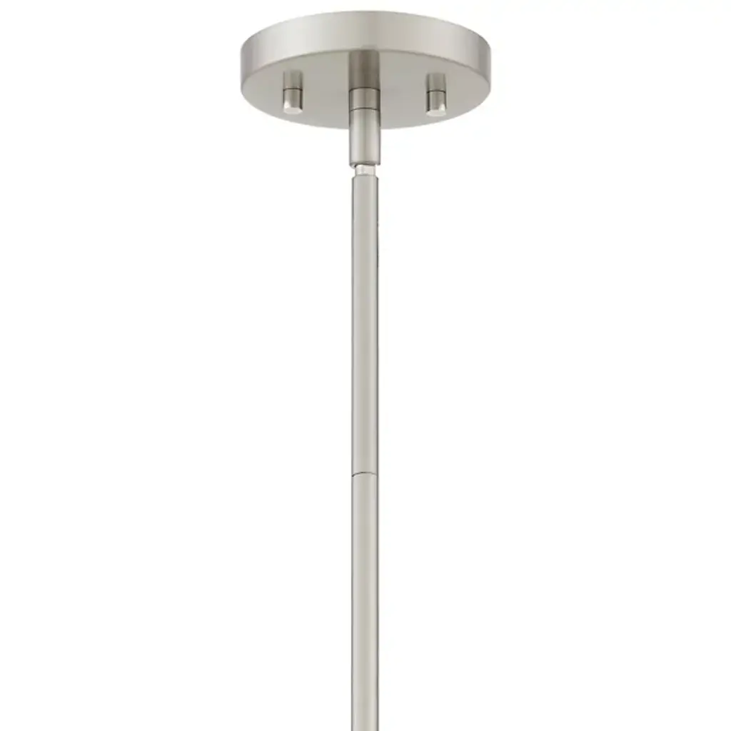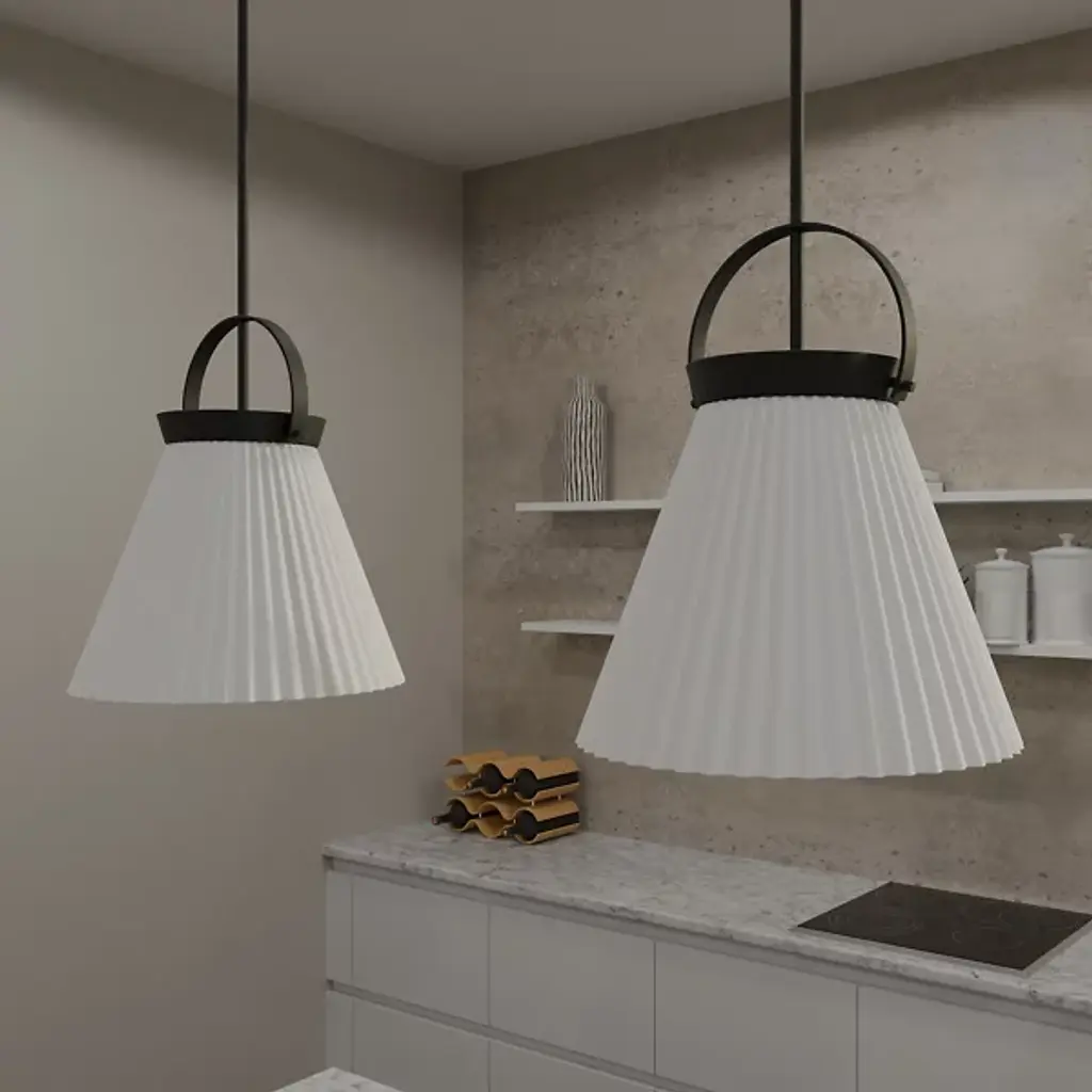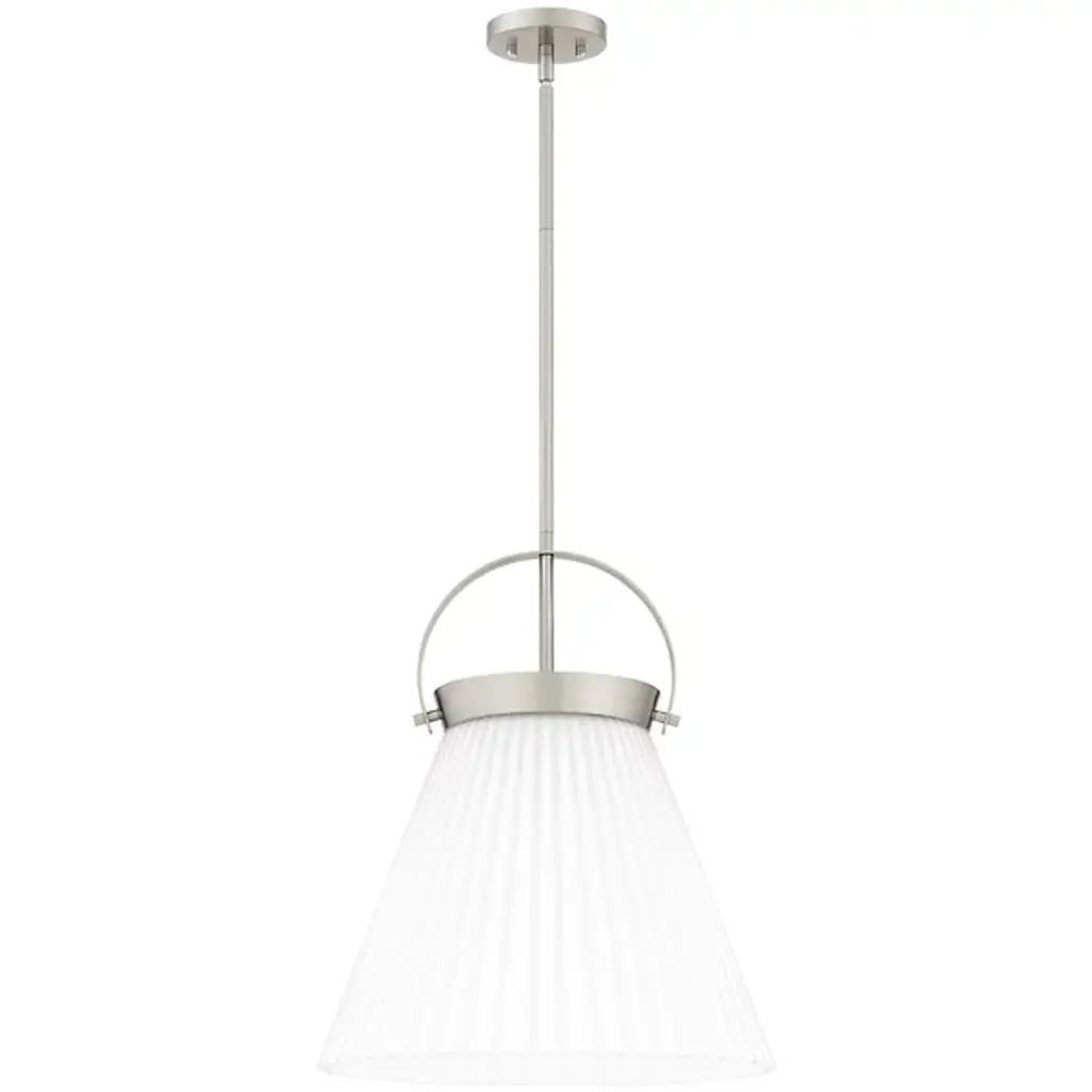 The Thibault Pendant from Quoizel is a lovely complement to a variety of transitional spaces. This pendant boasts minimalist details and a distinctive white ribbed glass shade that adds charm to your décor. The white glass shade features a ribbed design, creating a pleated effect that beautifully softens the illumination. It is crafted from durable steel. Illuminate your room with the warm glow of LED light from above, creating a welcoming ambiance. Thibault is secured by a downrod and ceiling canopy.
