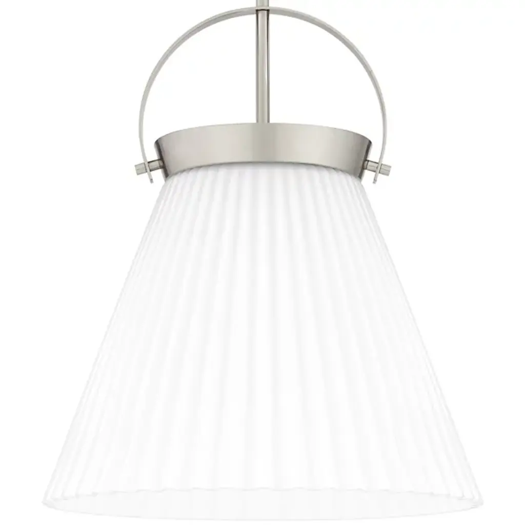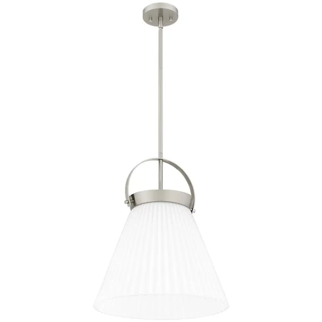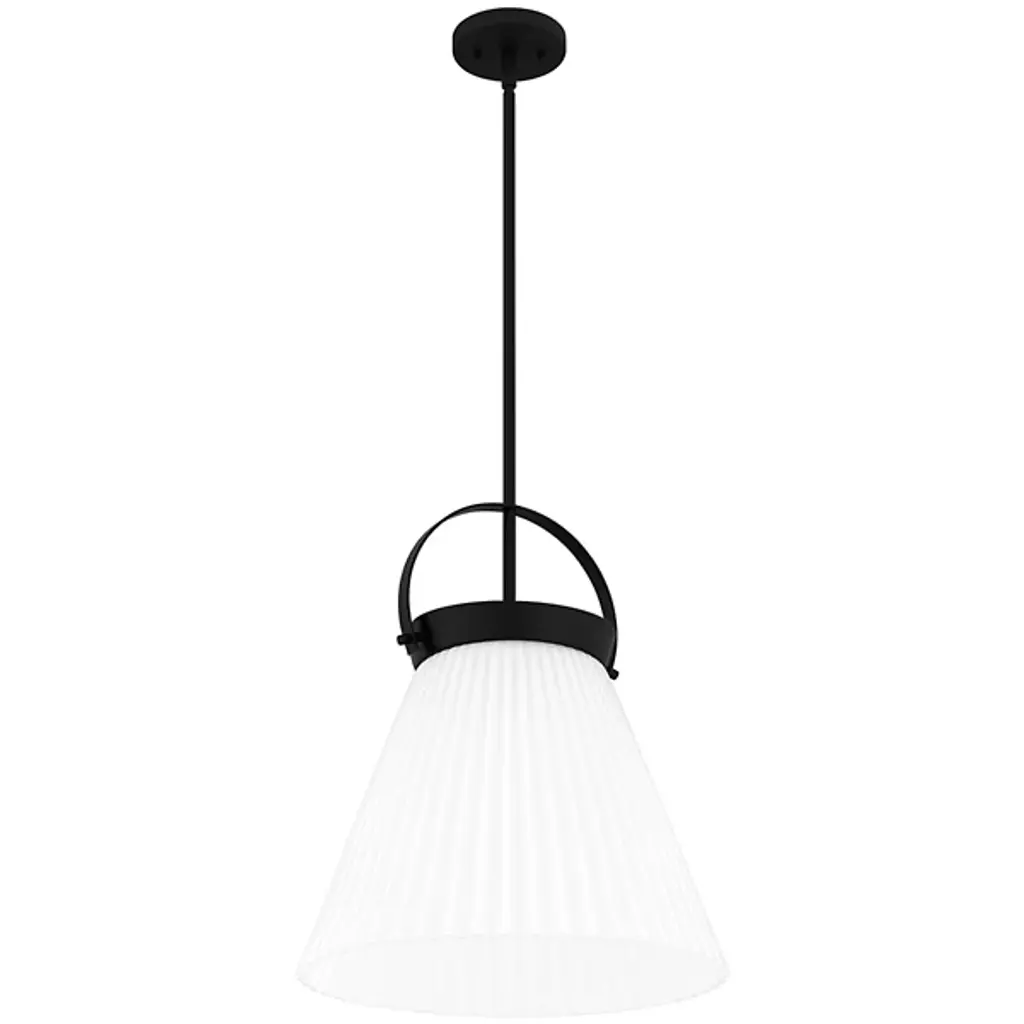 The Thibault Pendant from Quoizel is a lovely complement to a variety of transitional spaces. This pendant boasts minimalist details and a distinctive white ribbed glass shade that adds charm to your décor. The white glass shade features a ribbed design, creating a pleated effect that beautifully softens the illumination. It is crafted from durable steel. Illuminate your room with the warm glow of LED light from above, creating a welcoming ambiance. Thibault is secured by a downrod and ceiling canopy.