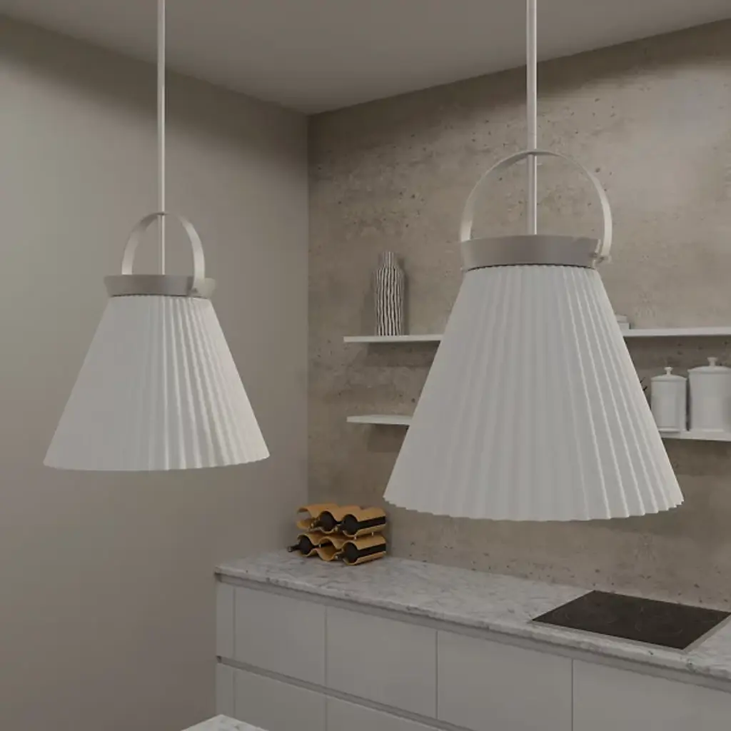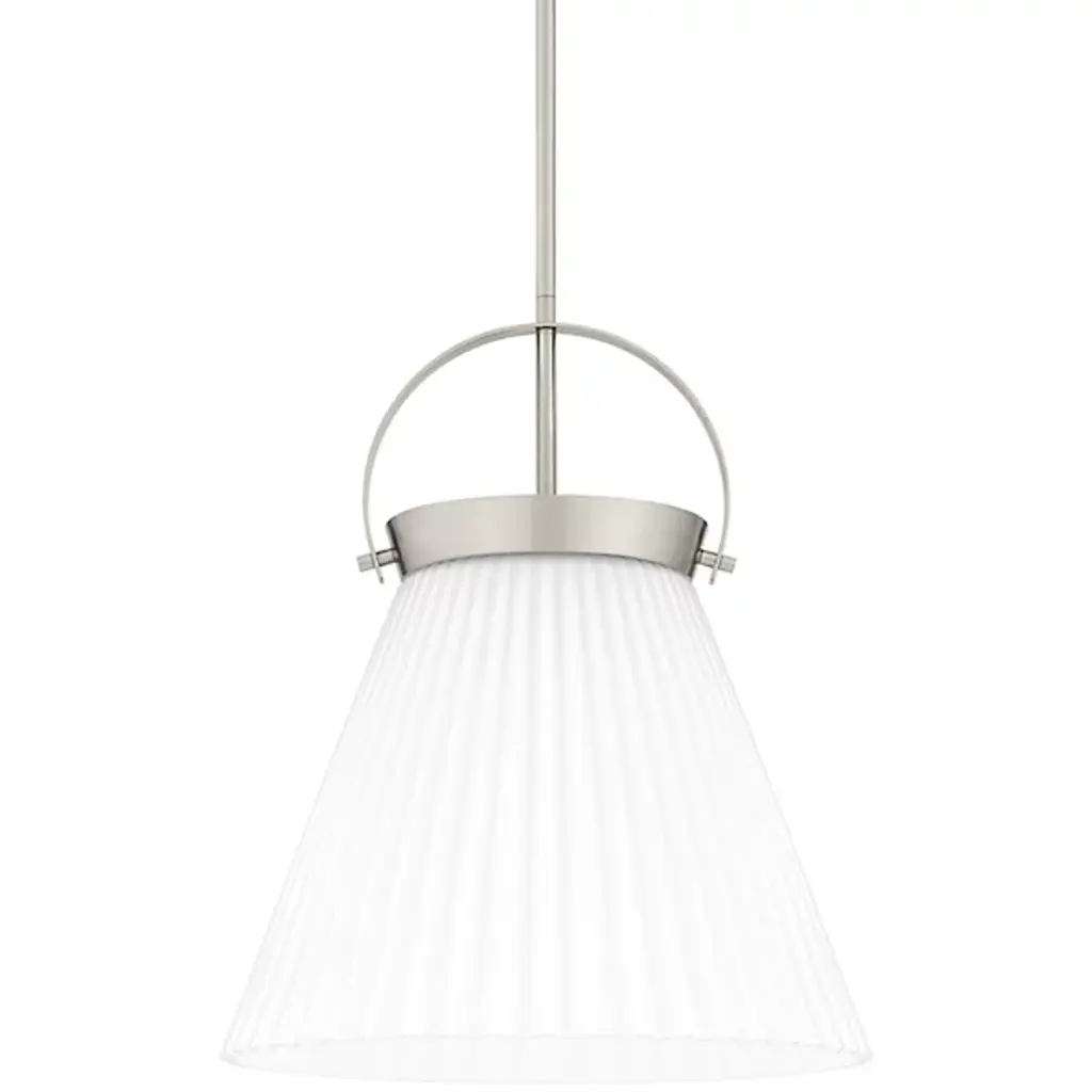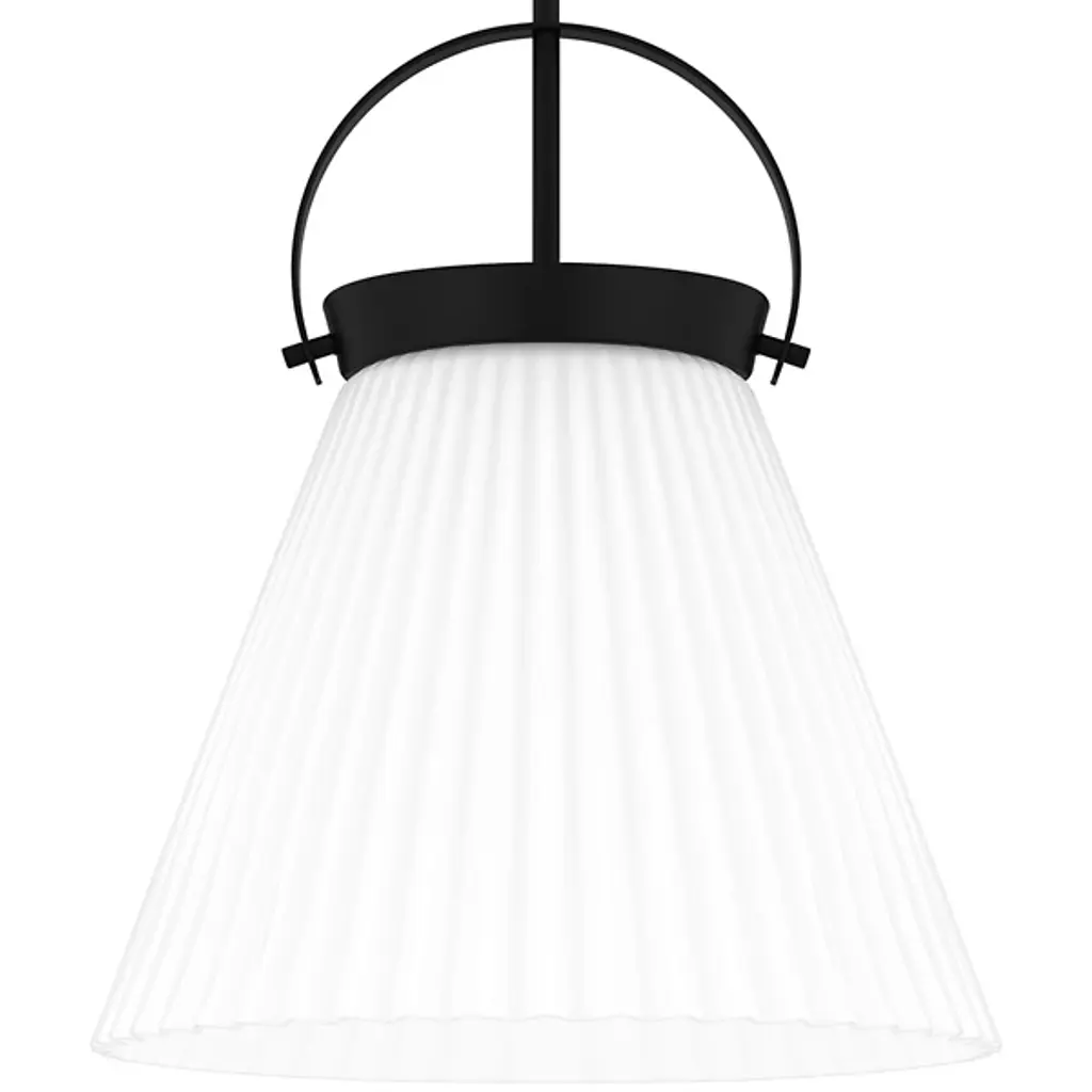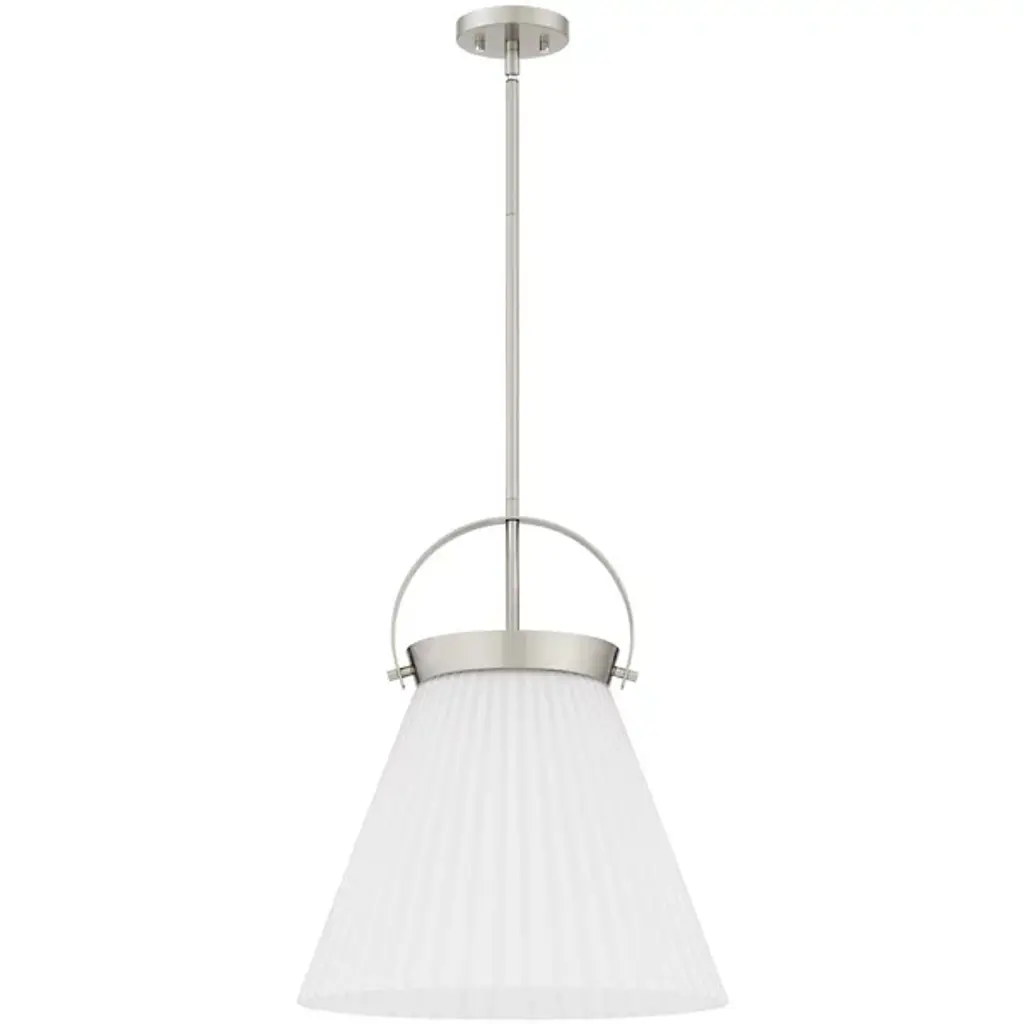 The Thibault Pendant from Quoizel is a lovely complement to a variety of transitional spaces. This pendant boasts minimalist details and a distinctive white ribbed glass shade that adds charm to your décor. The white glass shade features a ribbed design, creating a pleated effect that beautifully softens the illumination. It is crafted from durable steel. Illuminate your room with the warm glow of LED light from above, creating a welcoming ambiance. Thibault is secured by a downrod and ceiling canopy.