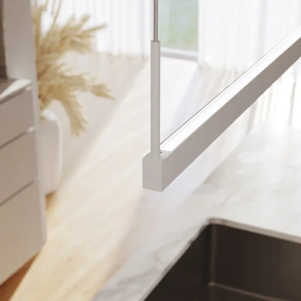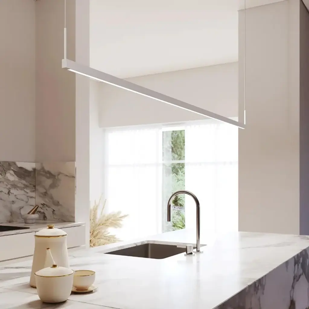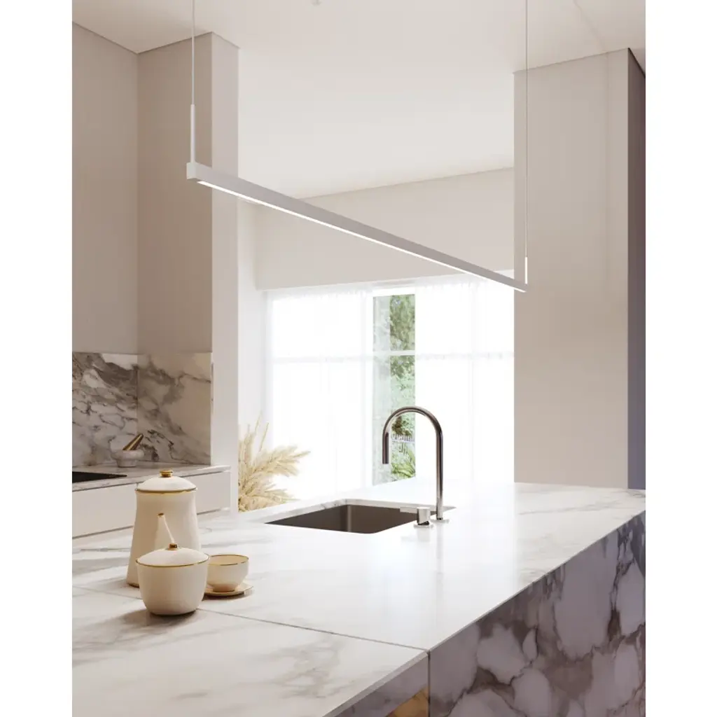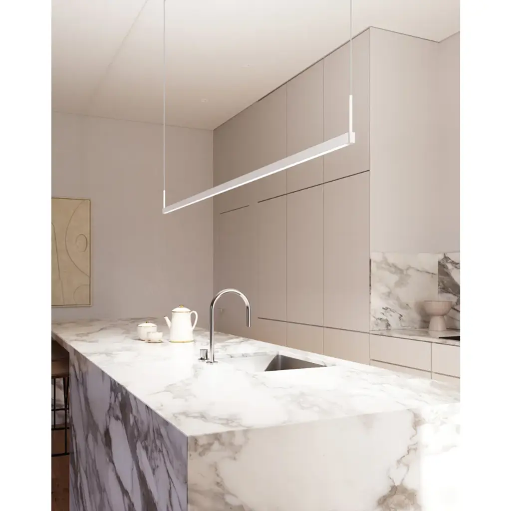 A system of minimally scaled LED linear pendants, uplight/downlight wall bars, and indirect light wall bars, Thin-Line is offered in a variety of lengths, finishes, and lighting configurations. Thin-Line pendants are available in single- and double-sided configurations; the single-sided configurations can be installed as a downlight or up-light, providing direct or indirect illumination. Our Optional Mini Box Canopy is also available for the Thin-Line LED Pendant.