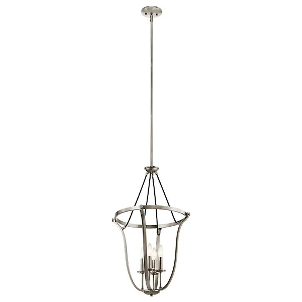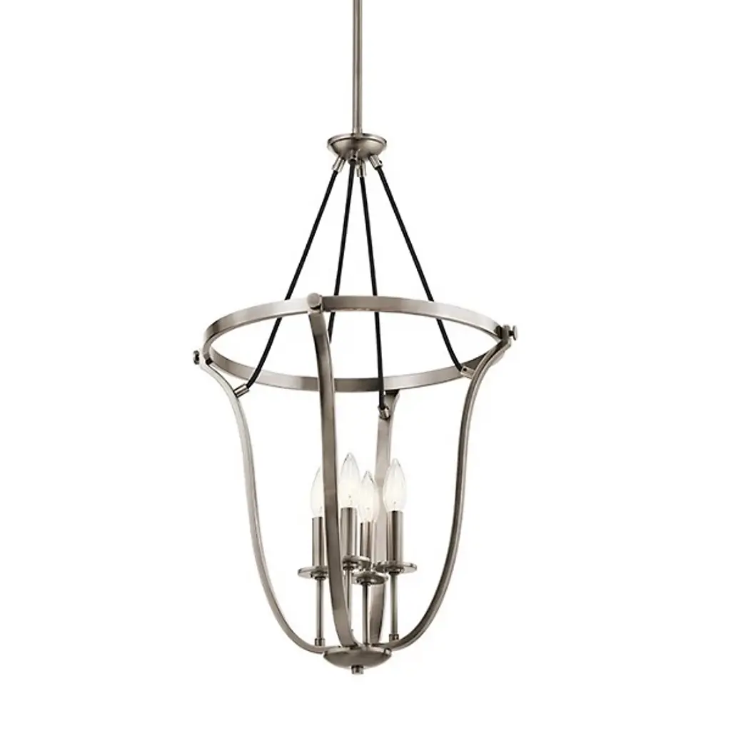 A devastatingly handsome piece. Thisbe Pendant from Kichler stands out in its graceful curves, culminating into a lovely silhouette of an inverted bell. Adding a sophisticated modern punch to the metal framework are strands of fabric wire, that falls from the top body in diagonals dripping with crafted texture. The structure is exhibited with long sweeping curves characterized by a subdued s-curve. A grouping of lamp holders sits neatly at the center, with candelabra bulbs they come together to create a traditional silhouette and an evocative glow.
