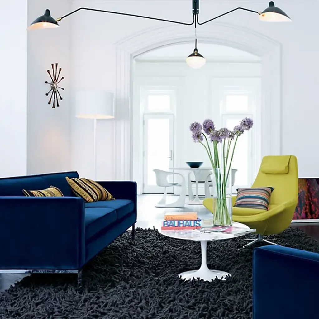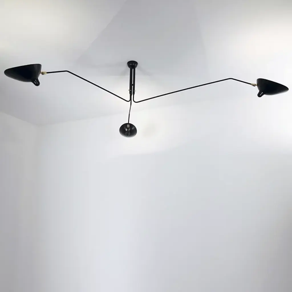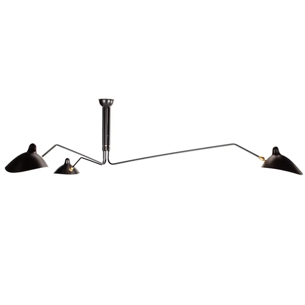 The iconic design of the Three Arm Multi-Light Pendant by Serge Mouille lends a striking presence in a modern home. Designed in 1958, this piece was inspired by the delicate and expressive silhouette of a stick bug—its minimal silhouette standing in sharp contrast to the heavy aesthetic of popular Italian fixtures of its time. Its dome canopy is small in relation to the widespread read of its slender arms, each one ending at an elegantly crafted shade. The arms angle softly to focus their attention downward, while brass joints allow full movement of the shades for a range of lighting displays.