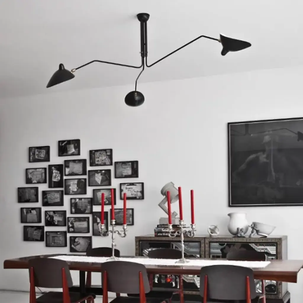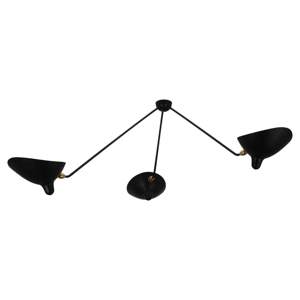 The iconic design of the Three Arm Multi-Light Pendant by Serge Mouille lends a striking presence in a modern home. Designed in 1958, this piece was inspired by the delicate and expressive silhouette of a stick bug—its minimal silhouette standing in sharp contrast to the heavy aesthetic of popular Italian fixtures of its time. Its dome canopy is small in relation to the widespread read of its slender arms, each one ending at an elegantly crafted shade. The arms angle softly to focus their attention downward, while brass joints allow full movement of the shades for a range of lighting displays.