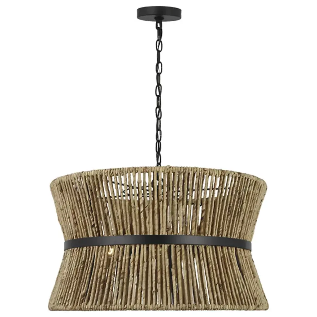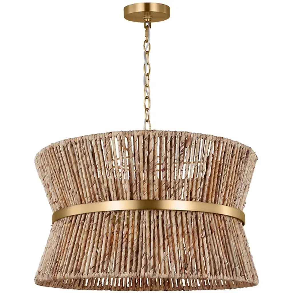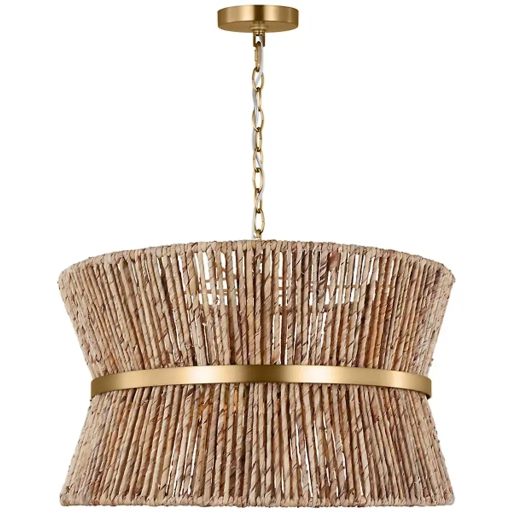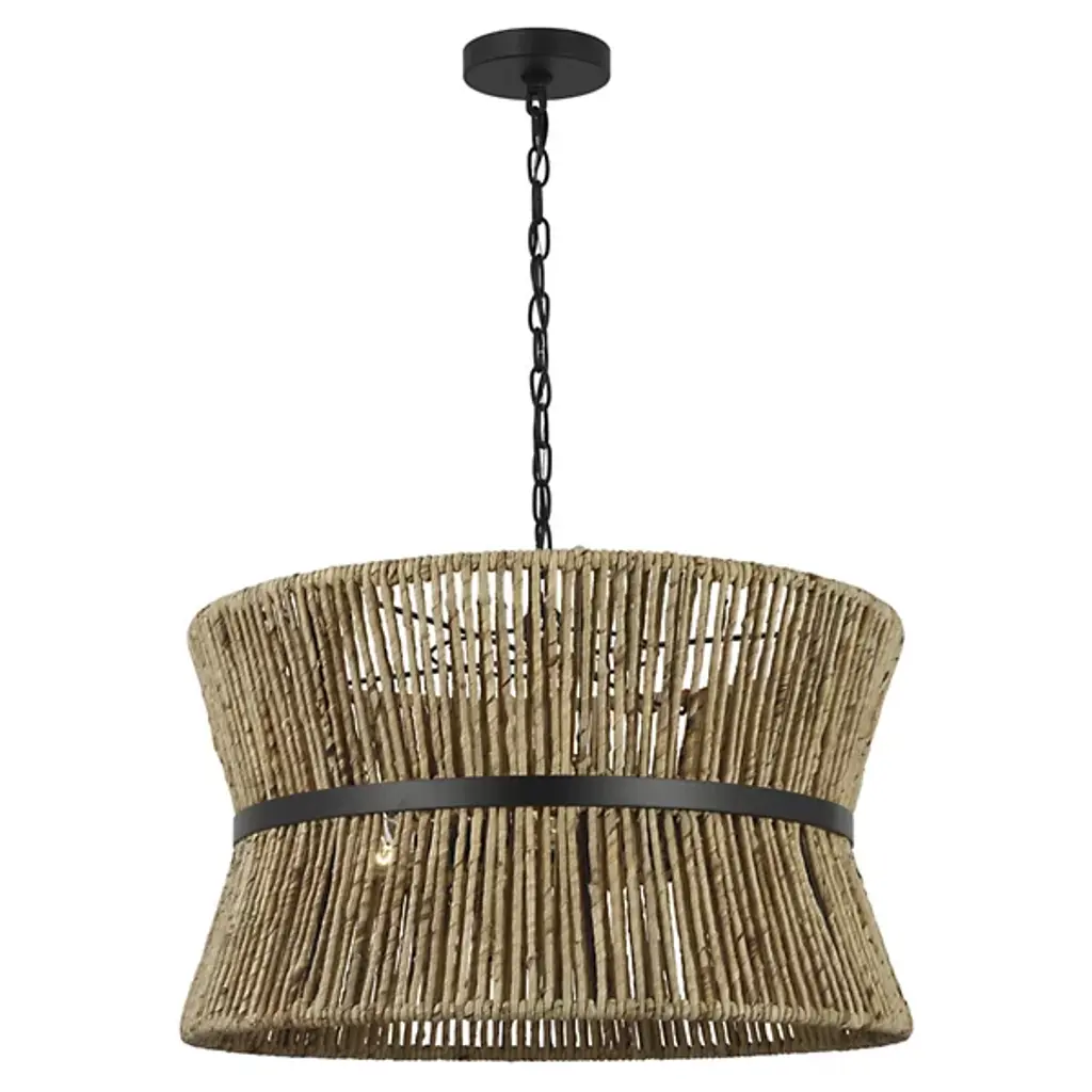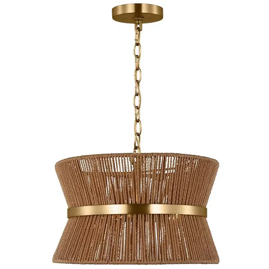 Lend an intricate appeal to inside ceilings with the Thurlo Pendant from Visual Comfort Studio. A clean-surfaced circular canopy extends a fine chain downward to strong lamping placed beneath an hourglass shade of vertically-arranged paper rope. A horizontal metal hoop wraps the center of the shade, confining the rope strands and angling them inward. The vertical rope extends a mix of warm ambiance around direct downlight, creating a stylish bohemian character.